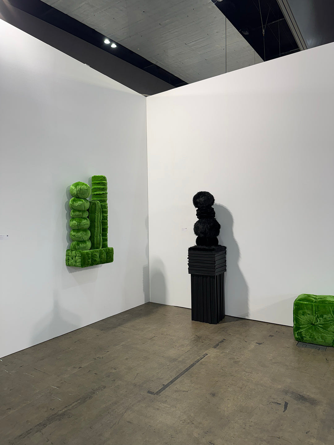 The green fur was initially created for the Bella commission at the Museum of Contemporary Art in Sydney in 2015, as part of the Koala Room, designed for children with disabilities to engage with art through play. Temin sought a green that referenced idealized grass or flooring, drawing inspiration from the luxurious Prada green velvet seats in their stores. She aimed for a vibrant, animated tone to complement the room’s sky blue hues. In contrast, the black fur used in her My Monument works evokes themes of mourning, remembrance, beauty, and contemplation. Temin’s work often brings together opposing ideas, such as remembrance and play, blending the outside world with the inside. The green and black prints reflect this balance, offering a striking visual dialogue that invites viewers into a space of reflection and engagement.