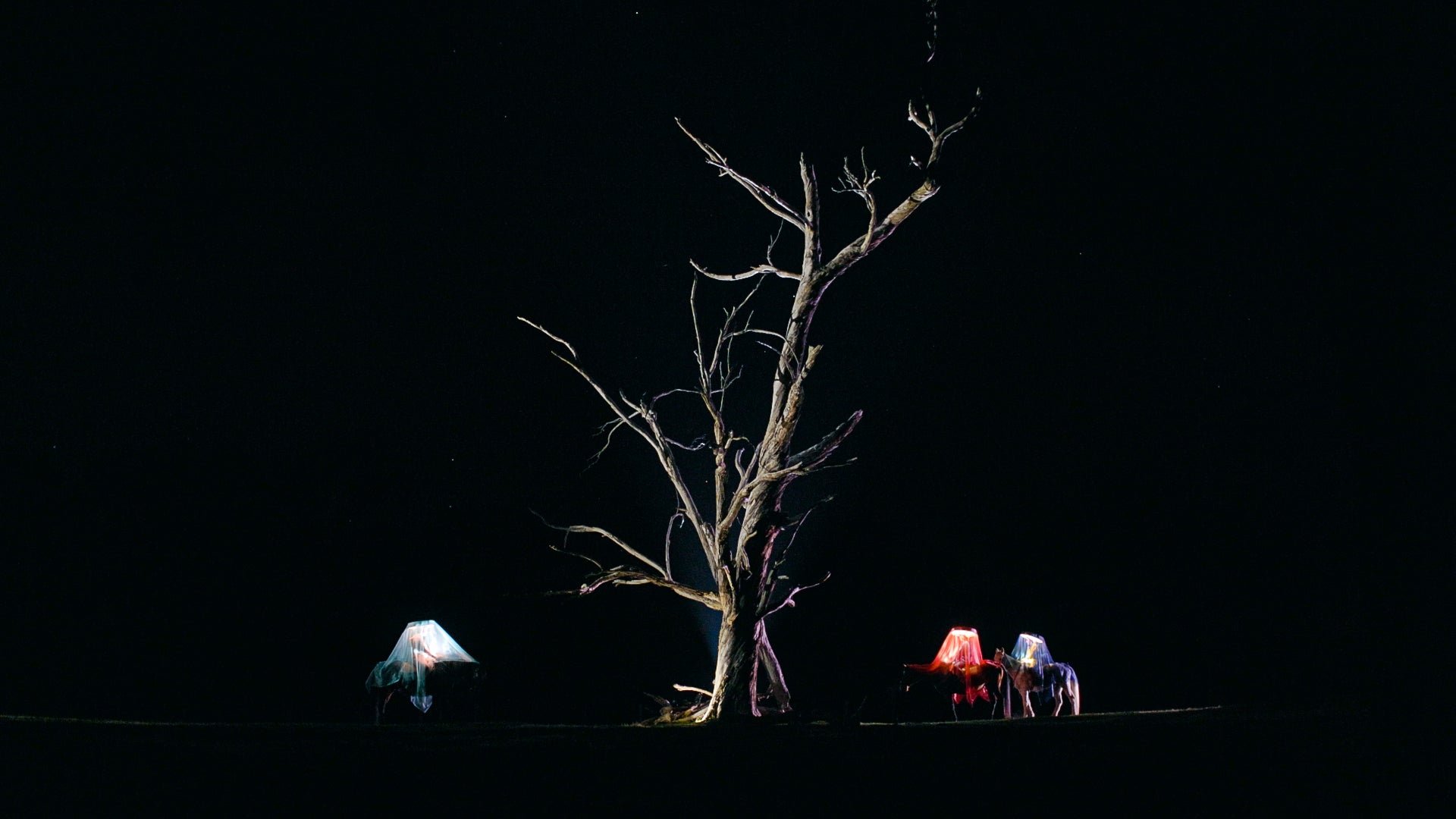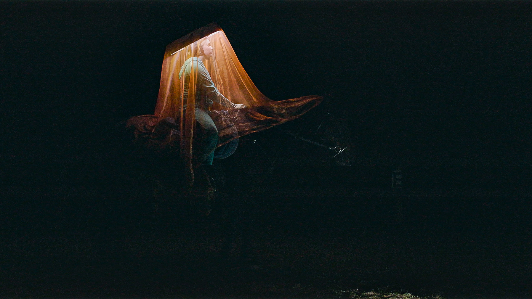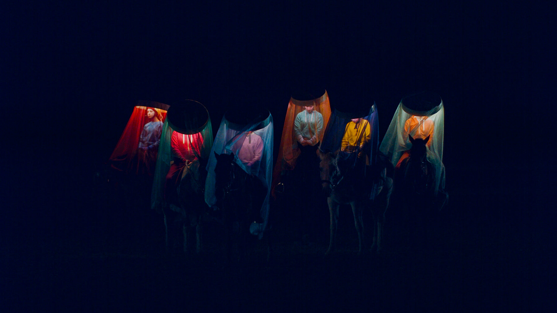 "Hym(e)nals" is a four-channel film and sound piece that showcases six teenage horse riders and their elderly equine partners. Filmed at a horse sanctuary this work captures the riders as they traverse the Wurundjeri bush at night, employing their voices to foster interspecies communication. Adorned in transparent fabrics and illuminated by lights, "Hym(e)nals" reimagines the conventional imagery of the pony club, casting it in a new light. The work highlights the practice's commitment to working with multi-species communities for extended periods, creating gestures that gather differently and advocate for a dance into stranger solidarities and proximities.