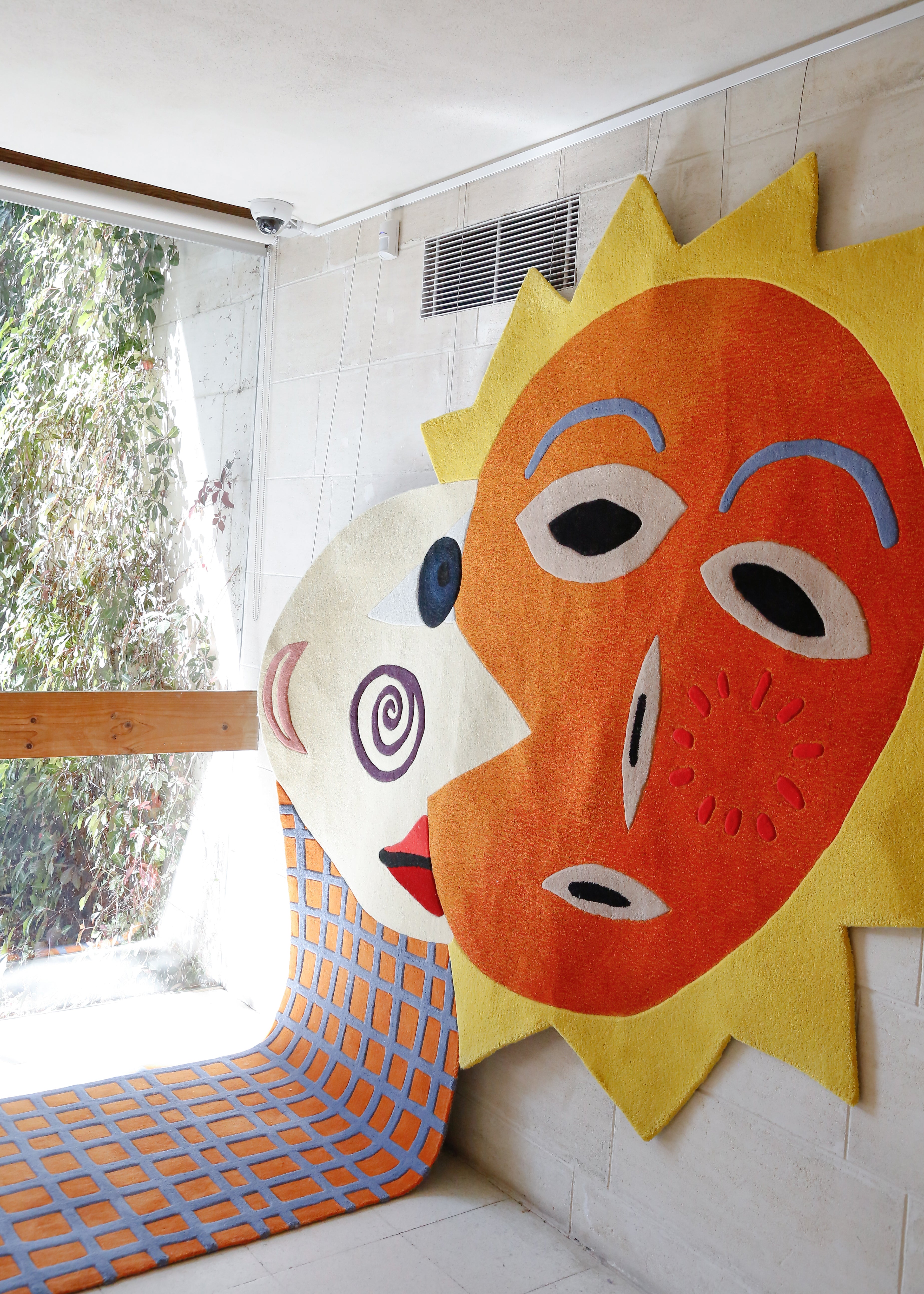 With expertise in fabric and textile design and construction, Alpha60 have brought the works of Brendan Huntley to life — in object form. The rugs feature an array of Huntley’s bright and characteristic motifs including faces, celestial beings, clocks, butterflies and eyes. They speak to the artist’s musings on the often temporary nature of personal transformation; how the landscape of individual growth moves in random patterns; and the way that euphoric moments of understanding can be fleeting.
