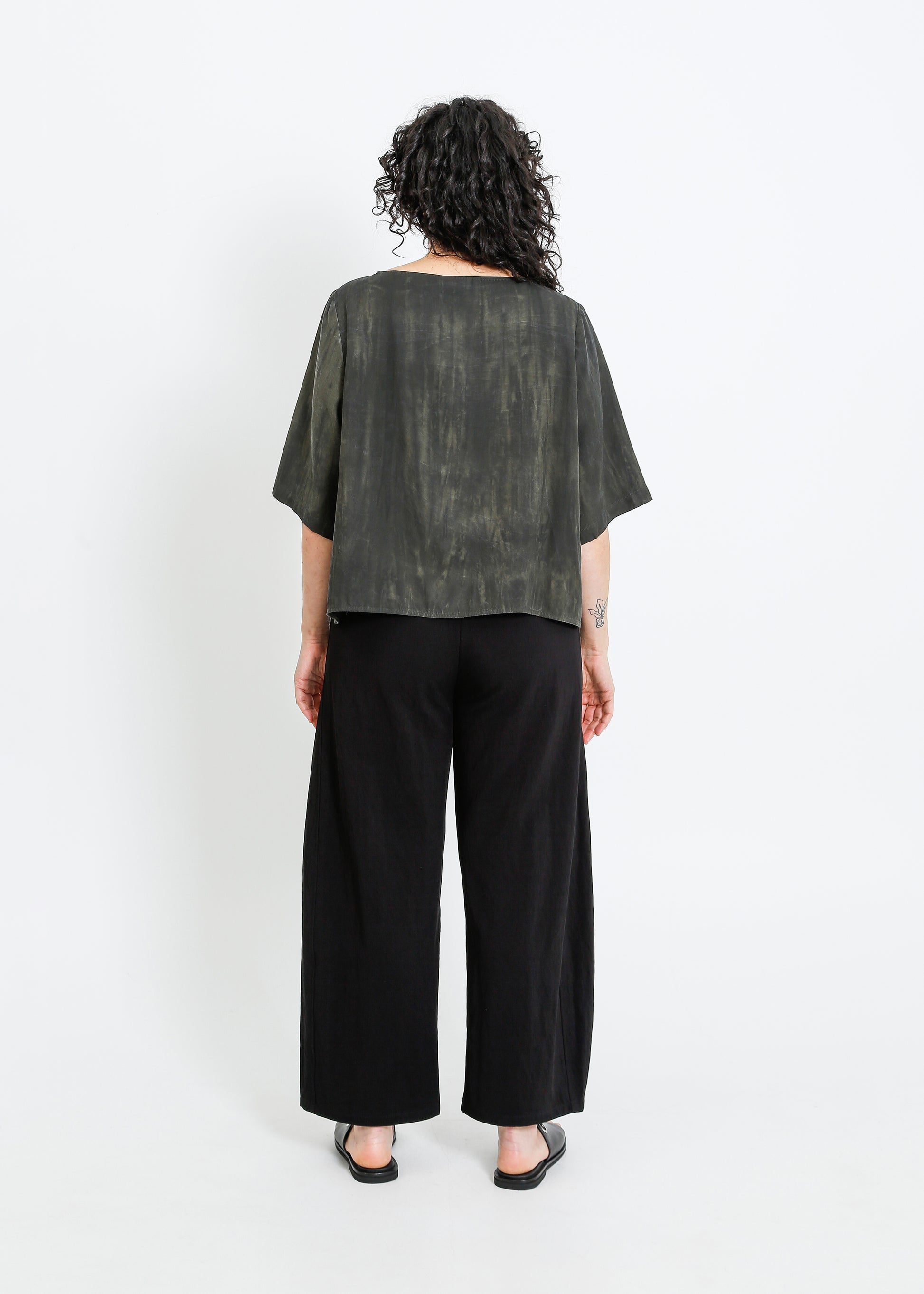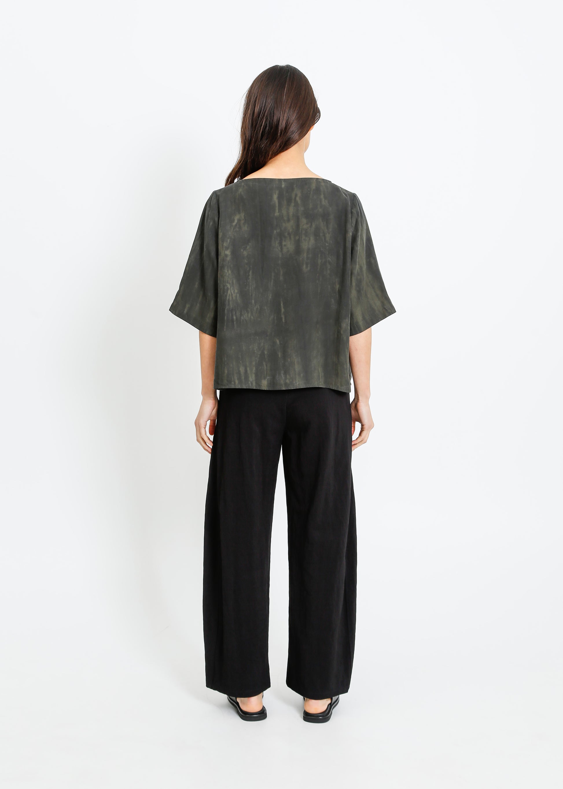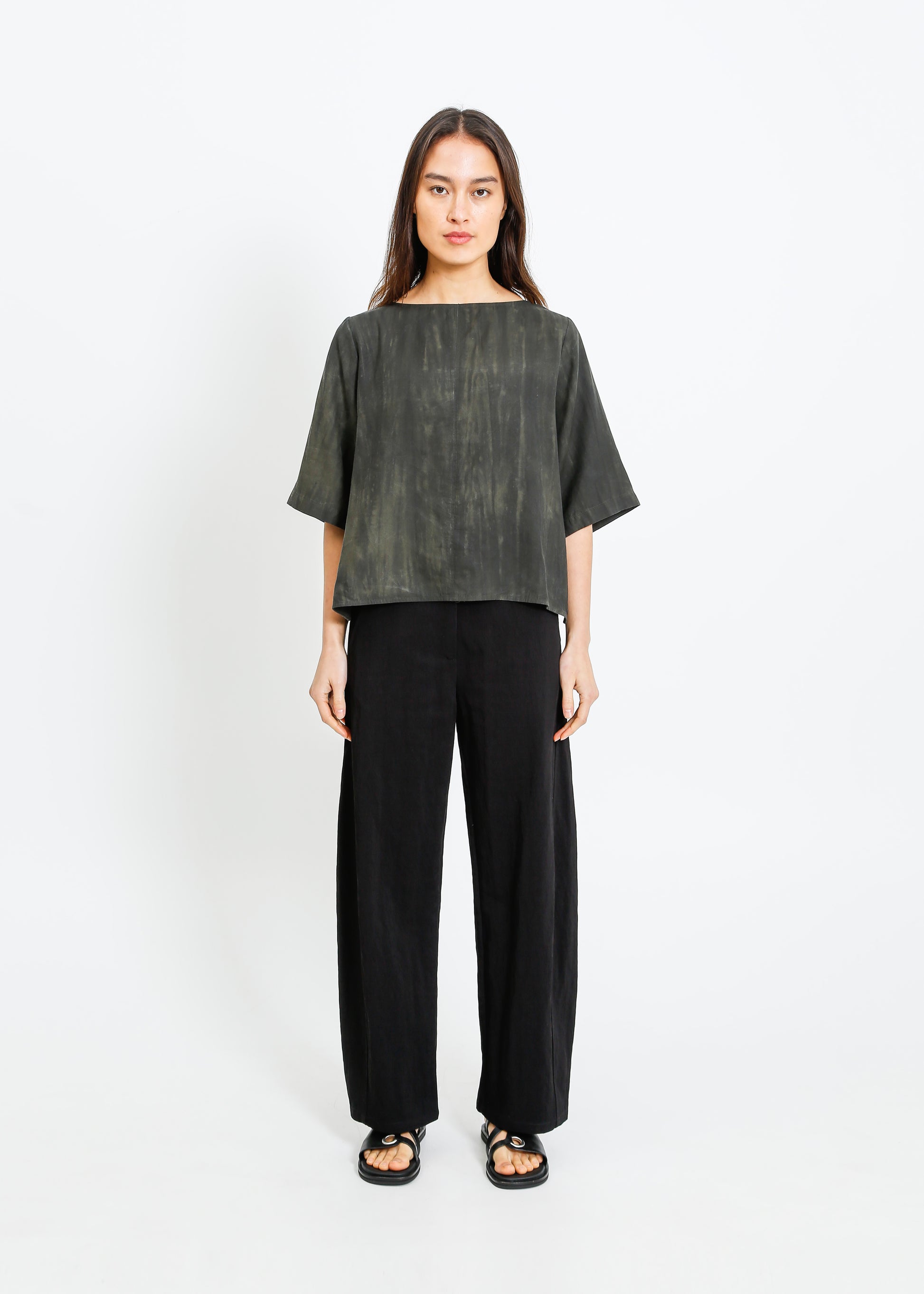 The ALPHA60 Daisy Tee has a boxy silhouette and is cut in a soft washed khaki. The style has set-in sleeves that are cropped at the elbow, a wide boat neckline and is complete with side seam...