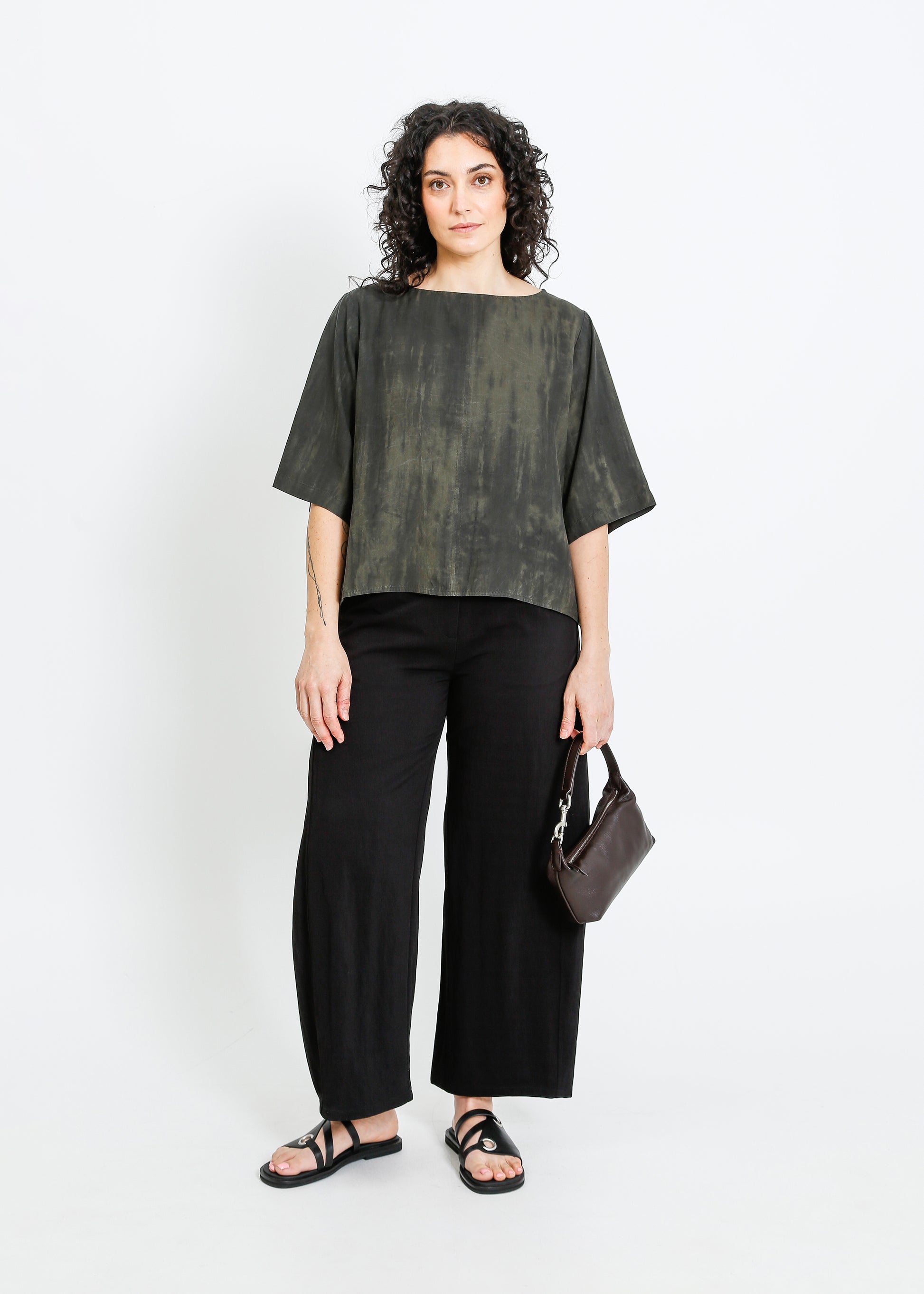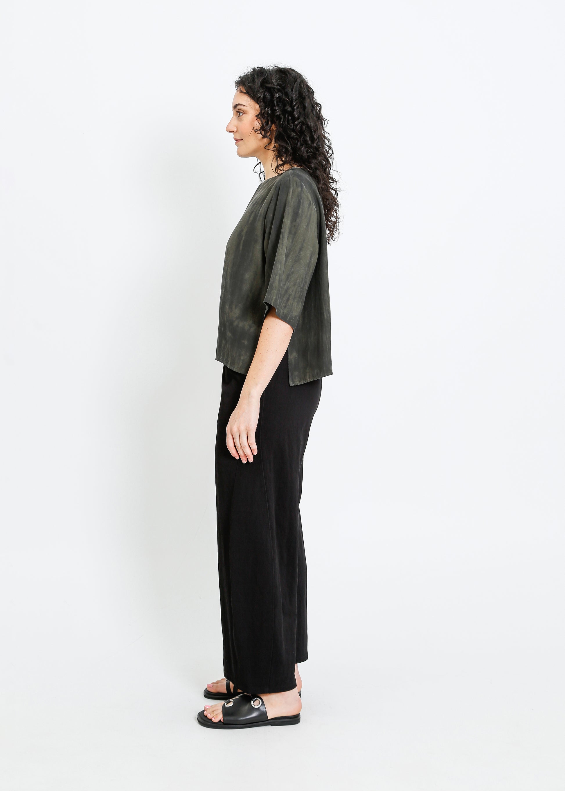 The ALPHA60 Daisy Tee has a boxy silhouette and is cut in a soft washed khaki. The style has set-in sleeves that are cropped at the elbow, a wide boat neckline and is complete with side seam splits. This easy-going style is perfect for those warmer summer days.
