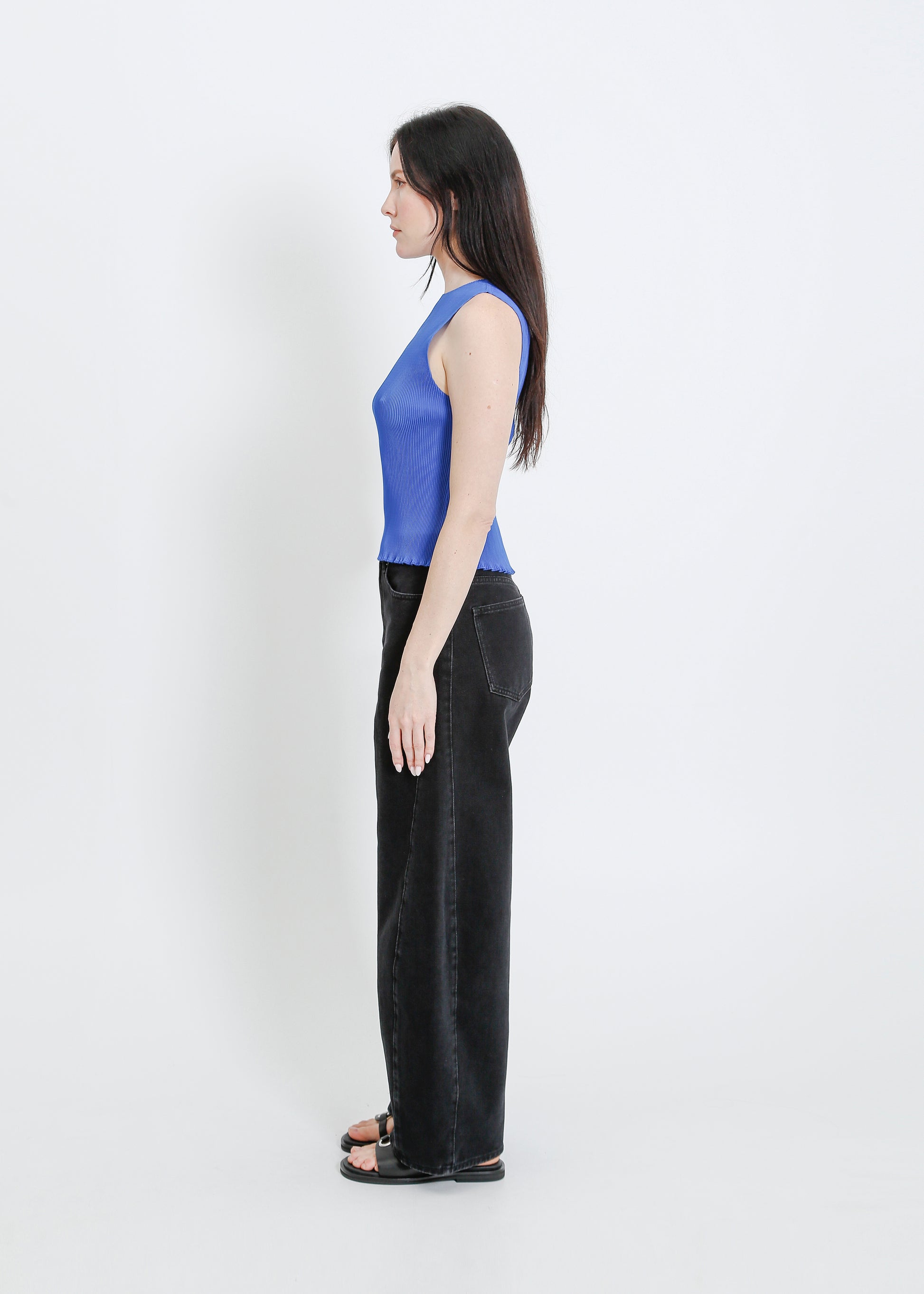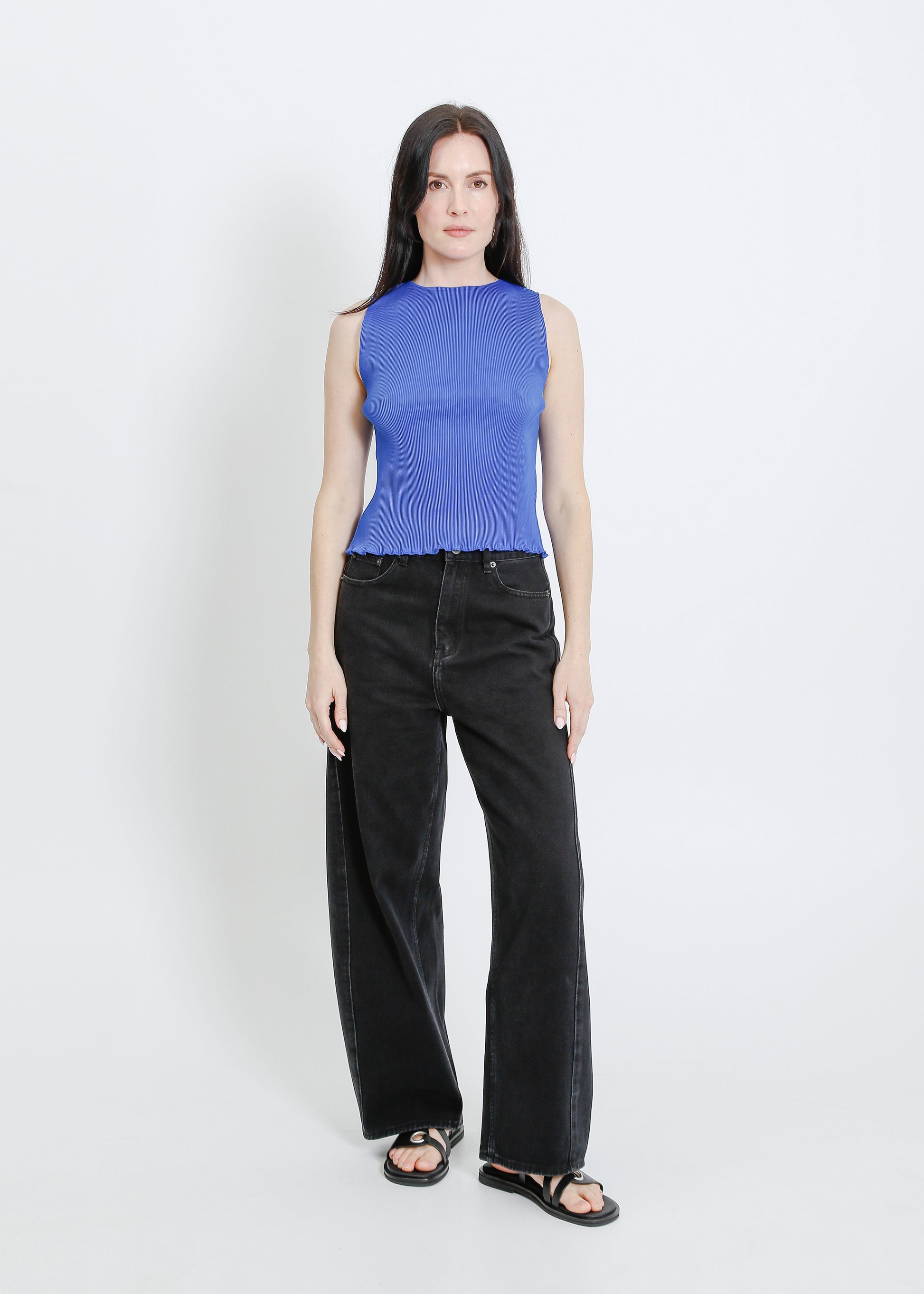 The ALPHA60 Emma Pleat Top is a modern essential, crafted in a vibrant bright blue with a unique crystal pleat texture. This sleeveless crew neck top features a form-fitting silhouette and a standard length, making it perfect for layering or wearing on its own. The pleated, non-stretch fabric adds dimension and a contemporary edge to your wardrobe.