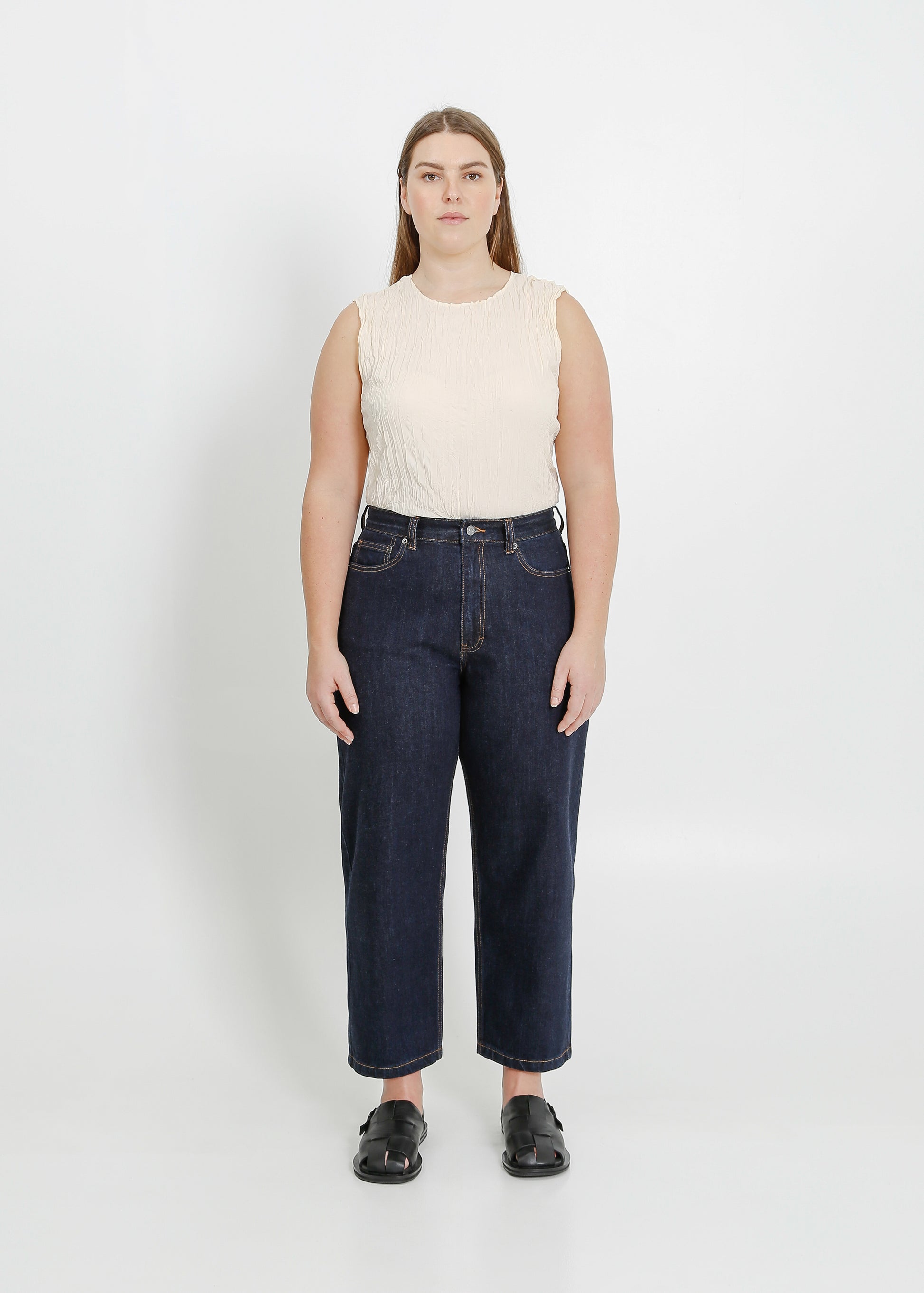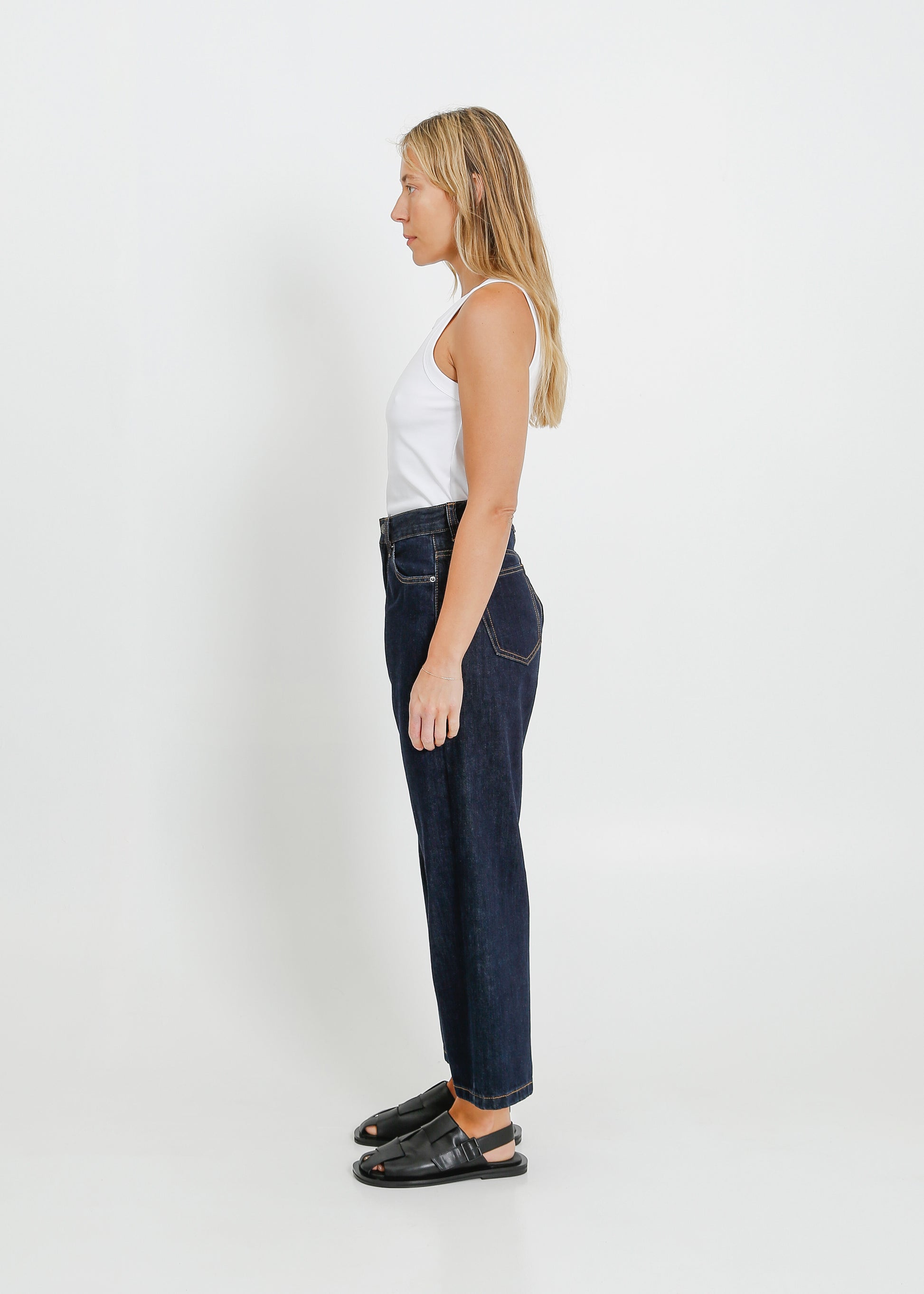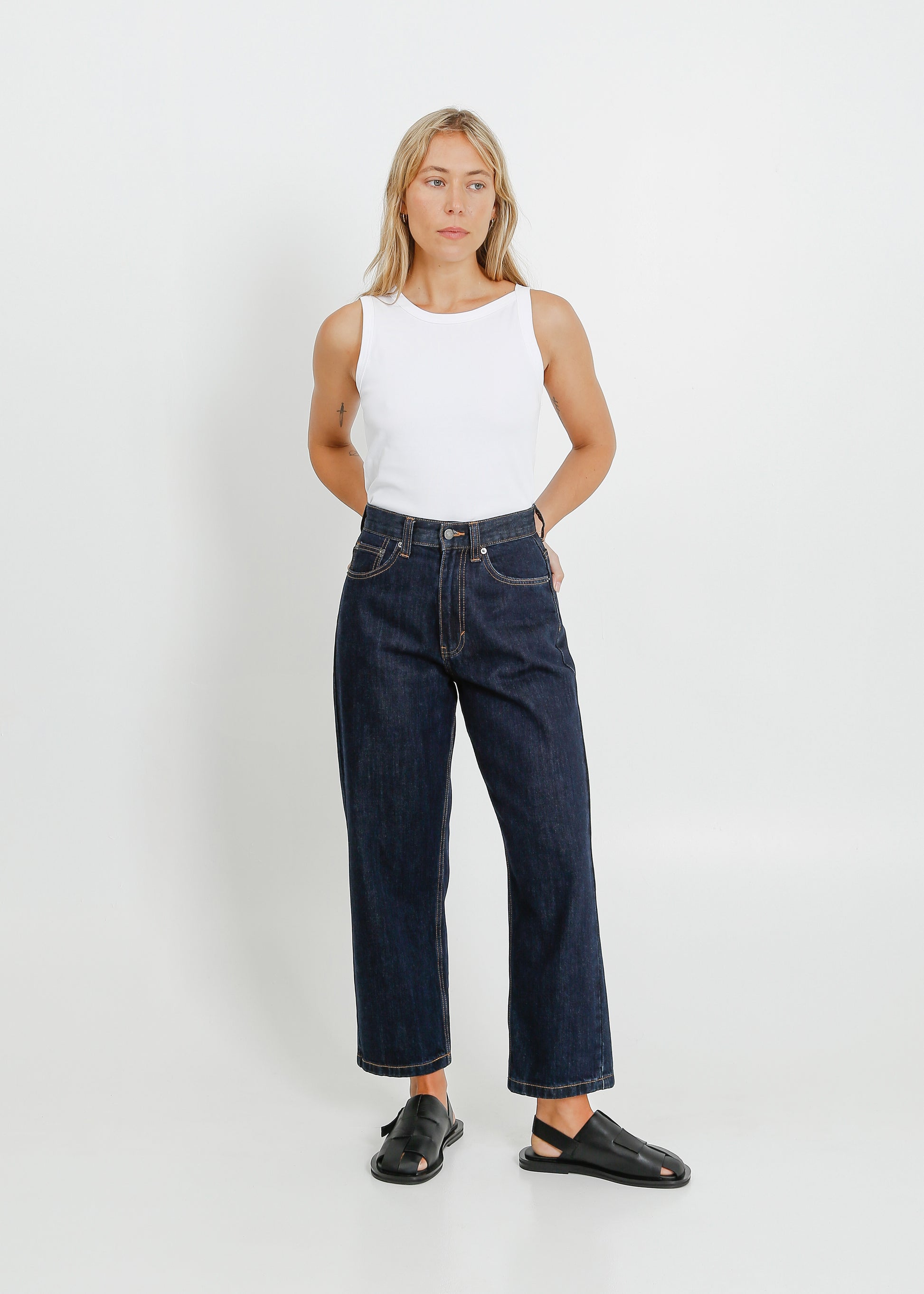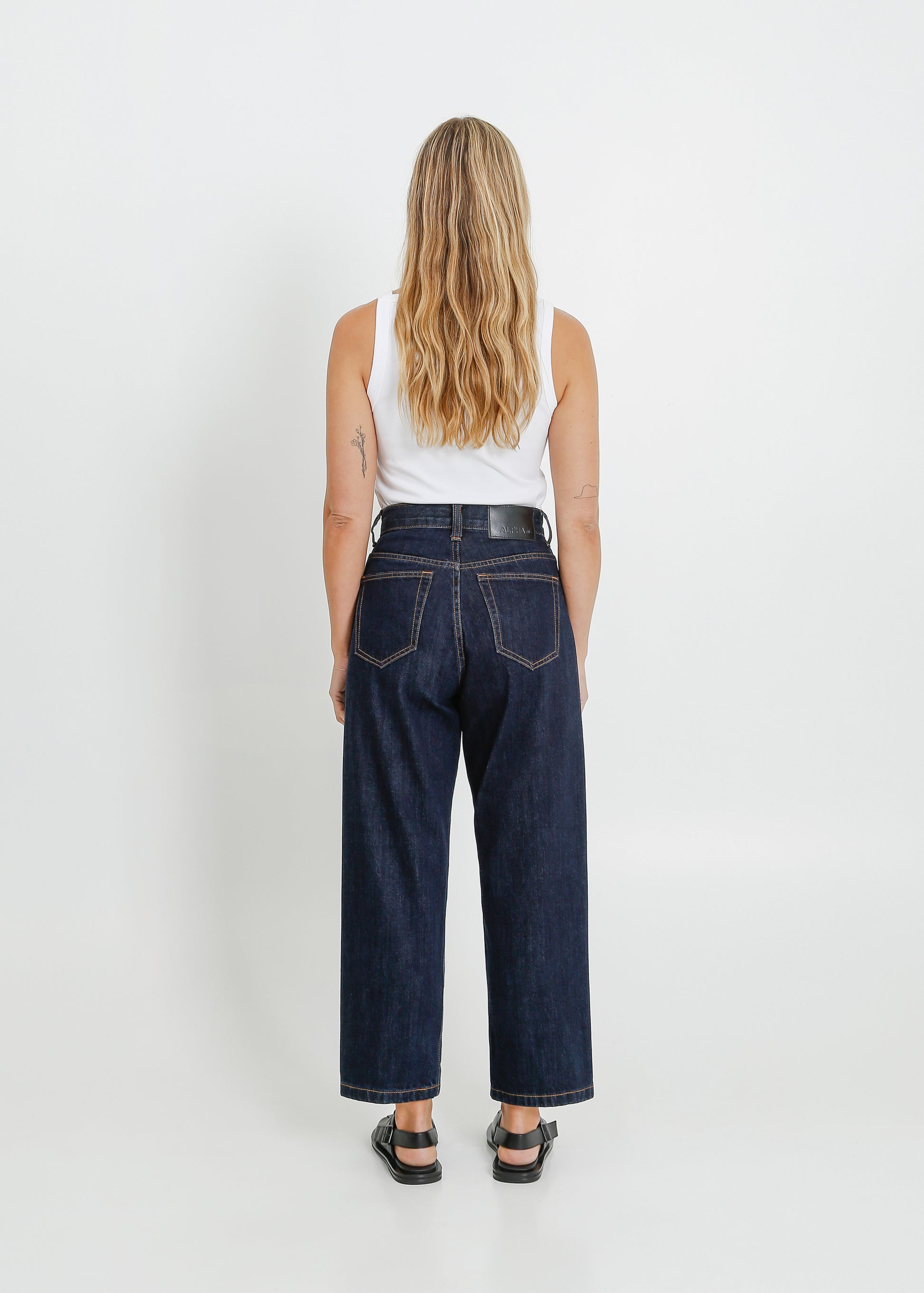 The ALPHA60 Goldie Jeans are cut from a classic washed rigid denim. The high waisted cut has a relaxed, straight leg and a cropped length. With the classic five pocket feature, they are finished with dark silver hardware.