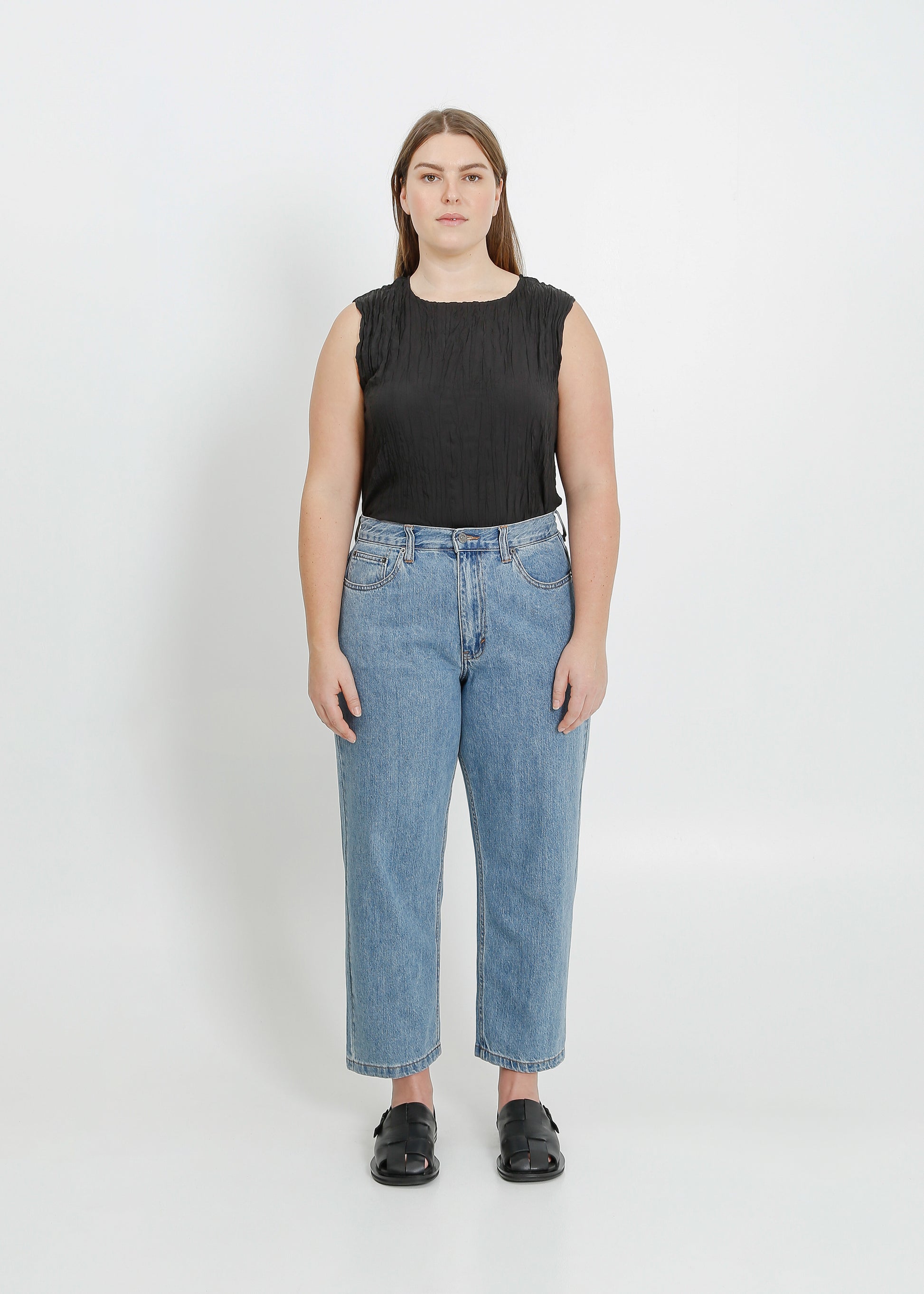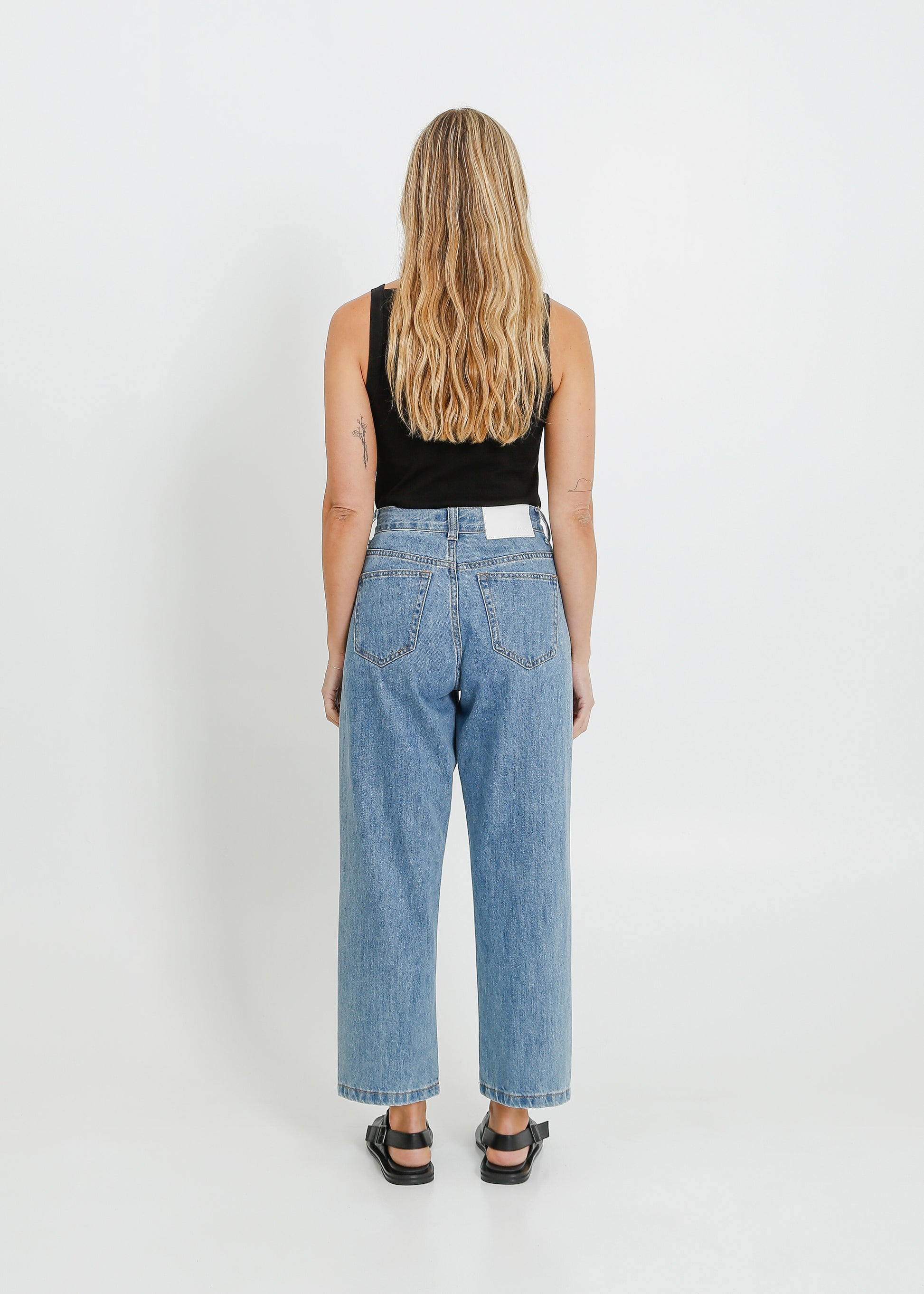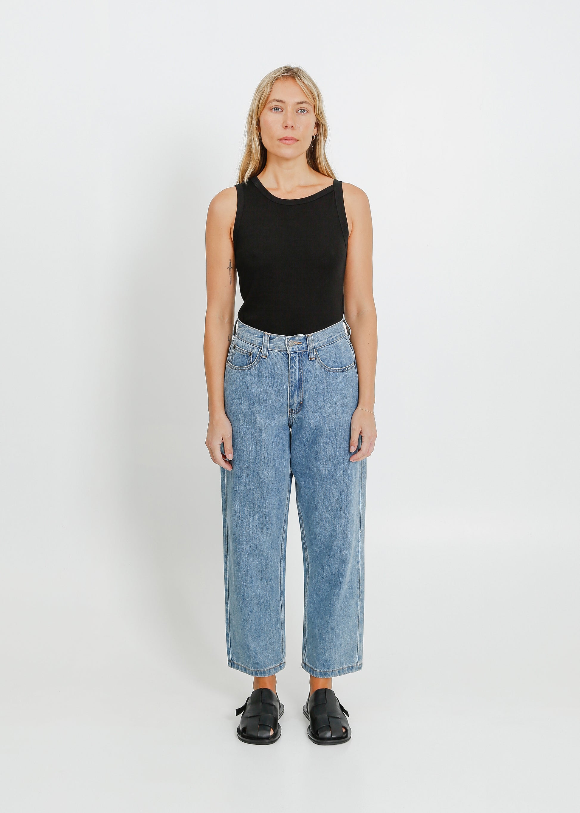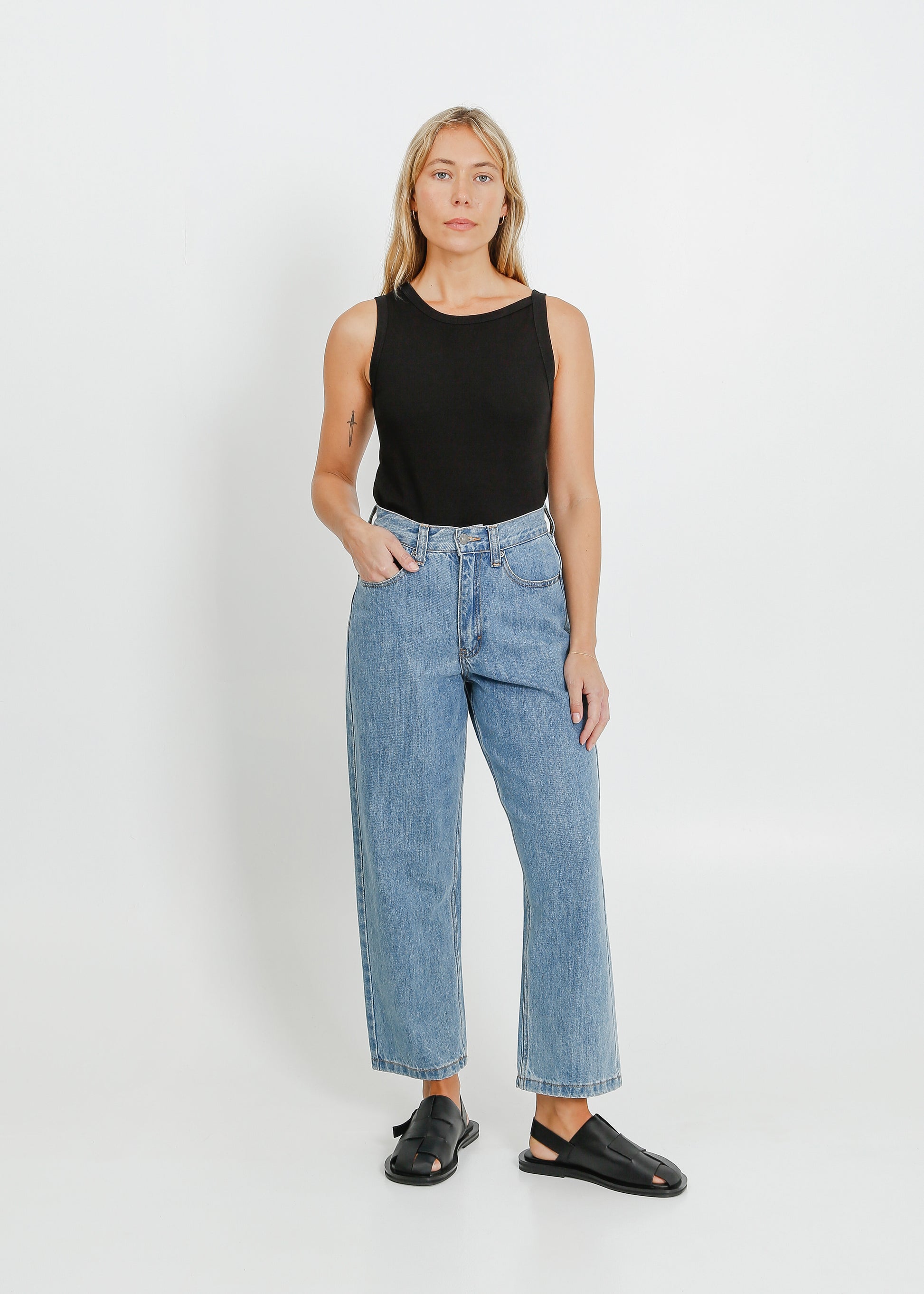 The ALPHA60 Goldie Jeans is cut from a classic washed denim. The high waisted cut has a relaxed, straight leg and a slightly cropped length. With the classic five pocket feature, they are finished with dark silver hardware.