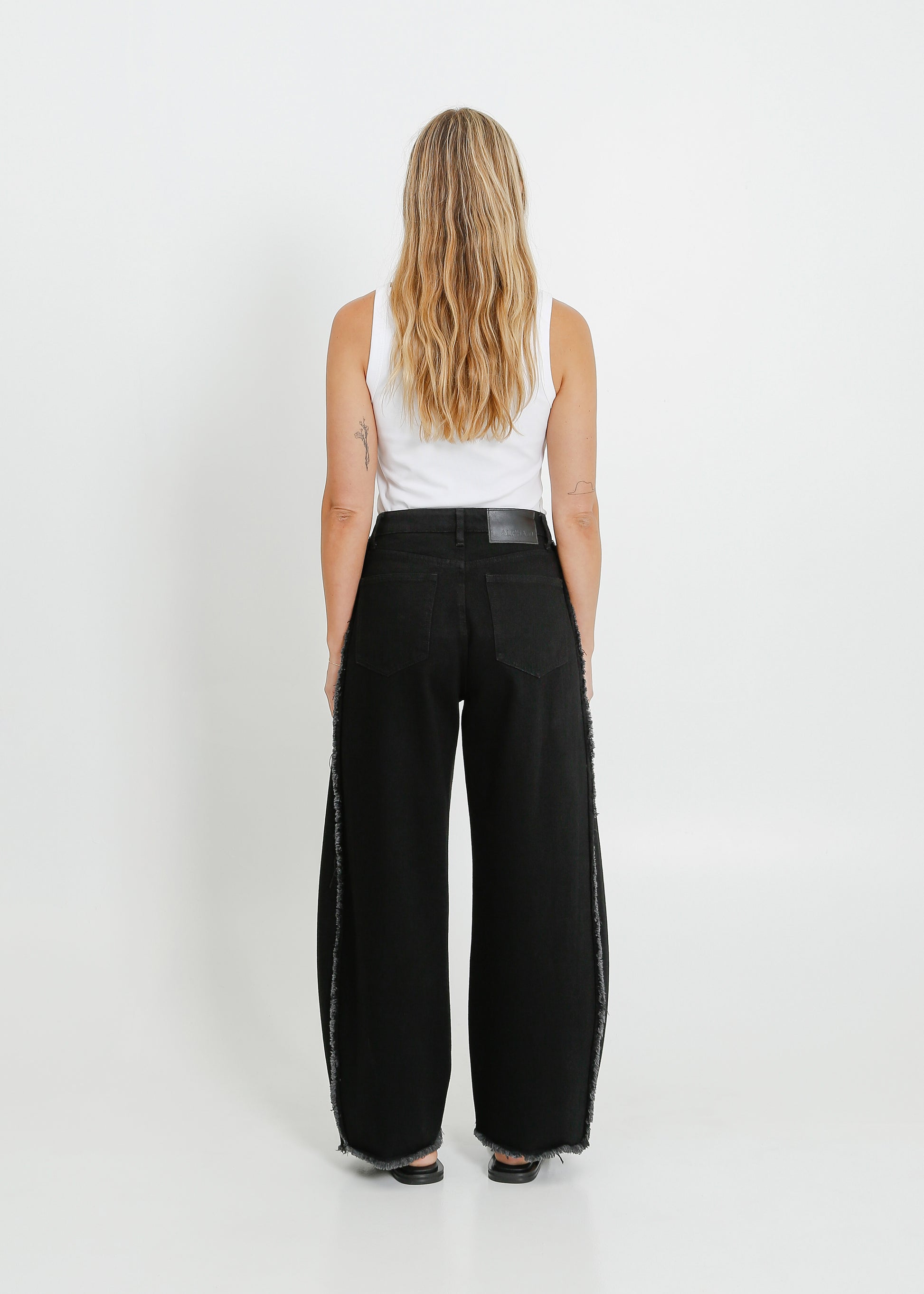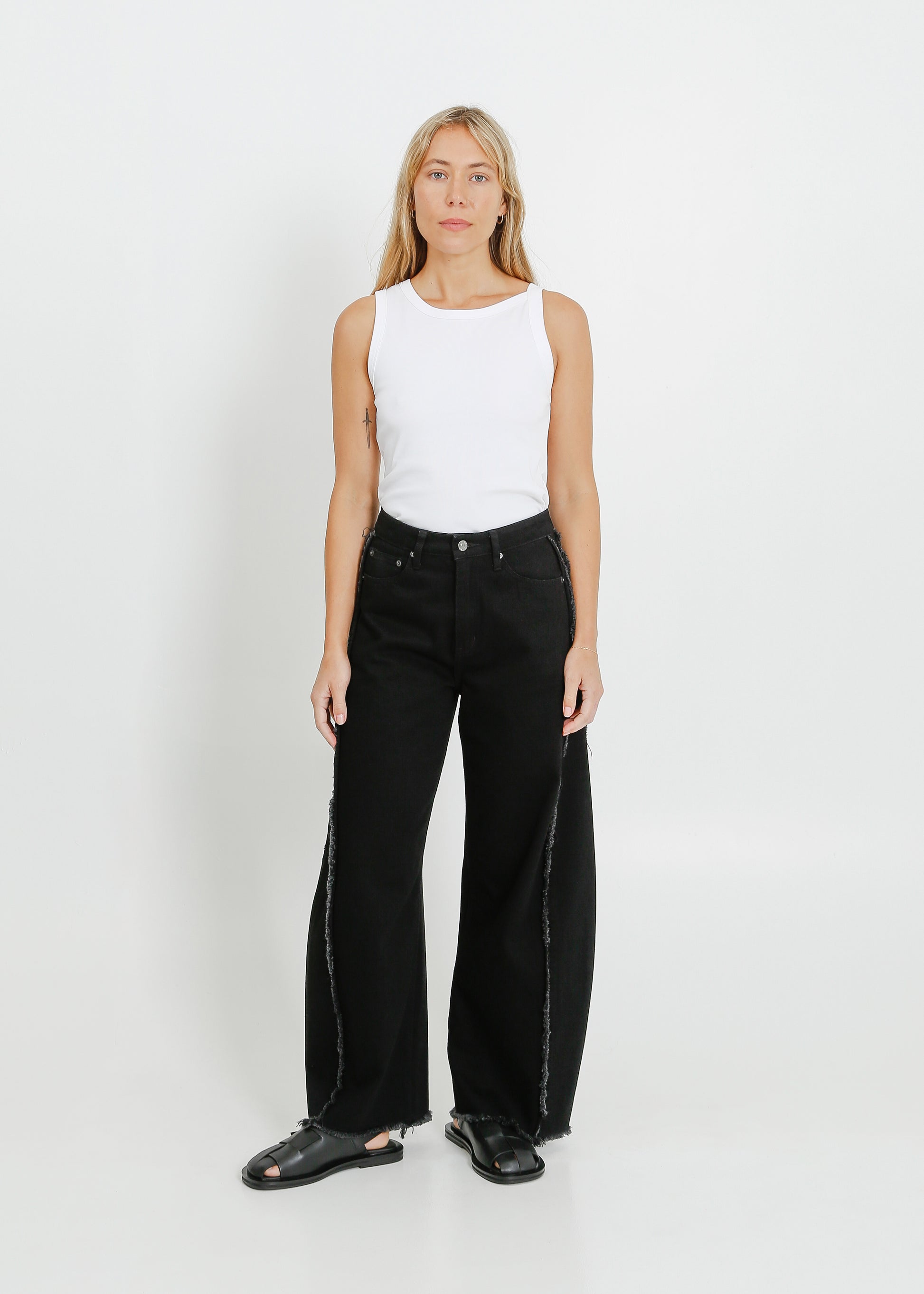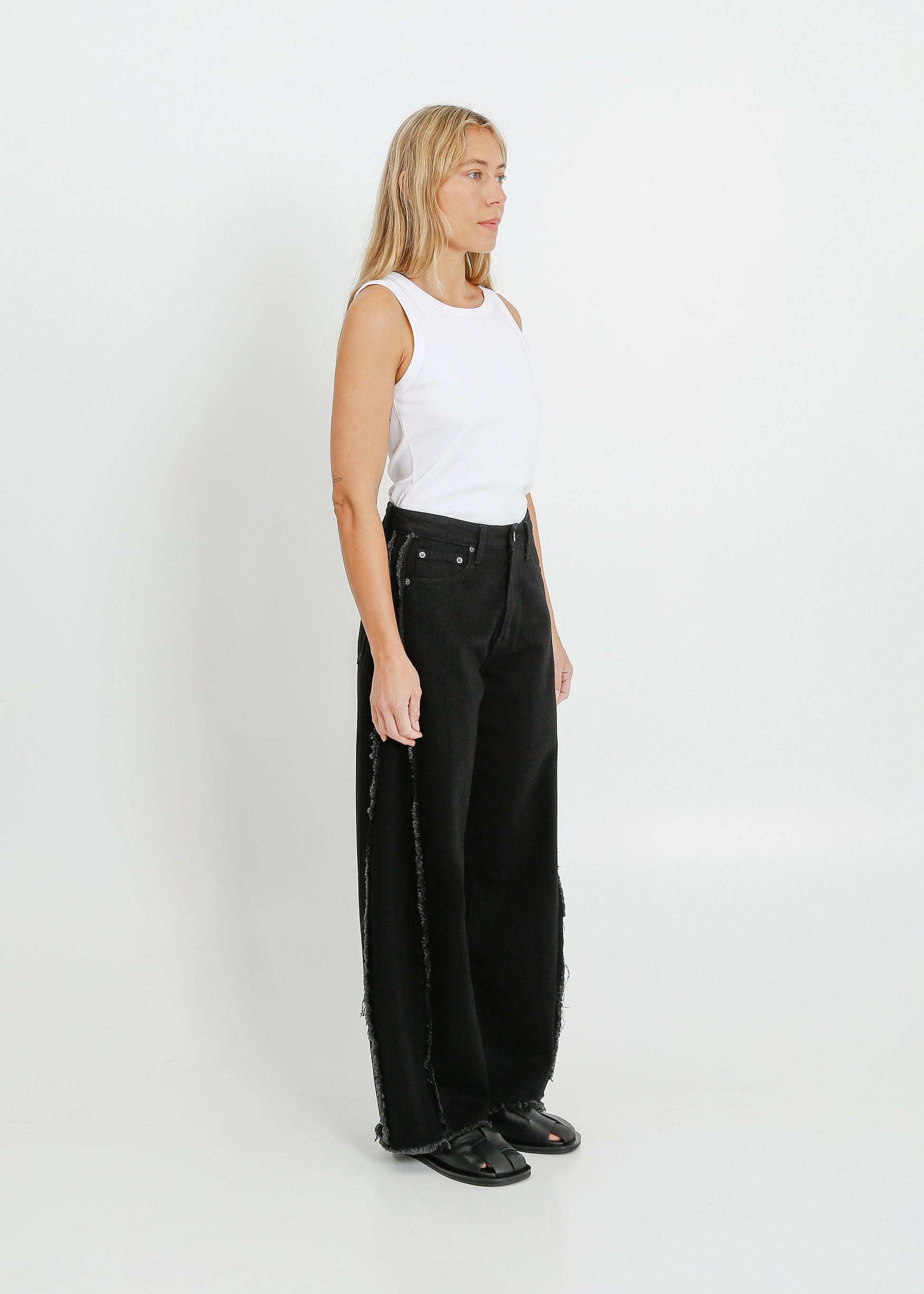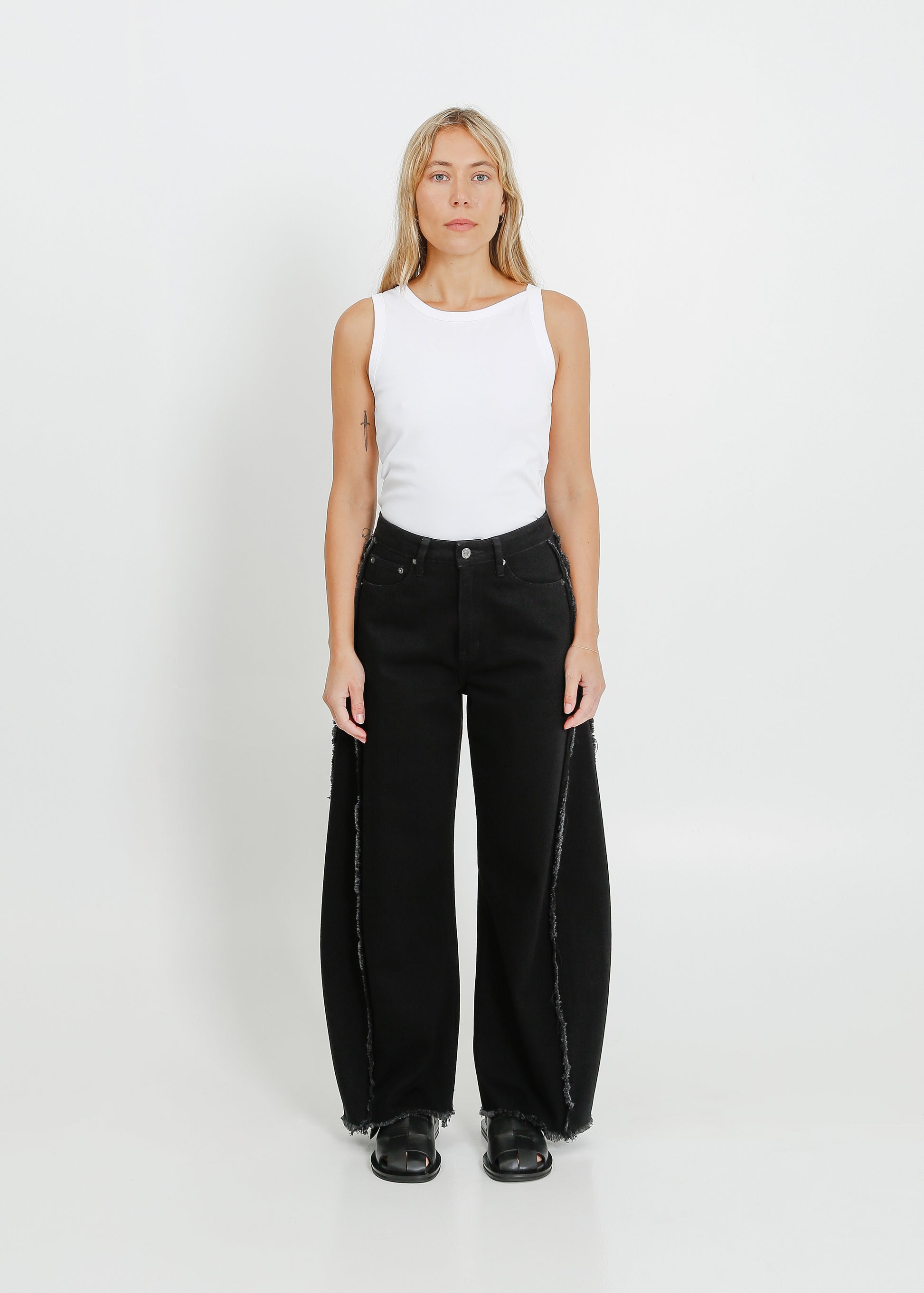 The ALPHA60 Penny Jean is a high-rise denim style that has a cocoon leg profile and features side panels that are finished with frayed raw seams. The jeans have classic 5 pocket denim styling with a raw hem, back yoke detail, belt loops and a button and fly front. Finished Alpha60 hardware and leather patch and cut from rigid cotton blend denim in washed black.