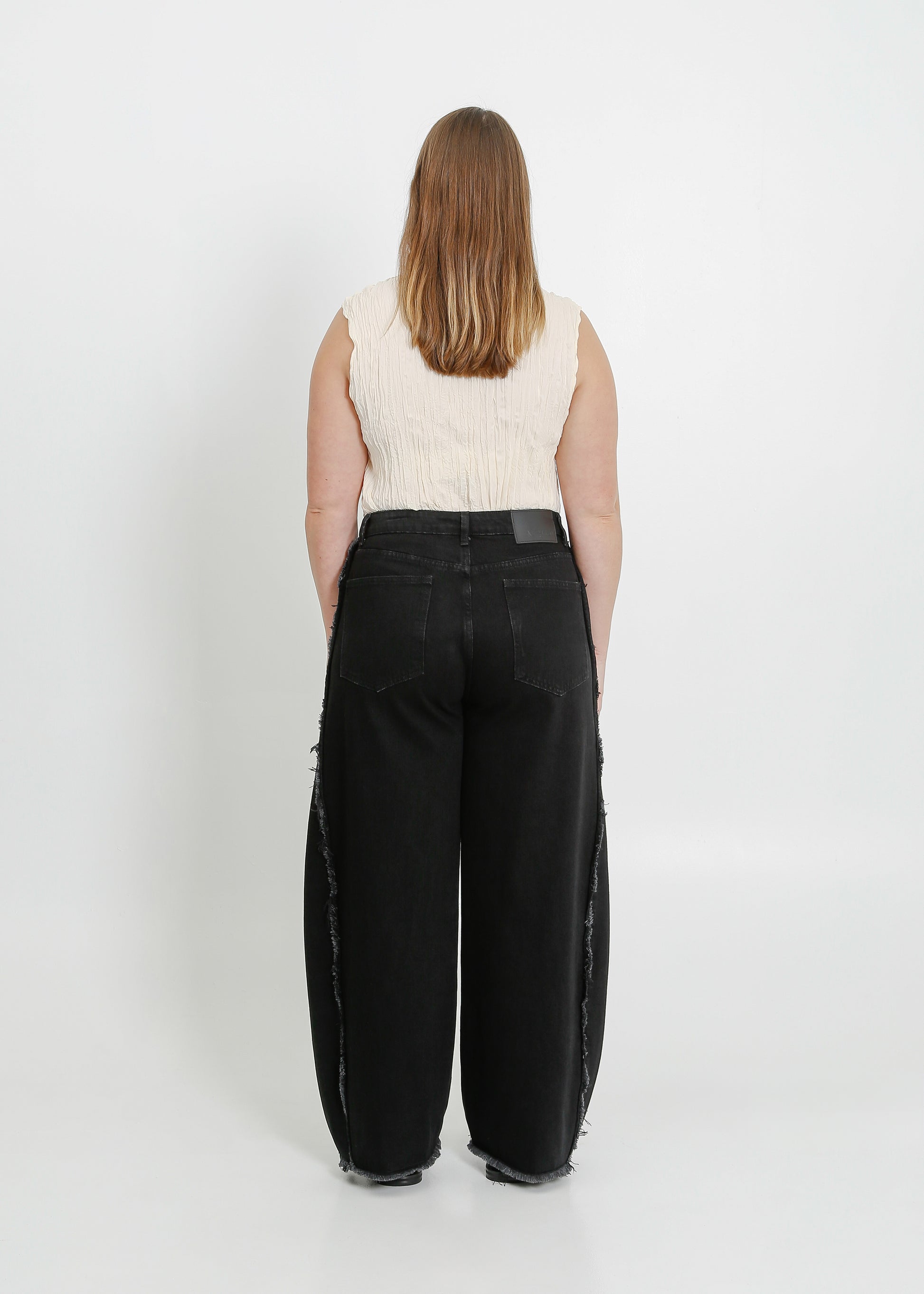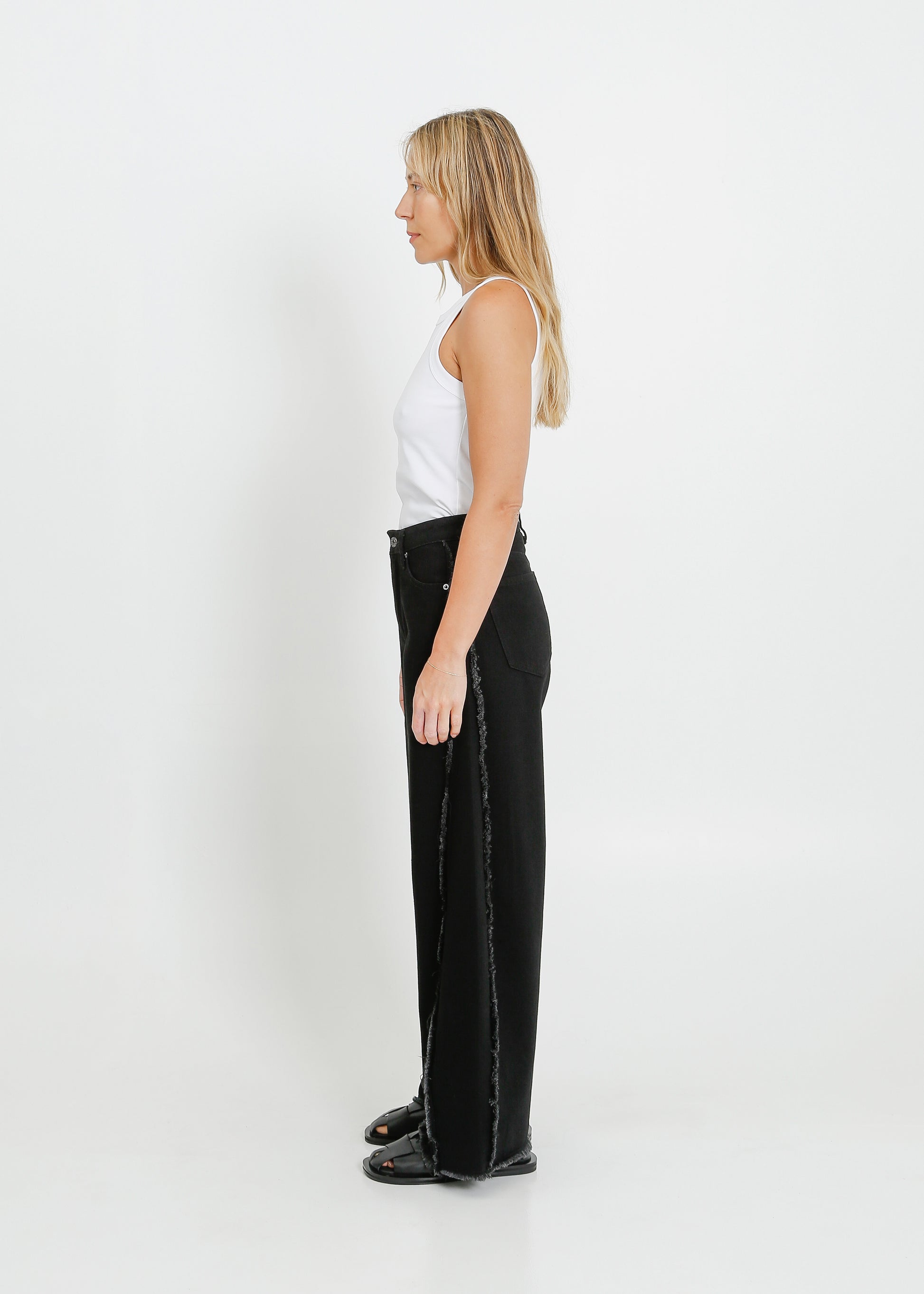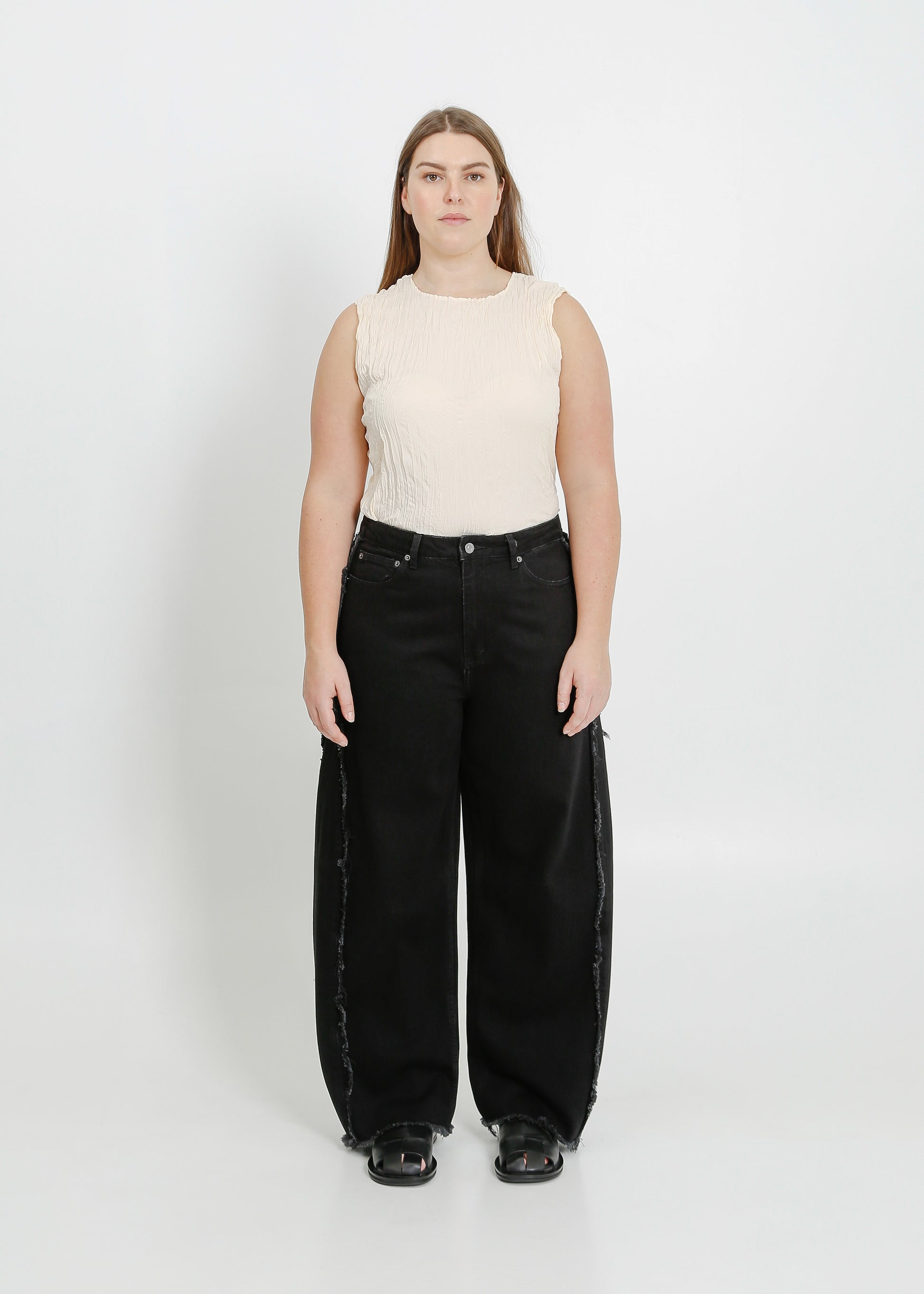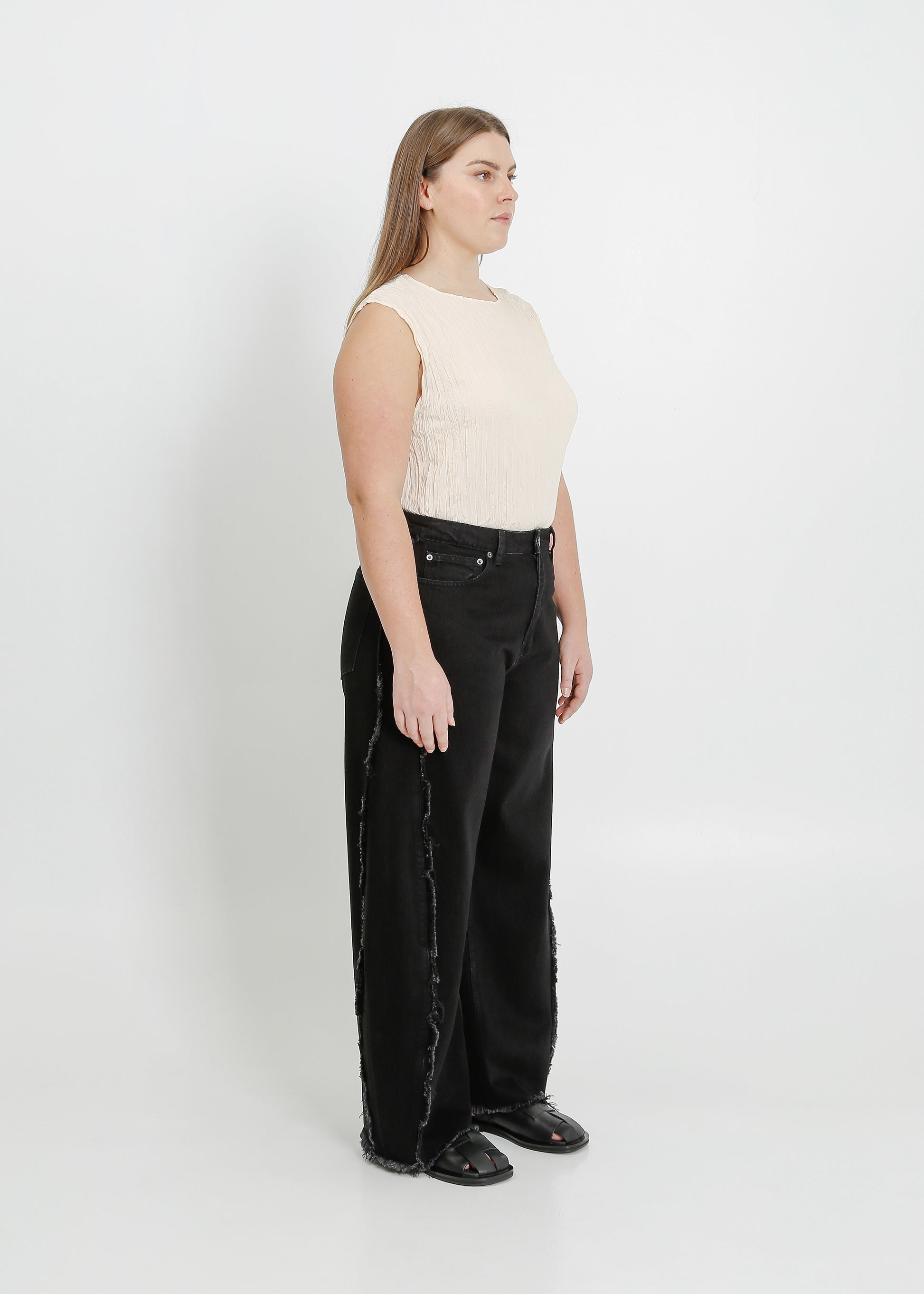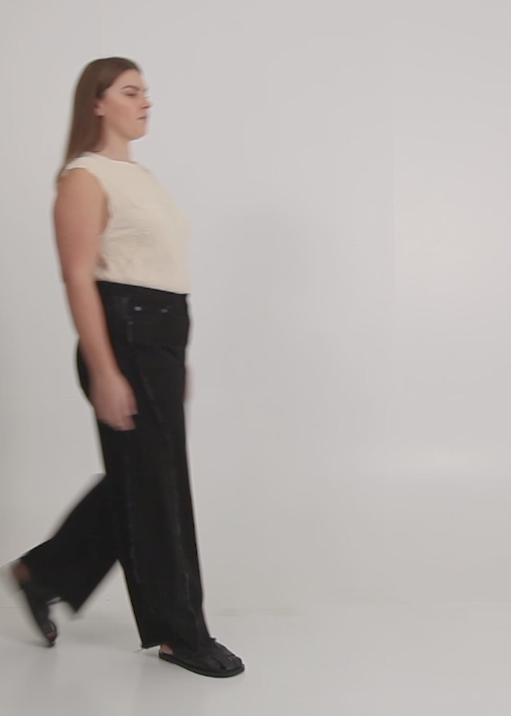 The ALPHA60 Penny Jean is a high-rise denim style that has a cocoon leg profile and features side panels that are finished with frayed raw seams. The jeans have classic 5 pocket denim styling with a raw hem, back yoke detail, belt loops and a button and fly front. Finished Alpha60 hardware and leather patch and cut from rigid cotton blend denim in washed black.