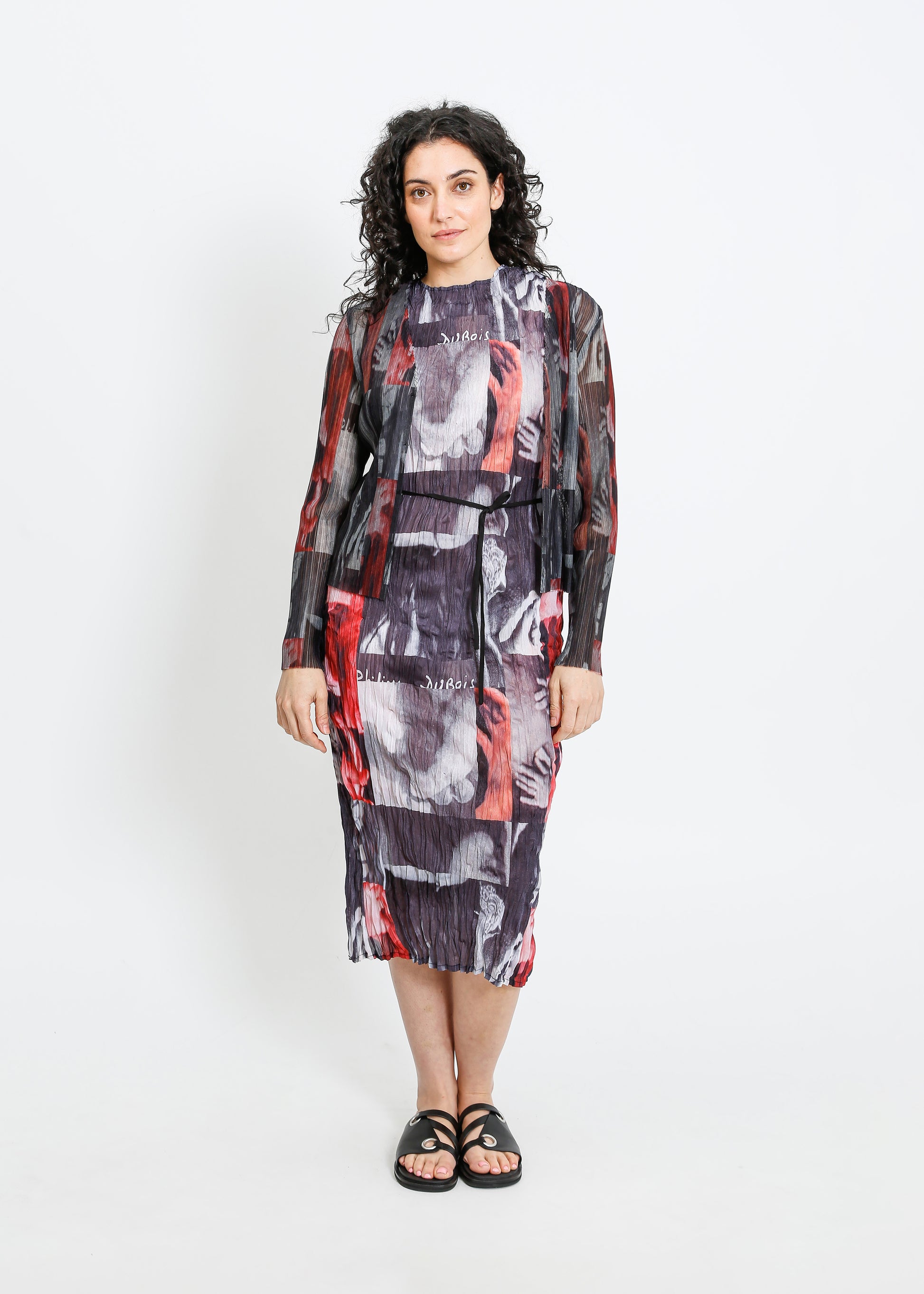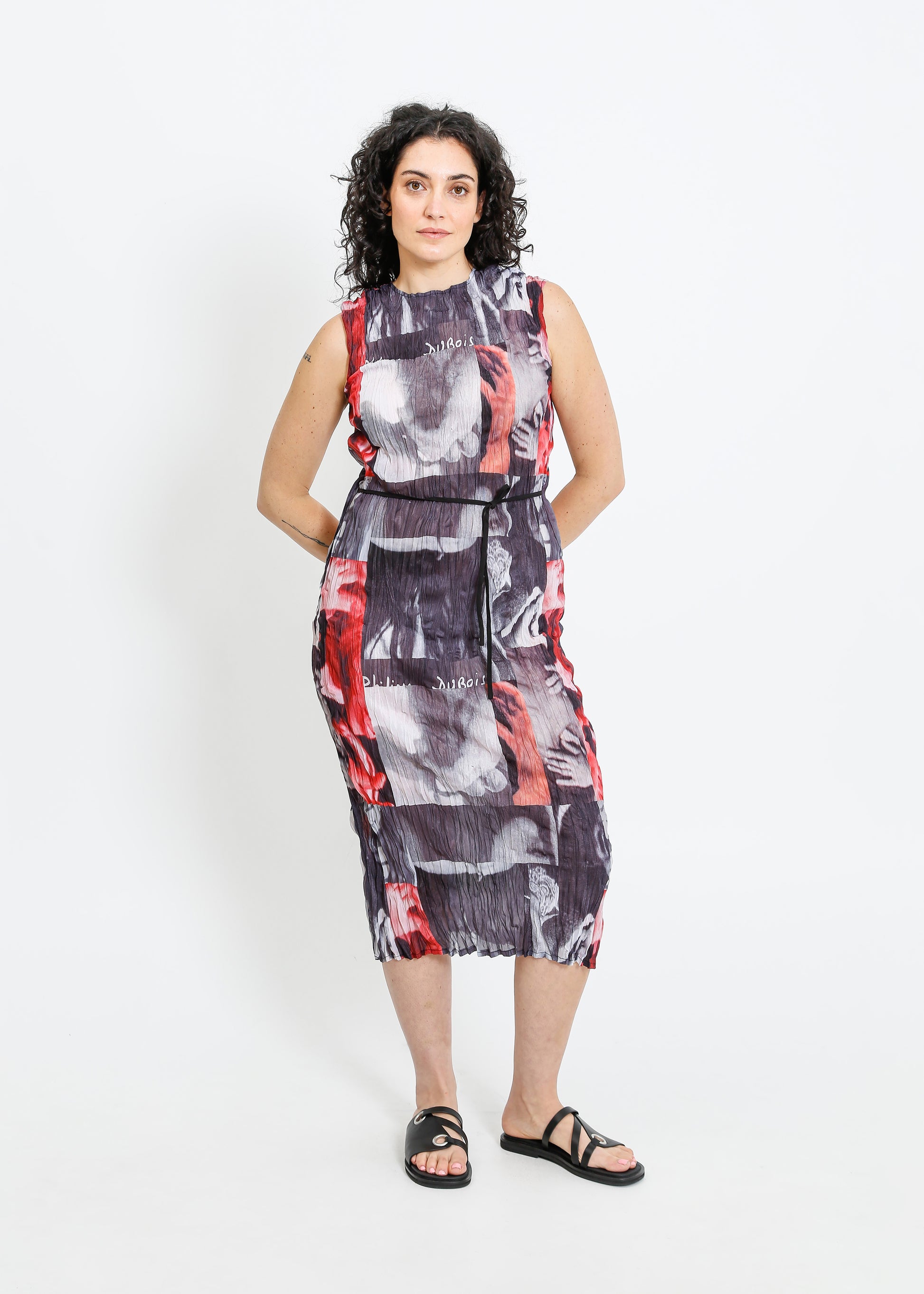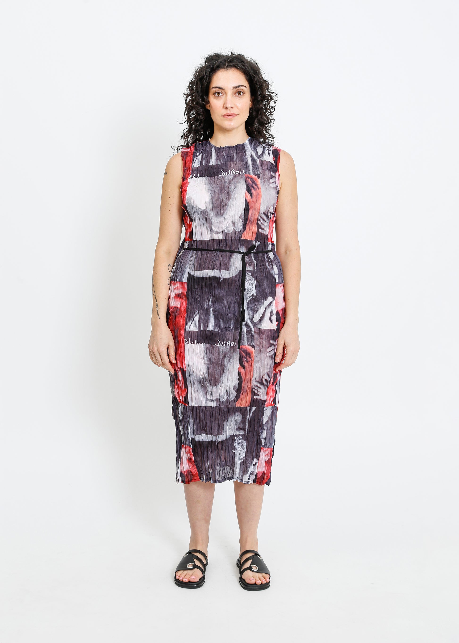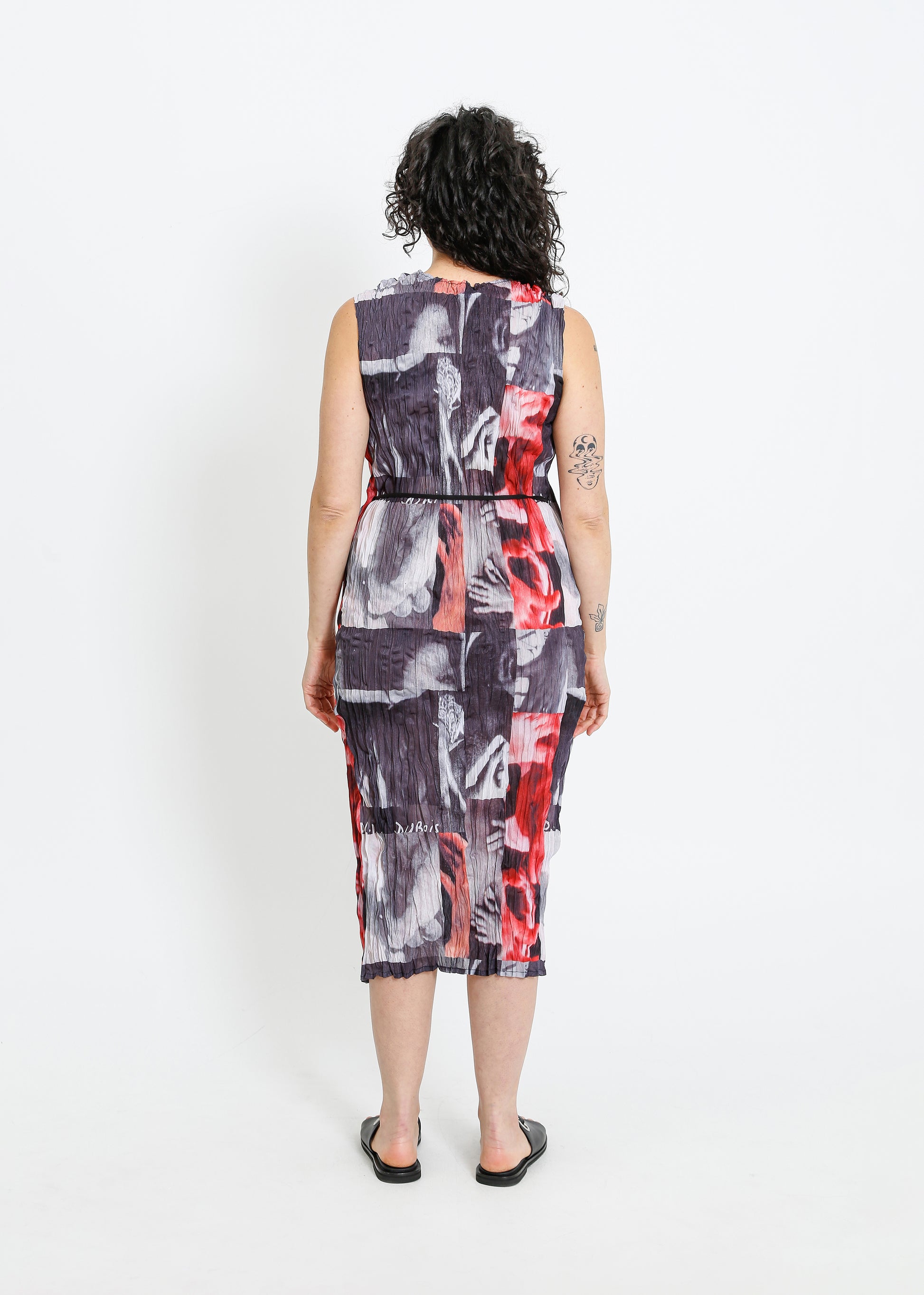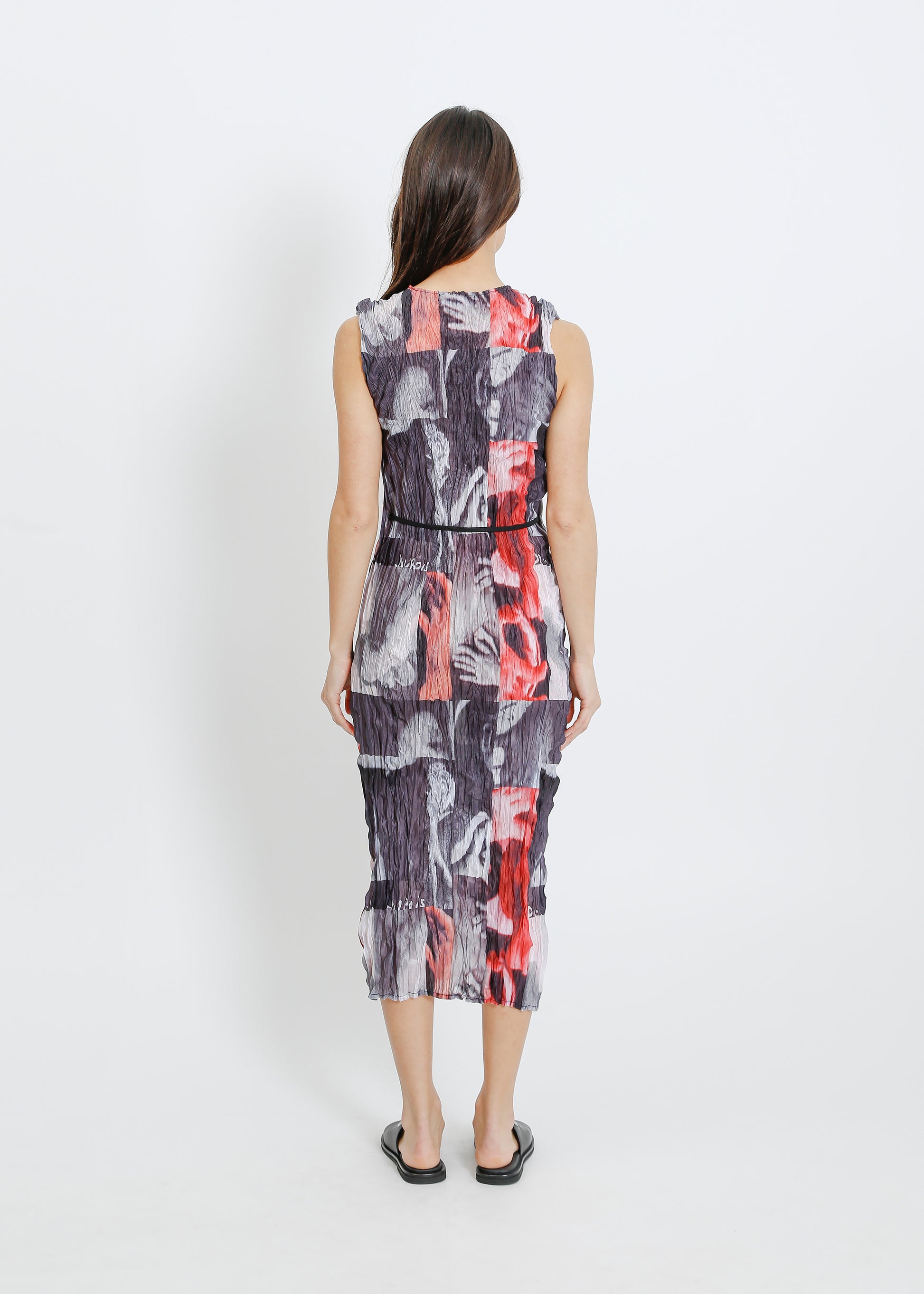 The ALPHA60 Reah Dress is a sleeveless, form-fitting midi length dress, expertly crafted from a permanently pleated crinkle fabric featuringa custom-designed print. The simple style has been finished with a waist tie, which allows for multiple styling options. Elevate your wardrobe with this versatile piece, featuring a round neckline for a polished look that styles seamlessly with any outfit.