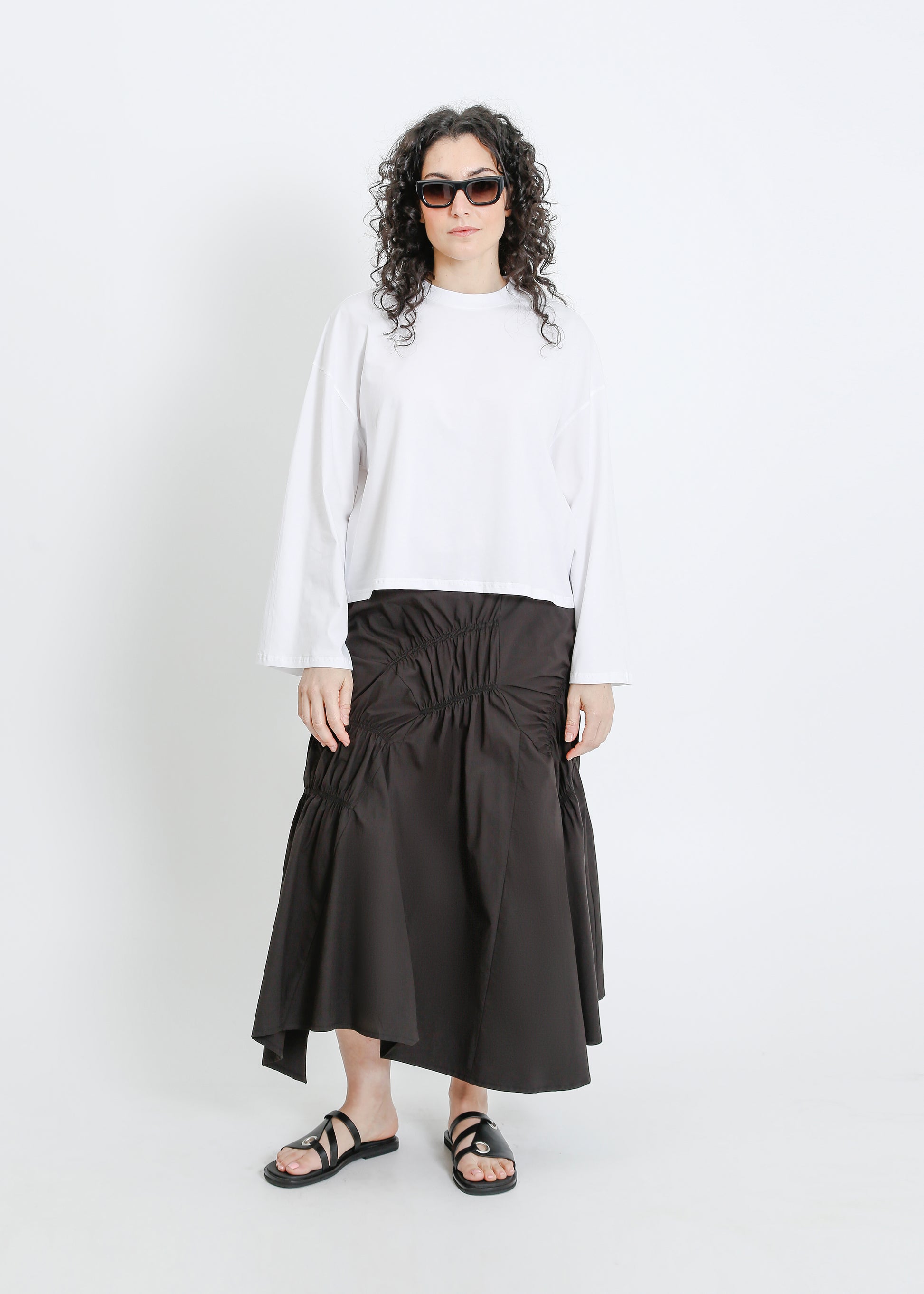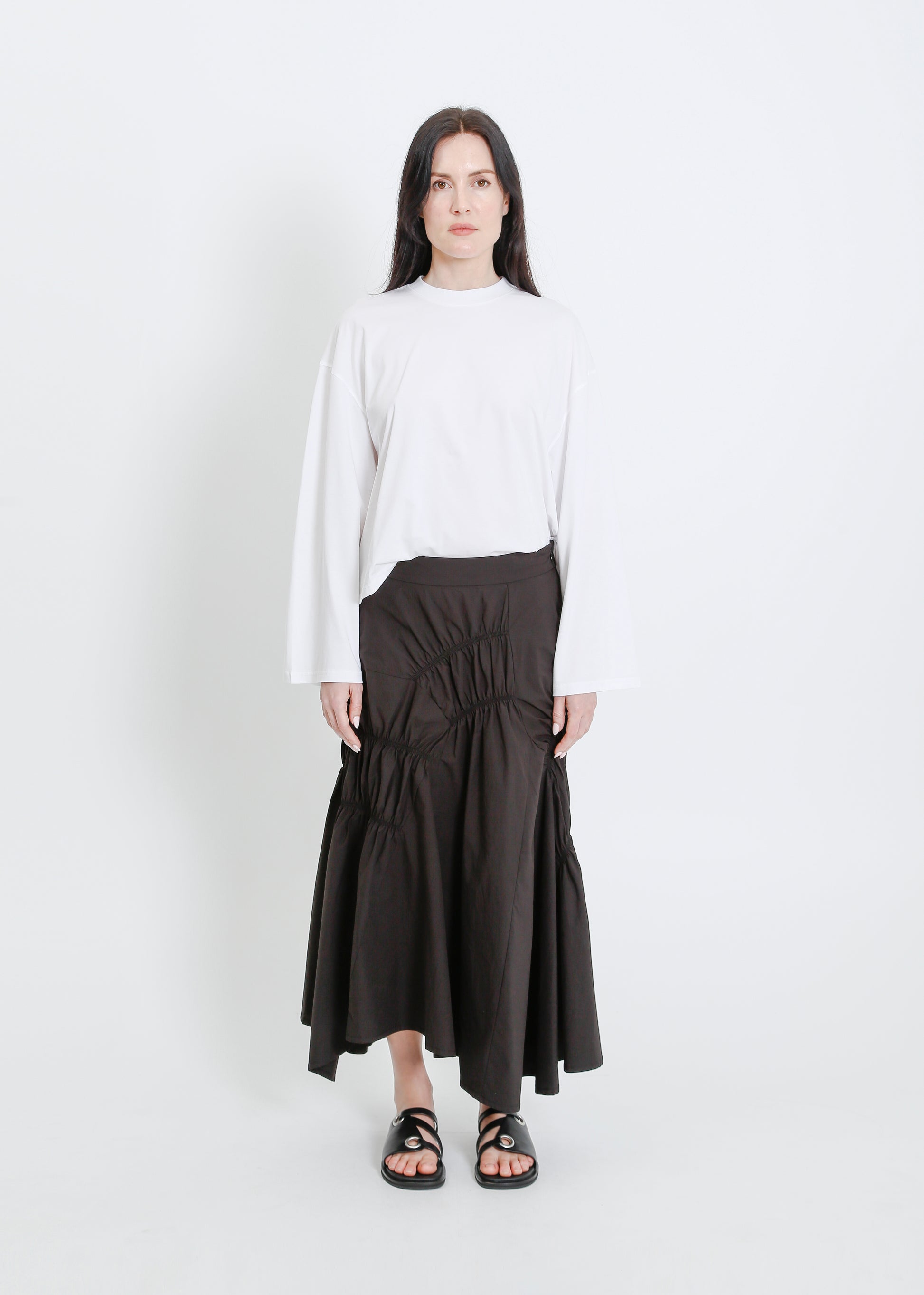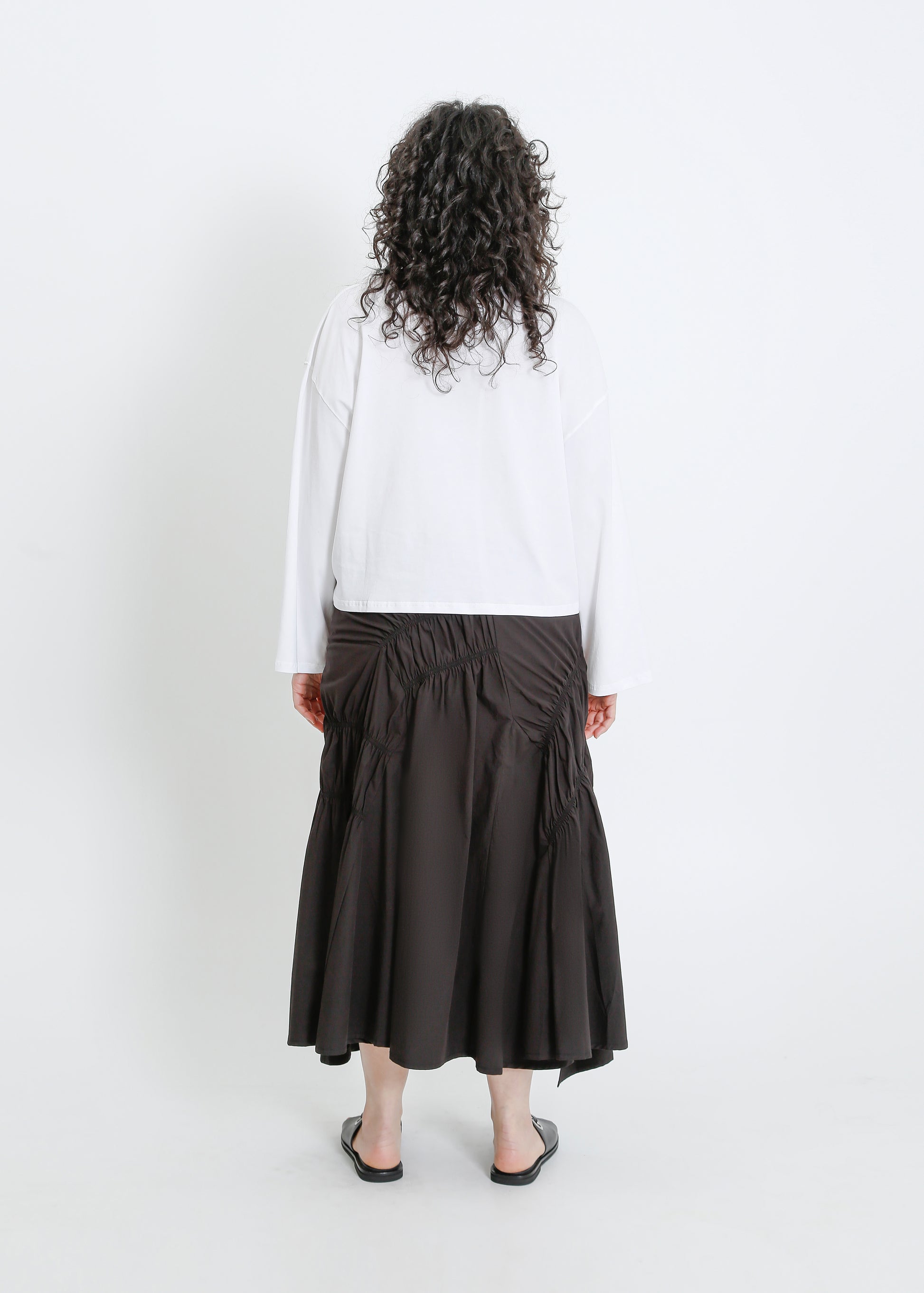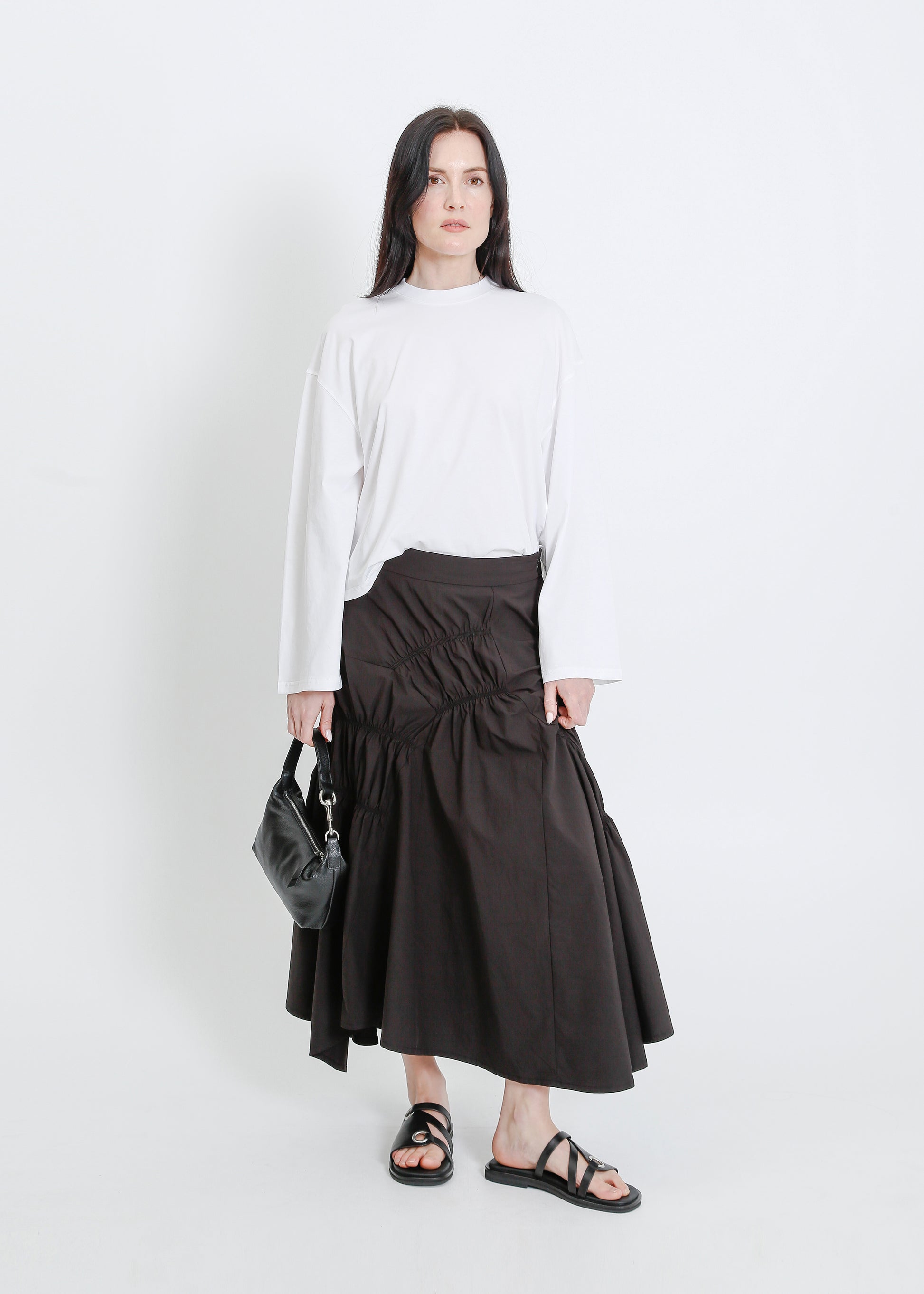 The ALPHA60 Raven Skirt is a modern take on the classic midi skirt, featuring an elasticated waistband for comfort and shirred asymmetric panels throughout for a unique look. The asymmetric hem adds movement and interest, while the side zipper ensures a secure fit. Crafted from 100% cotton, this skirt is both breathable and stylish—perfect for elevating your everyday wardrobe.