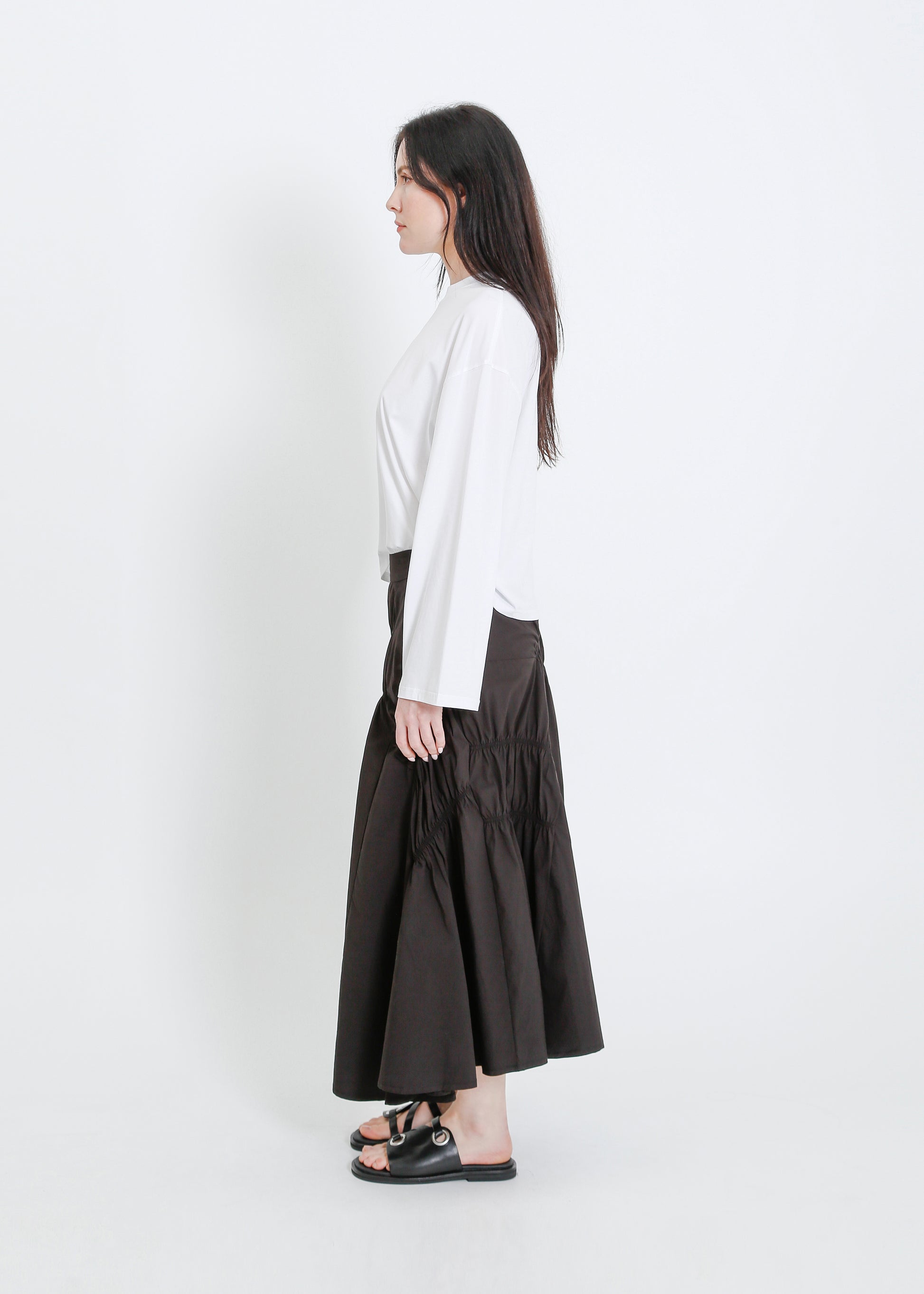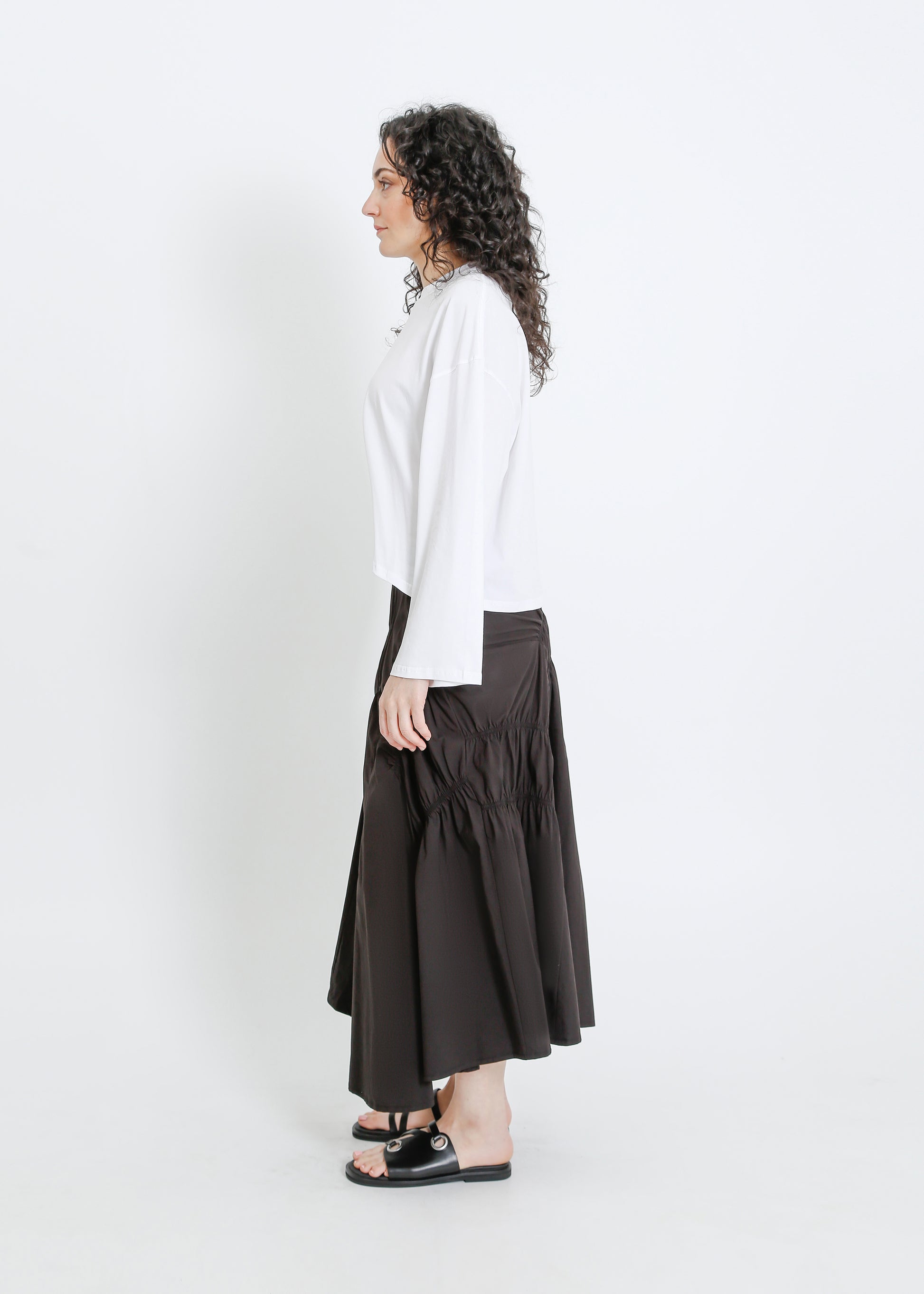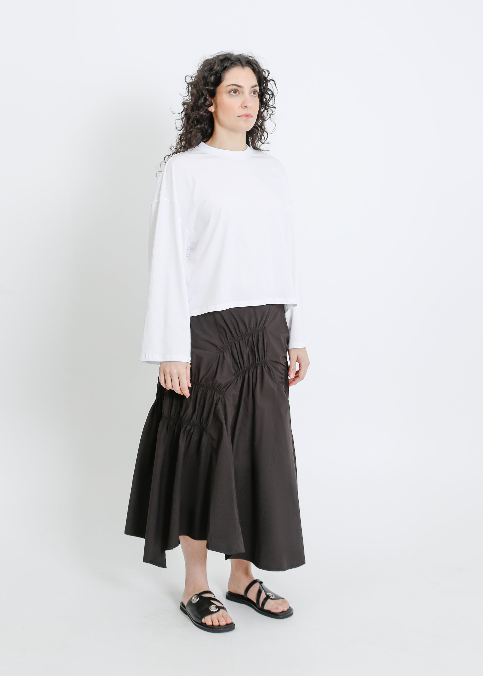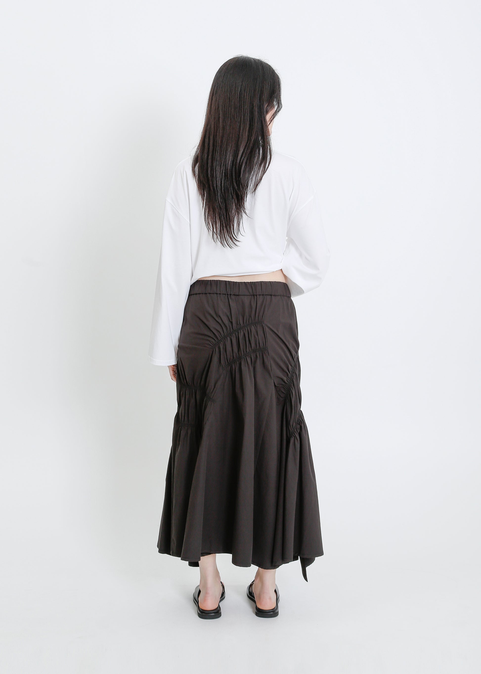 The ALPHA60 Raven Skirt is a modern take on the classic midi skirt, featuring an elasticated waistband for comfort and shirred asymmetric panels throughout for a unique look. The asymmetric hem adds movement and interest, while the side zipper ensures a secure fit. Crafted from 100% cotton, this skirt is both breathable and stylish—perfect for elevating your everyday wardrobe.