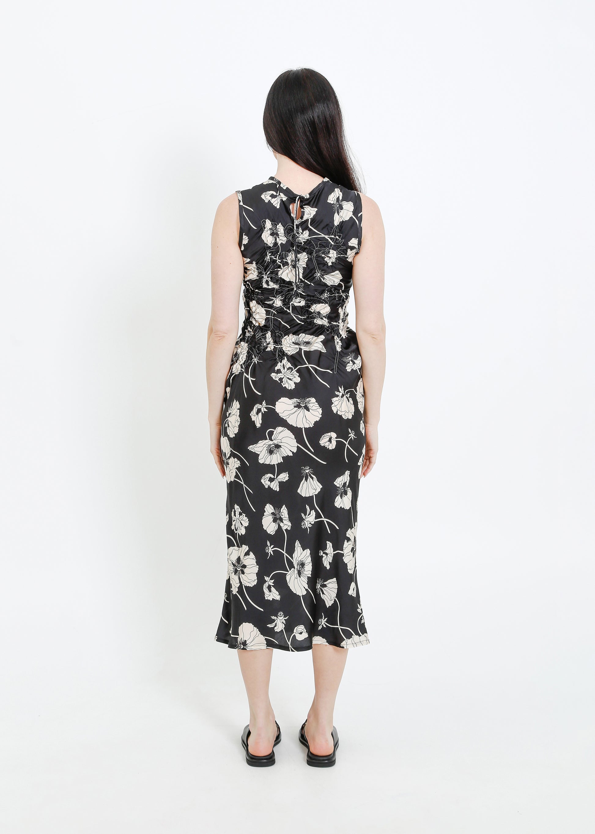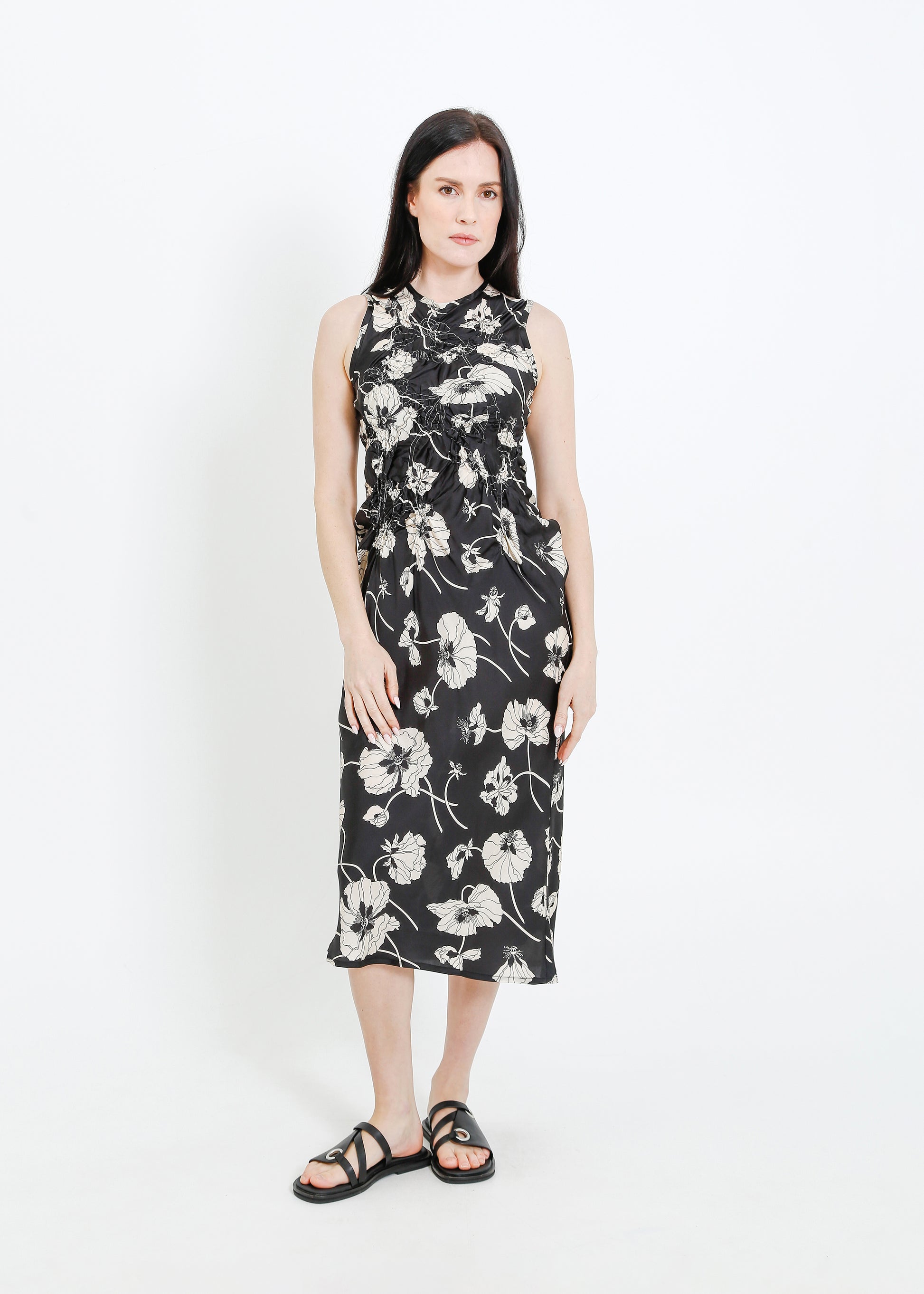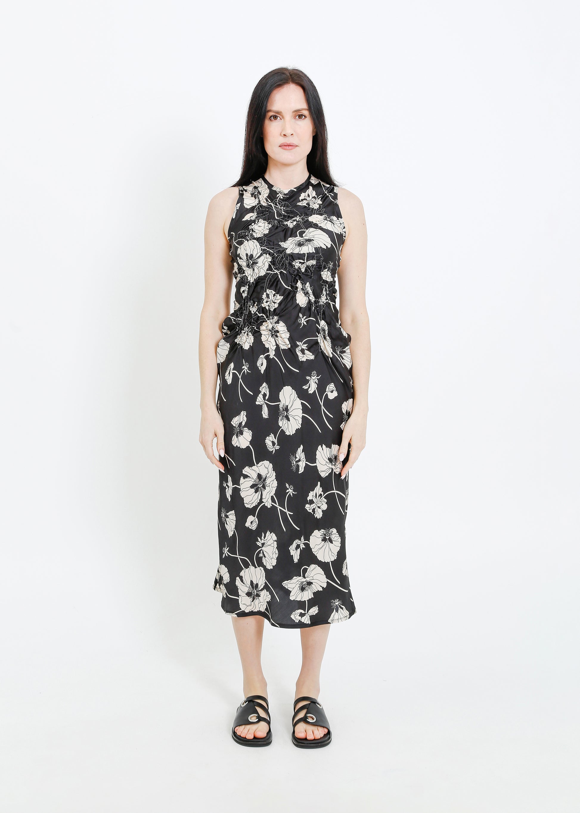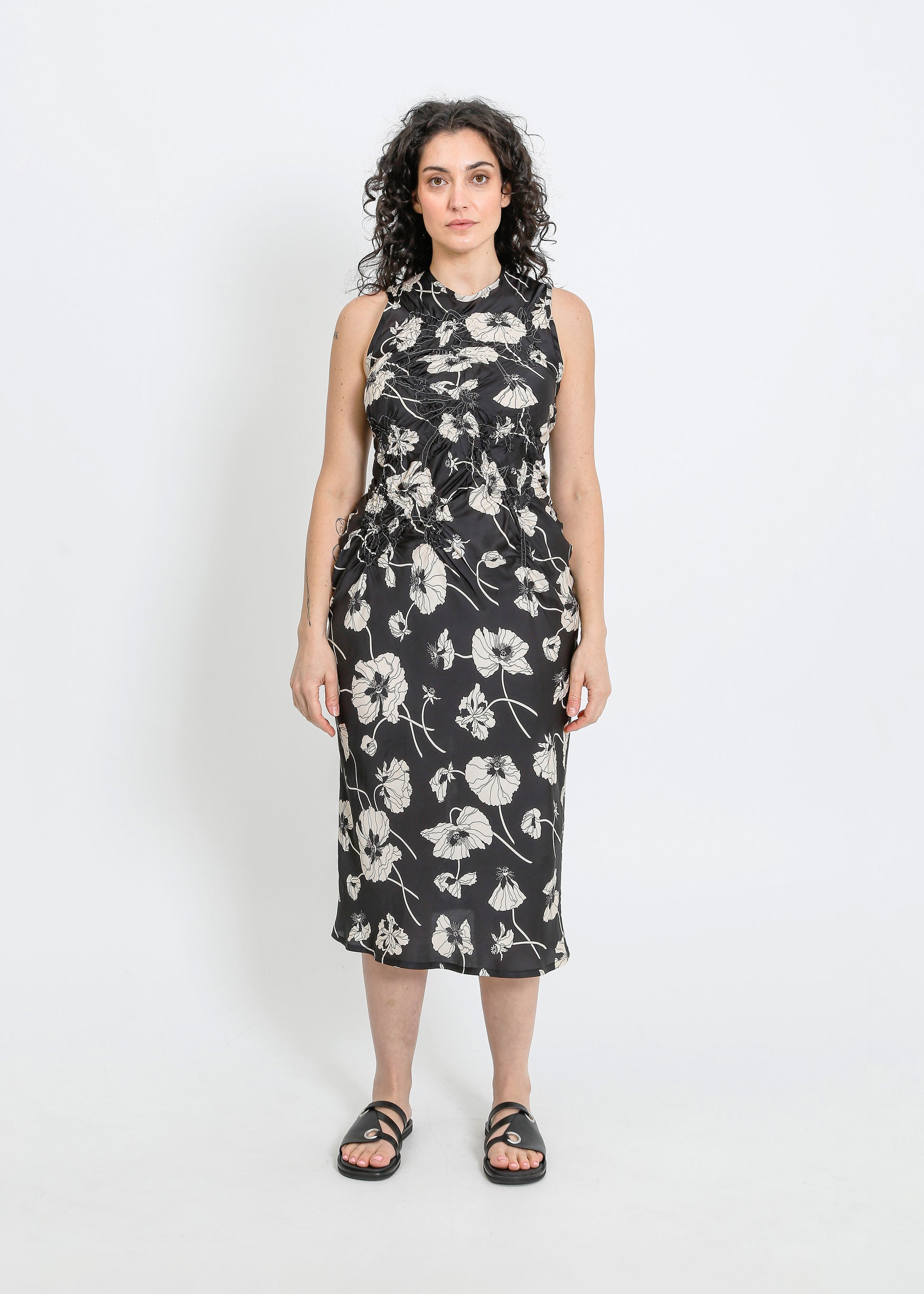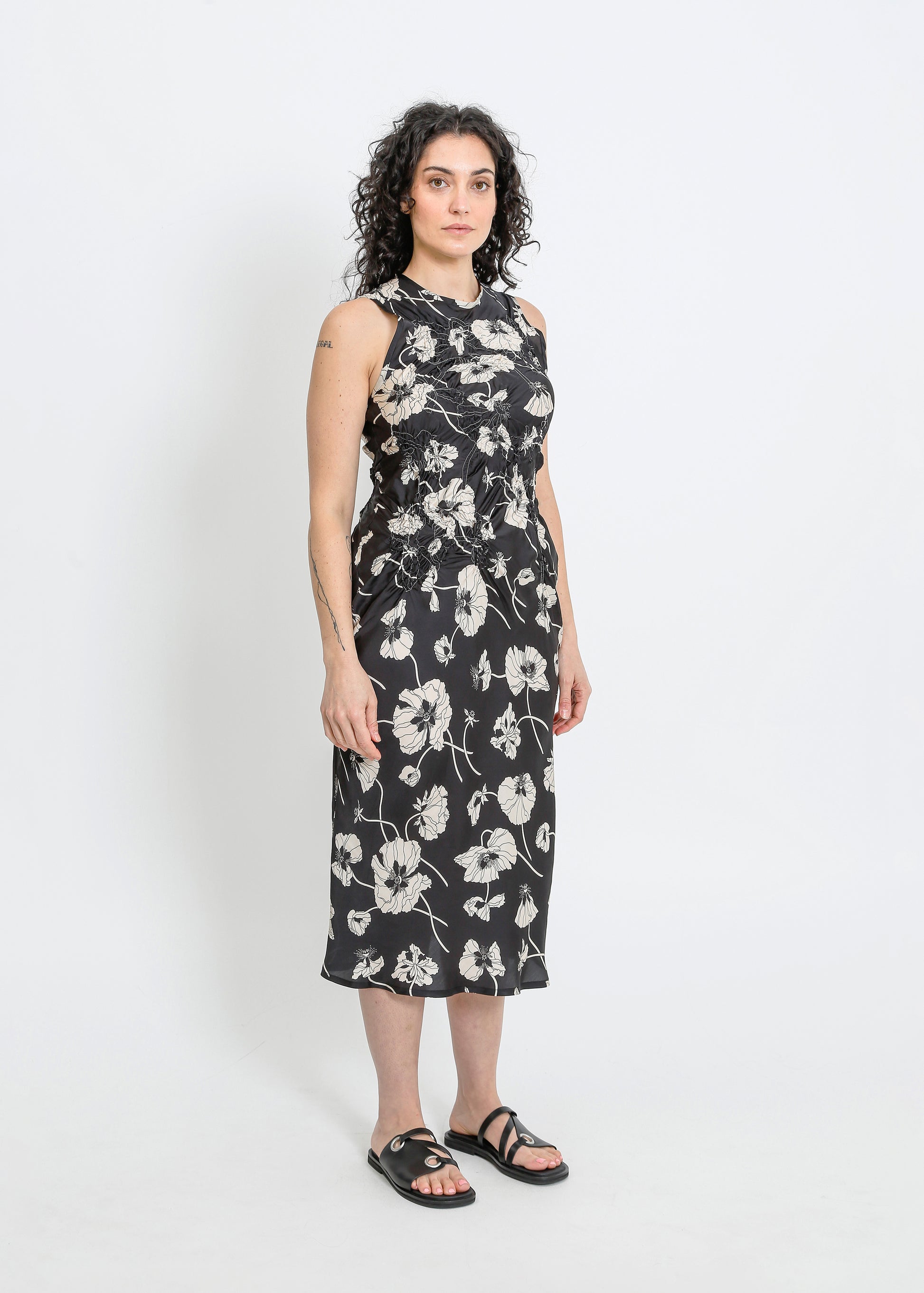 The ALPHA60 Cavalli Dress is a striking party dress crafted in a luxurious Liberty print fabric. Featuring a sleeveless crew neck design and a flattering bias cut, this midi-length dress is adorned with a delicate floral shirring detail on the bodice, making it perfect for special occasions.