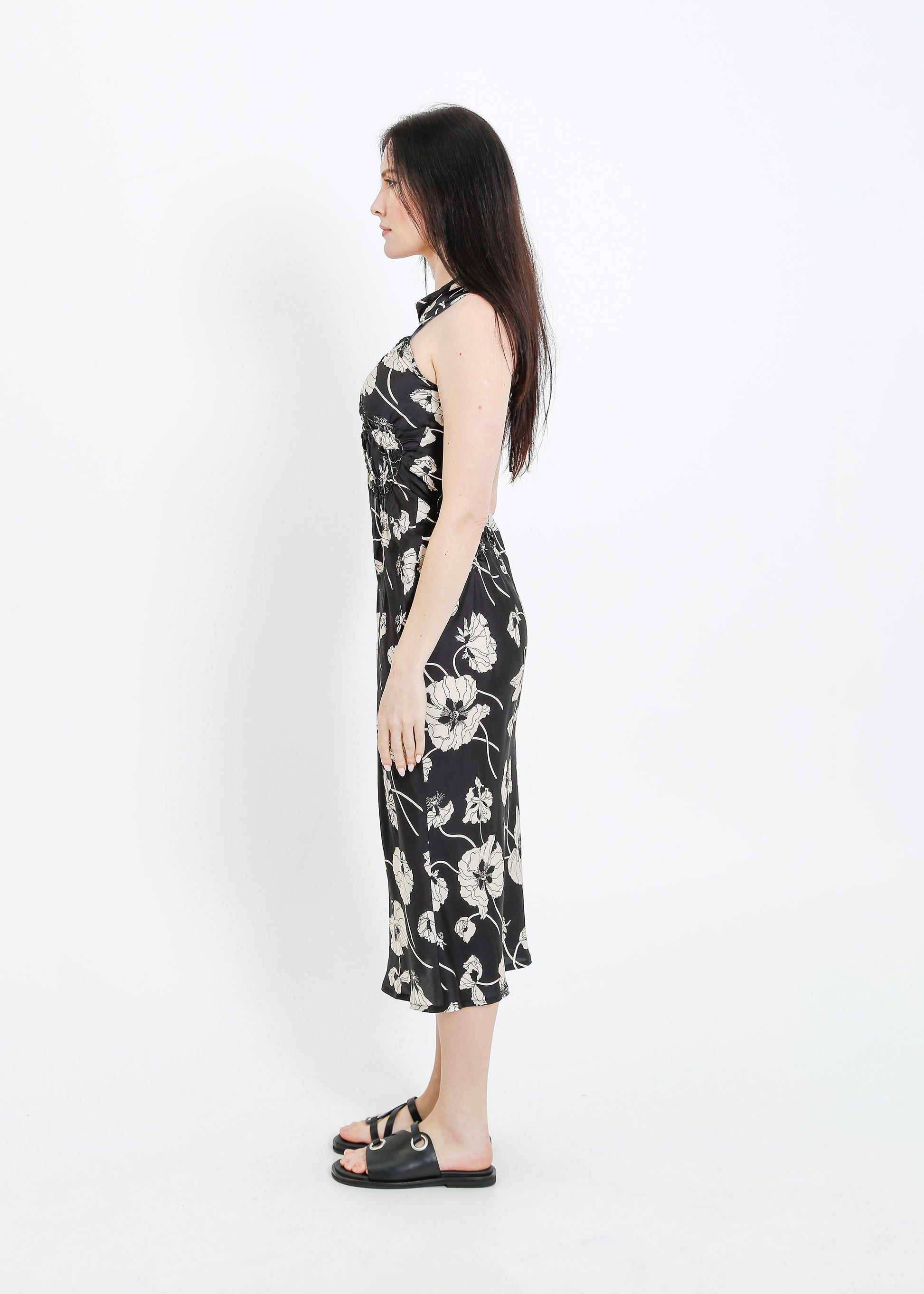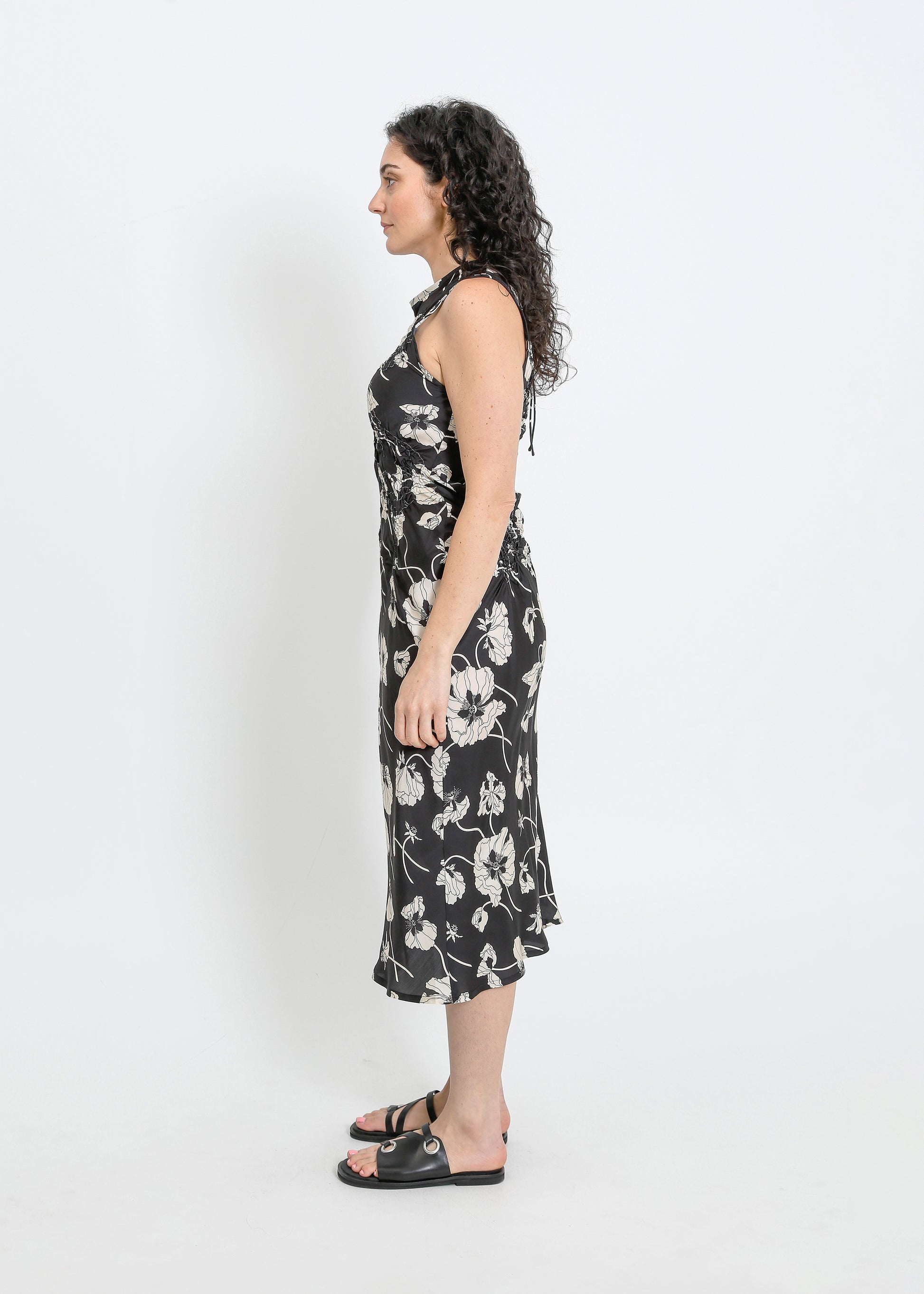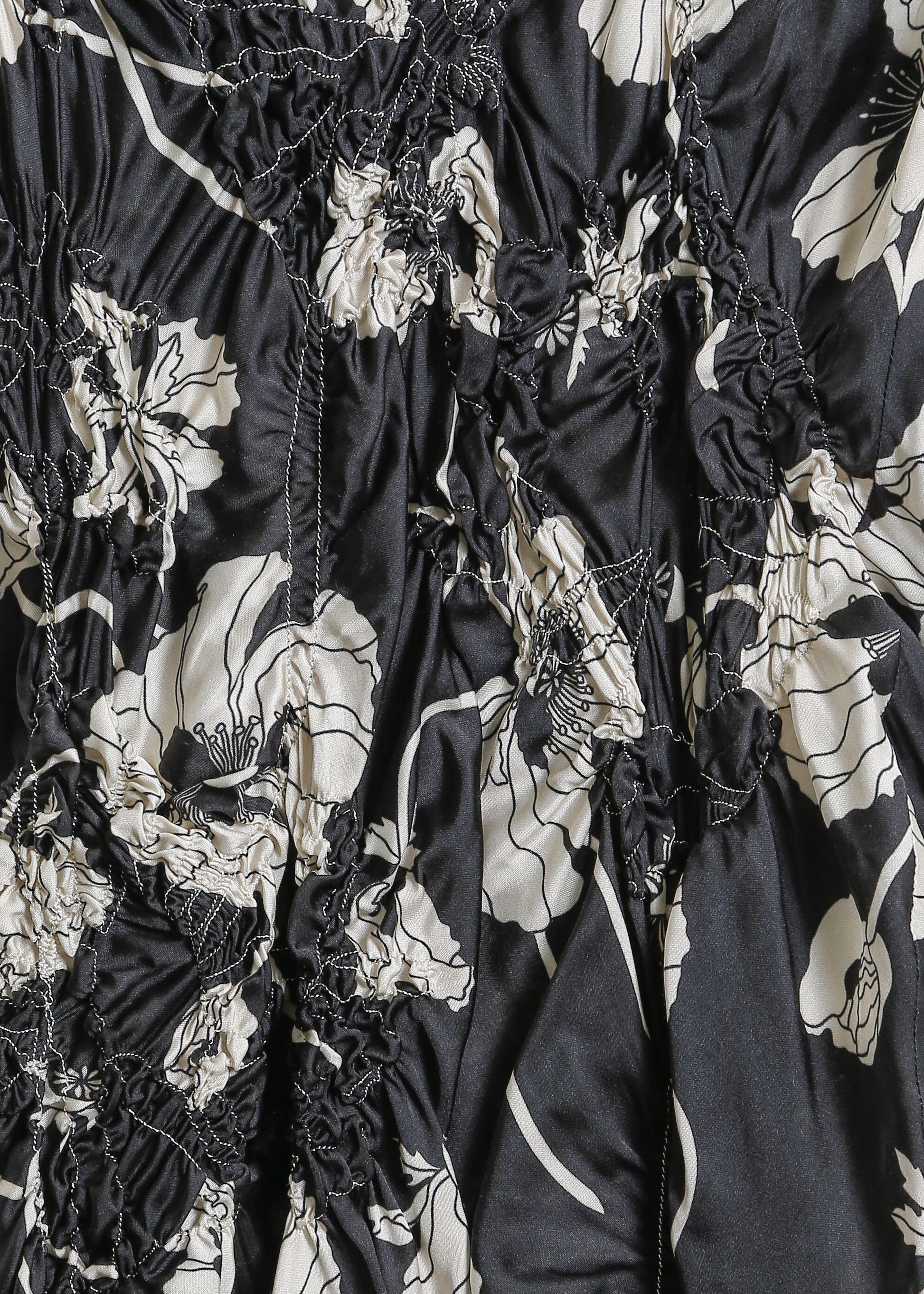 - Floral shirring design on bodice.