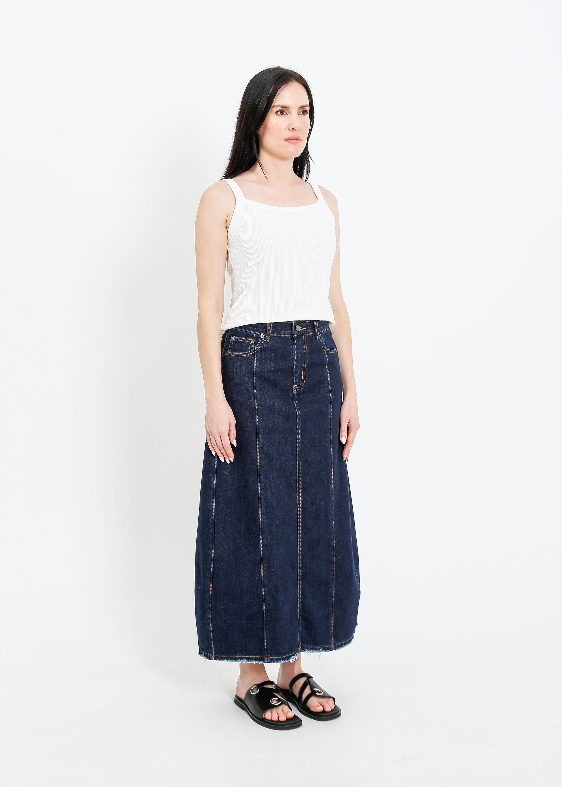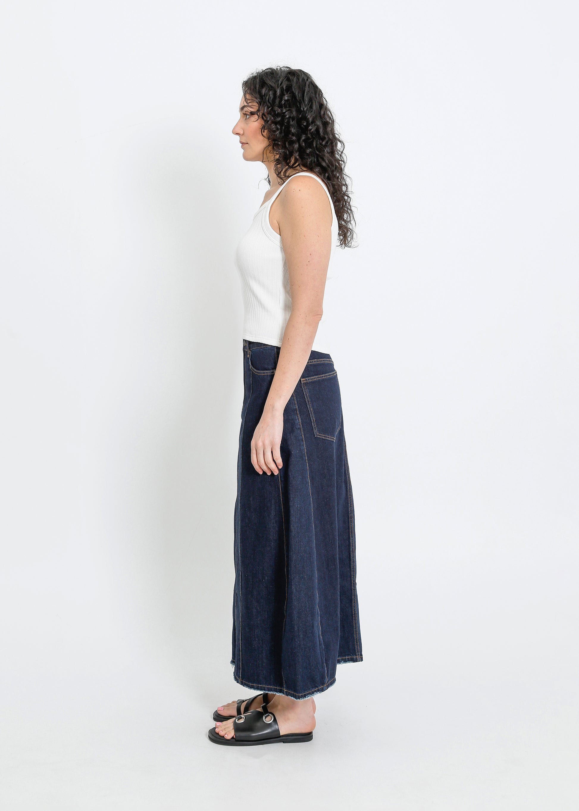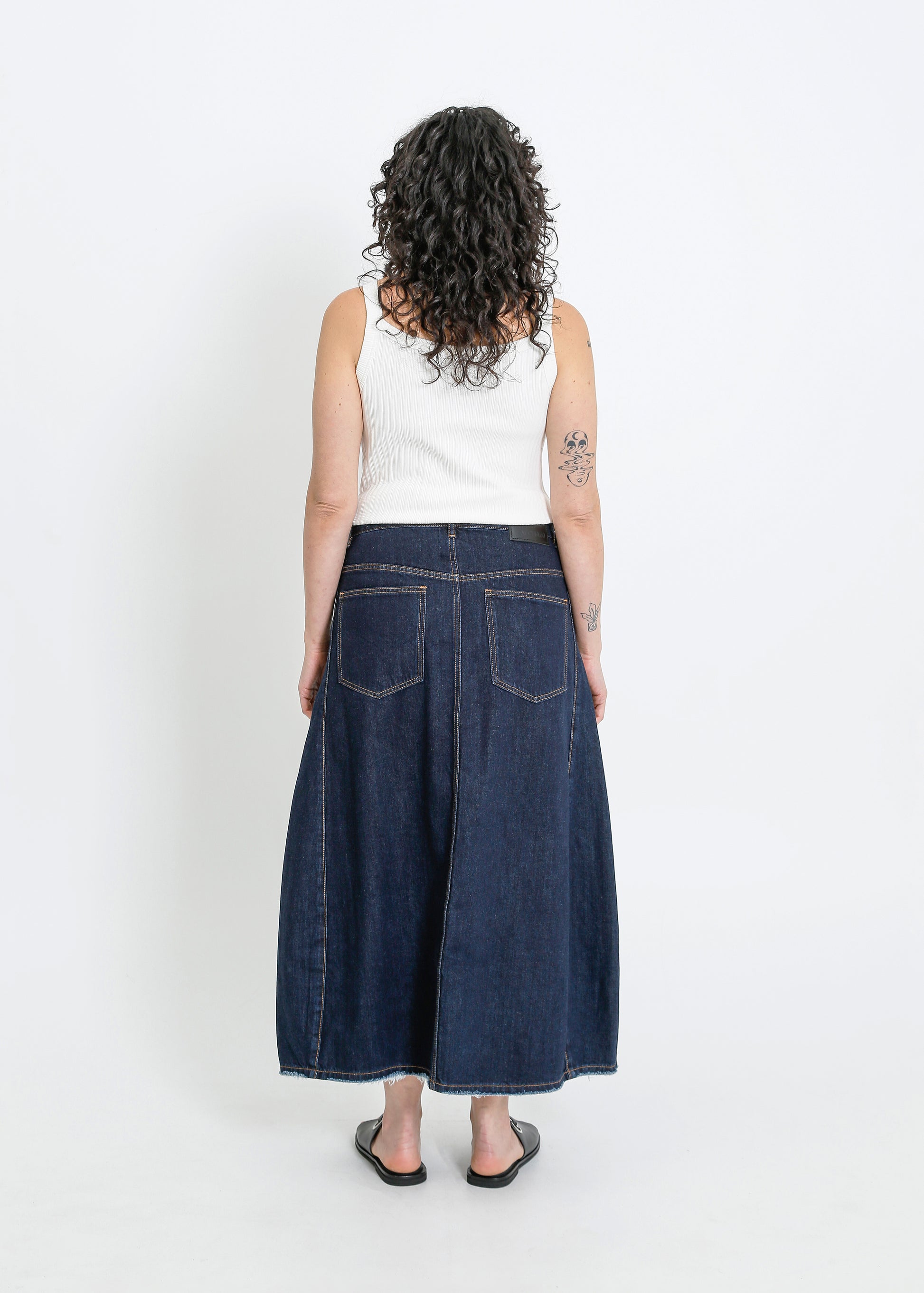 The ALPHA60 Jonah Denim Skirt is a classic denim 5-pocket midi skirt, crafted in rigid indigo cotton denim. Featuring asymmetric raw hems at the front and side panels, this skirt offers a modern twist on a timeless silhouette. Perfect for everyday wear, it pairs effortlessly with your favourite tops and knits.