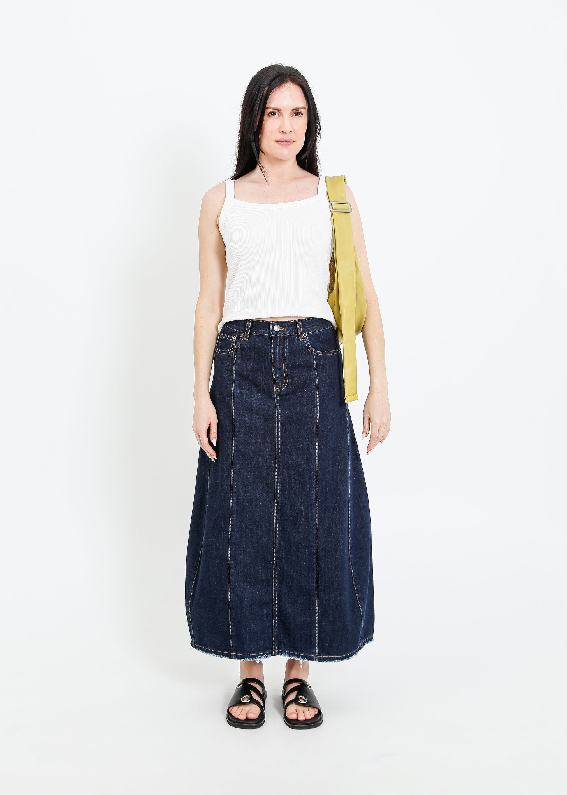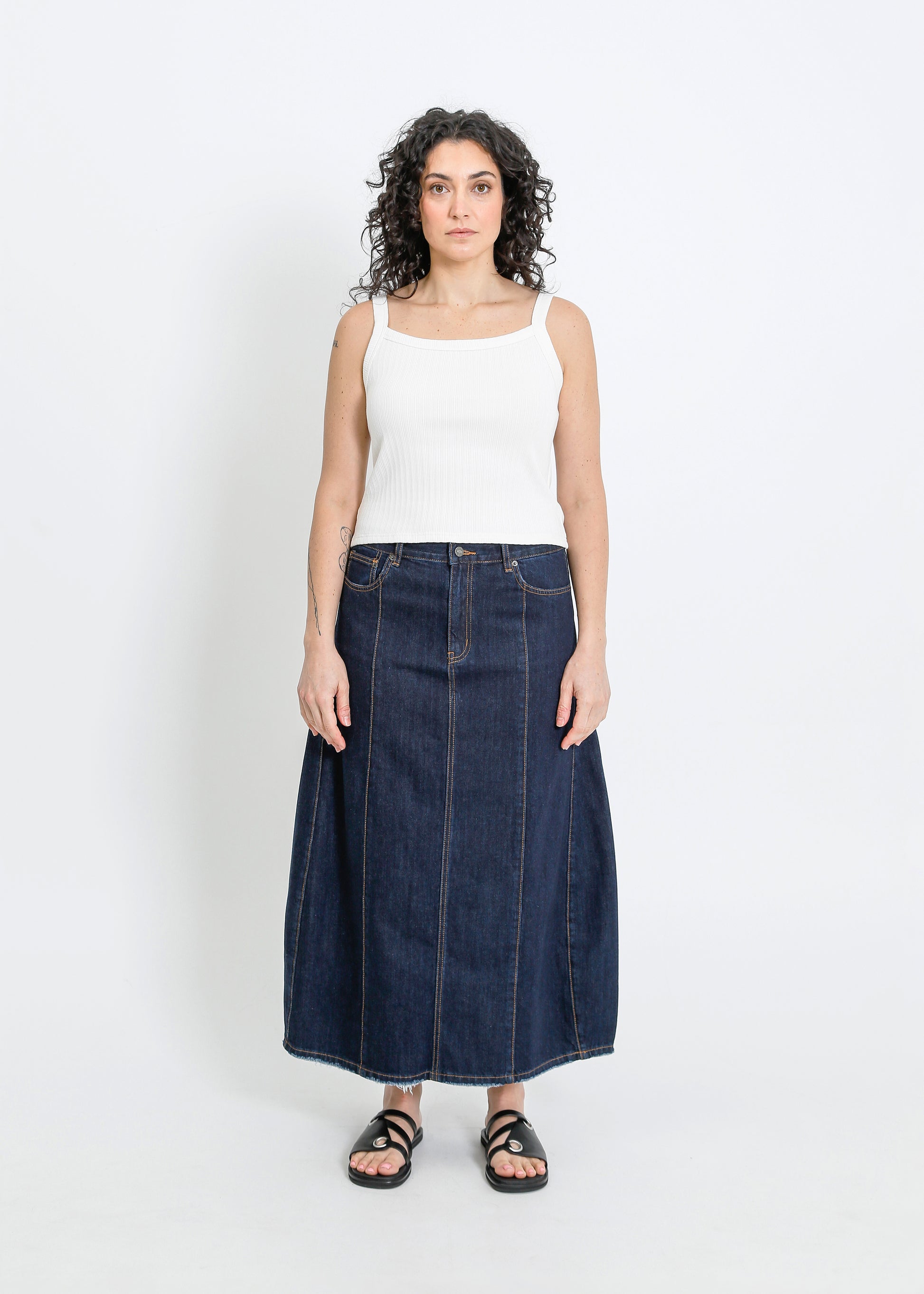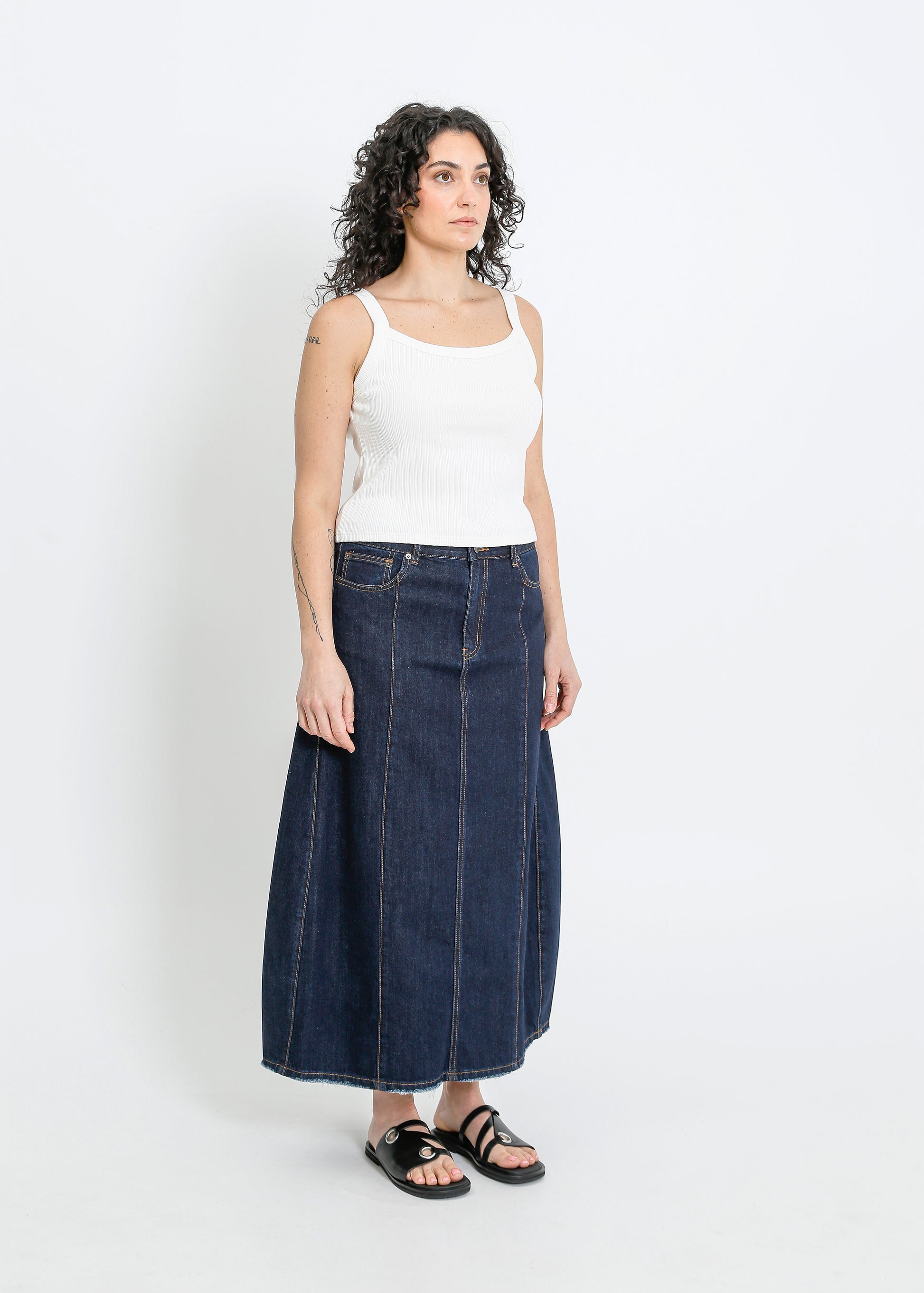 The ALPHA60 Jonah Denim Skirt is a classic denim 5-pocket midi skirt, crafted in rigid indigo cotton denim. Featuring asymmetric raw hems at the front and side panels, this skirt offers a modern twist on a timeless silhouette. Perfect for everyday wear, it pairs effortlessly with your favourite tops and knits.