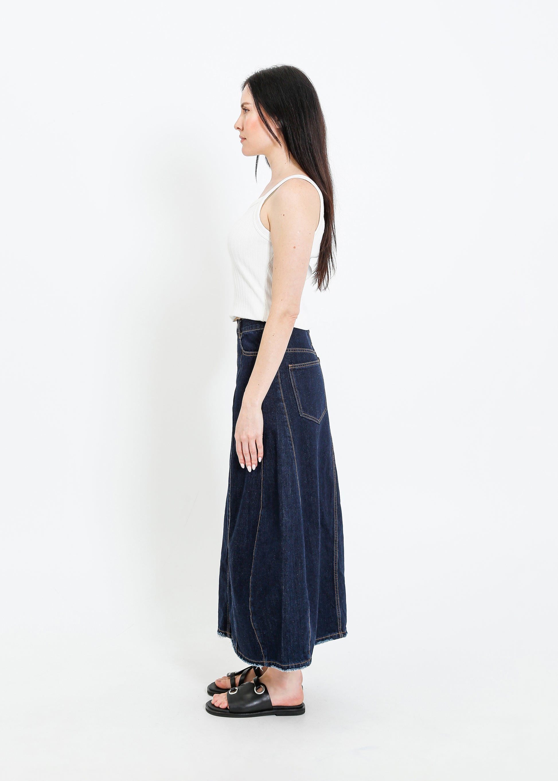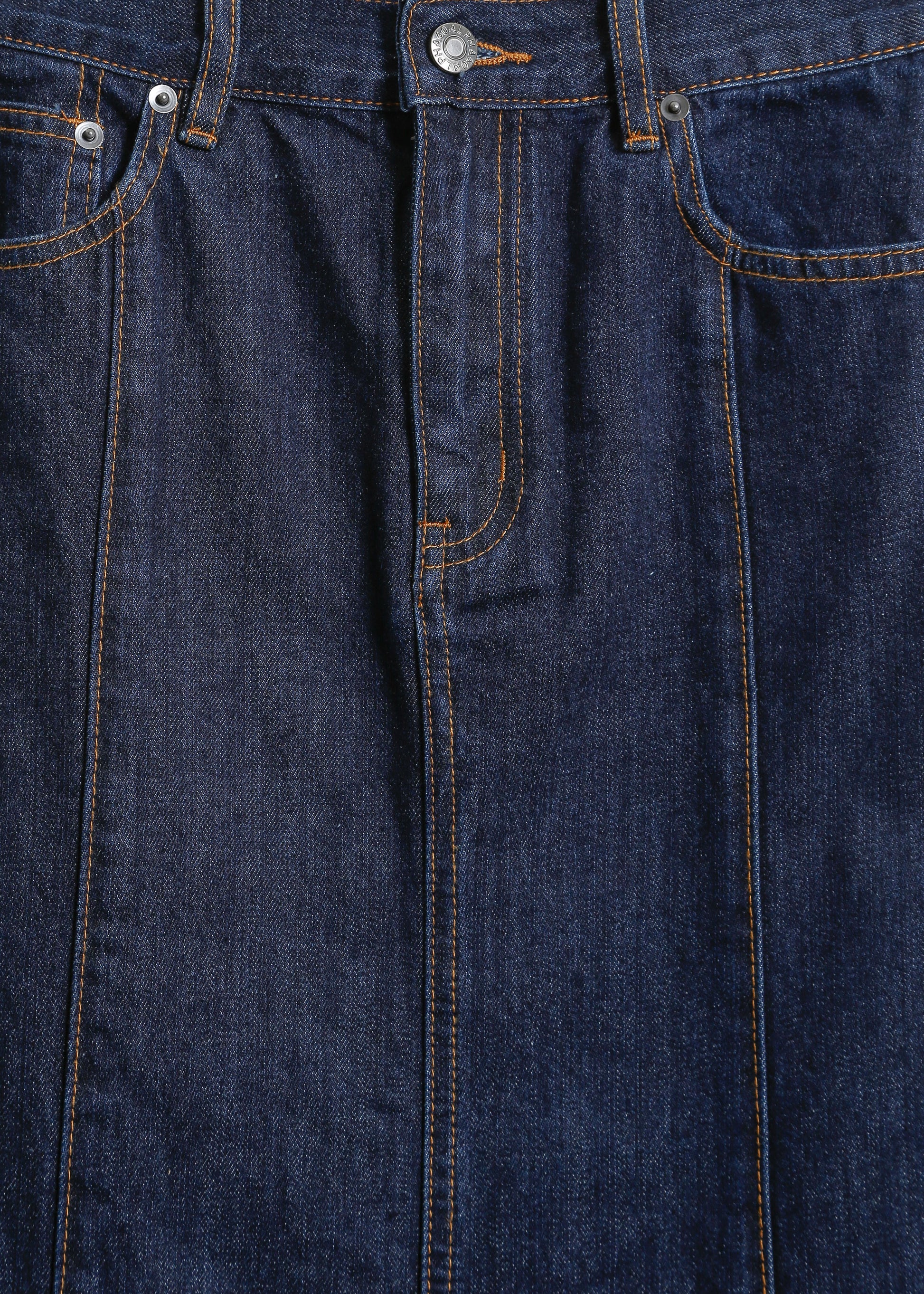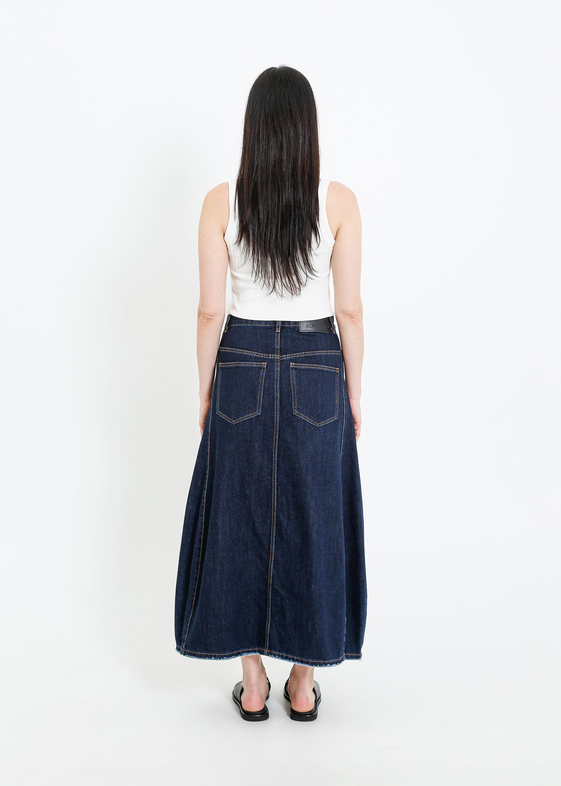 The ALPHA60 Jonah Denim Skirt is a classic denim 5-pocket midi skirt, crafted in rigid indigo cotton denim. Featuring asymmetric raw hems at the front and side panels, this skirt offers a mo...