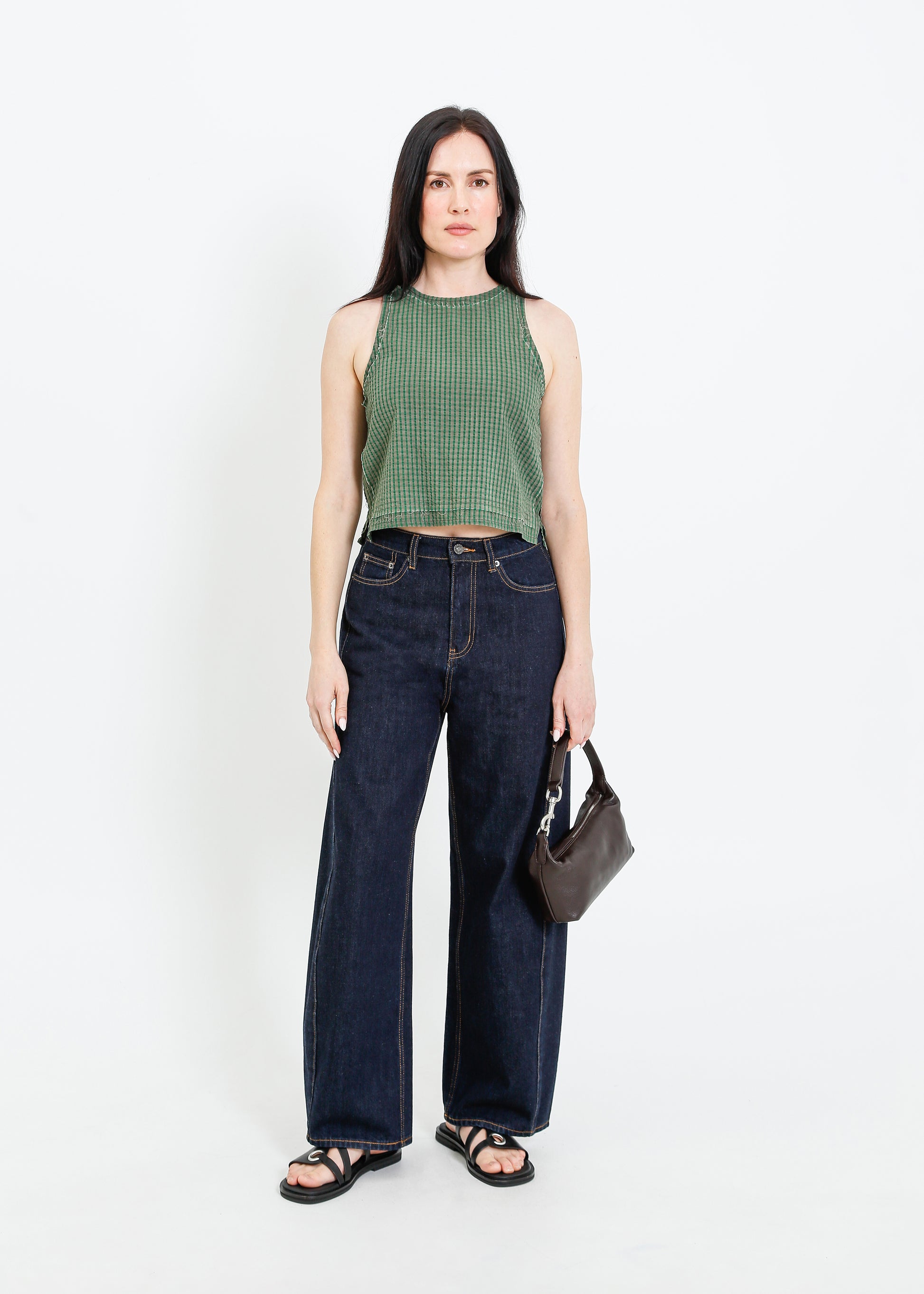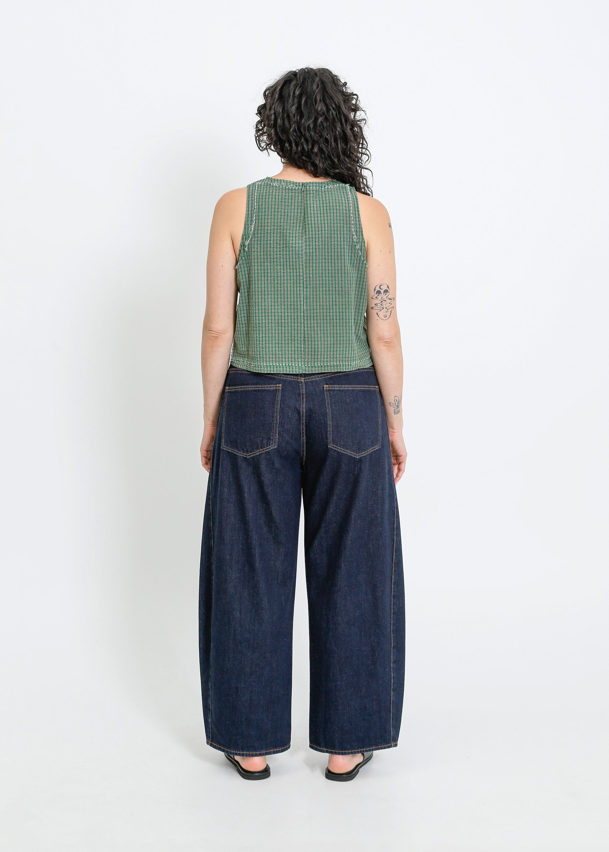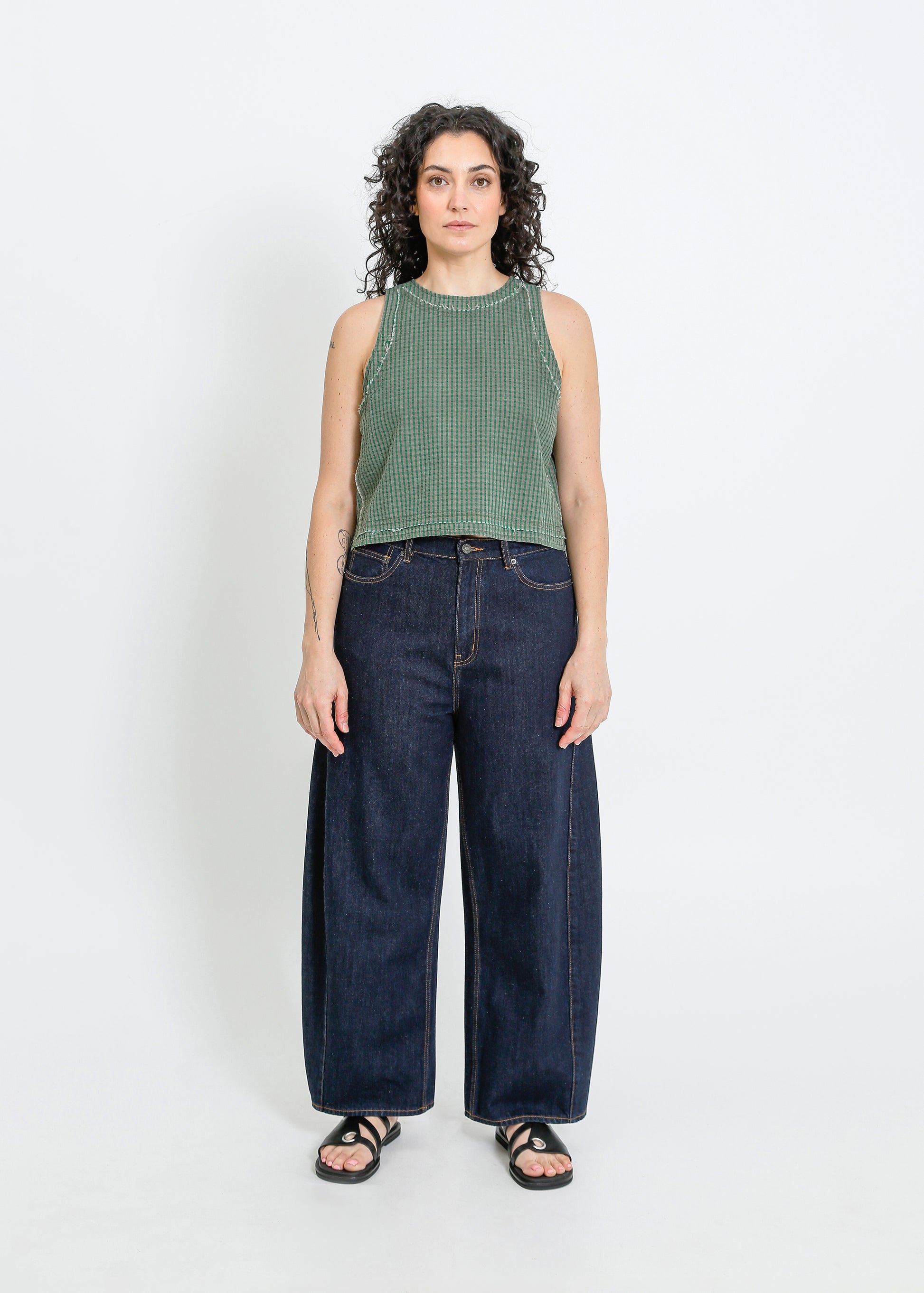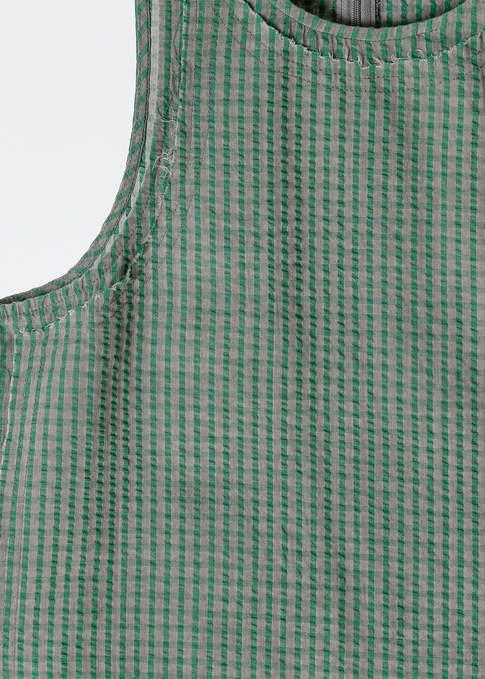 The ALPHA60 Leslie Top is a modern sleeveless crew neck crafted in a lightweight seersucker check fabric. Featuring front and back outline patch detail, the seams are intentionally frayed from wash, and the garment is designed to fray more with wear, adding unique character over time. The cropped length and boxy fit make it a versatile piece for layering or wearing on its own.