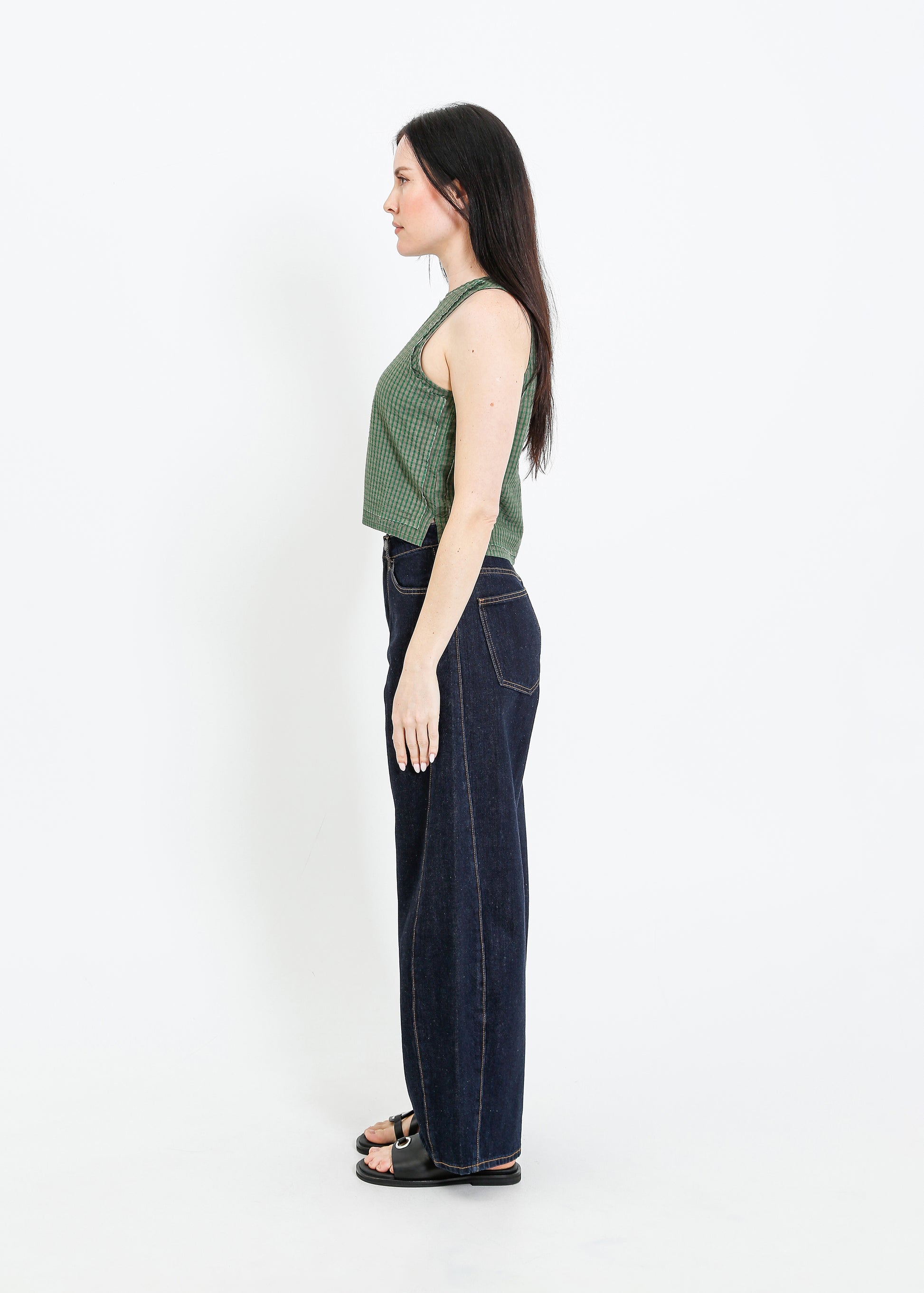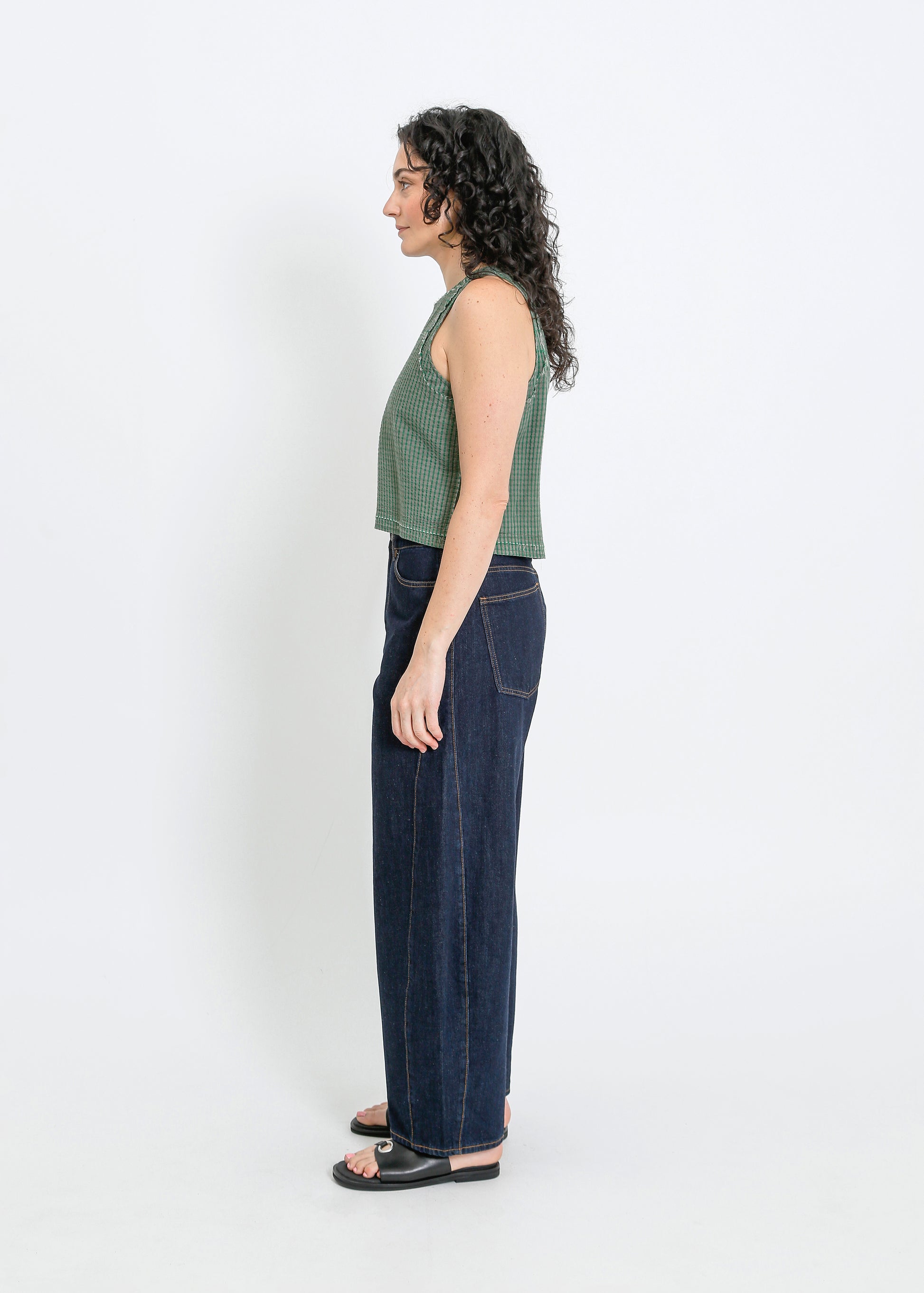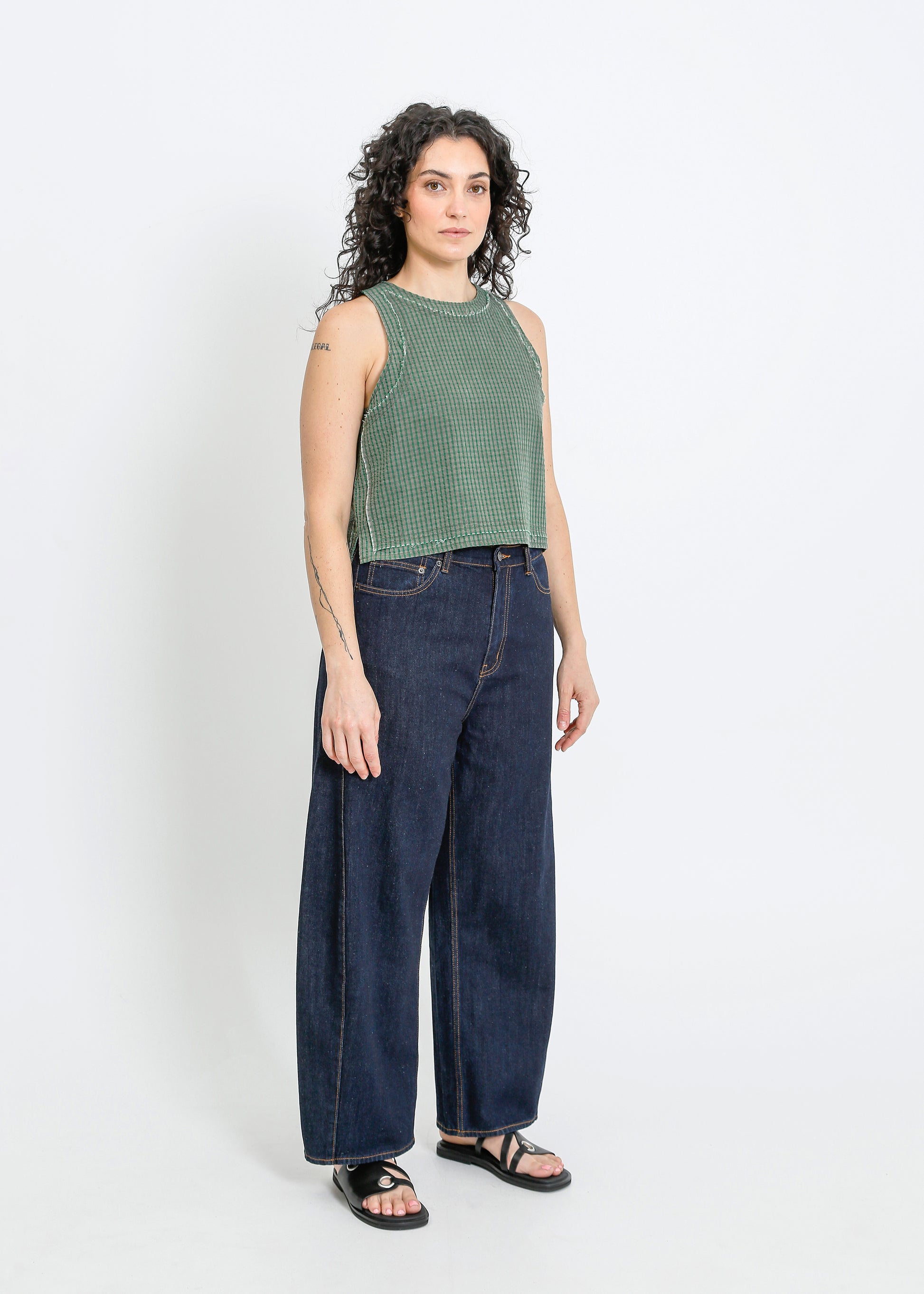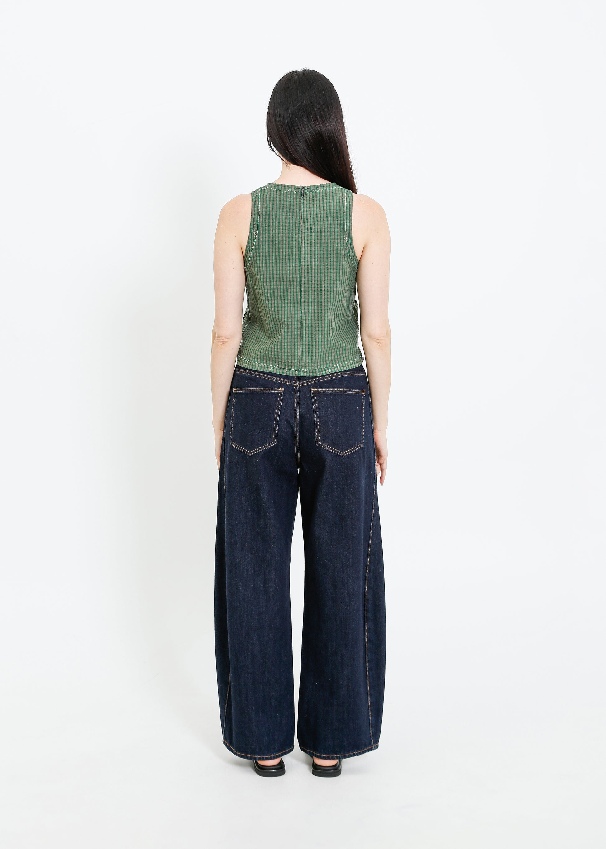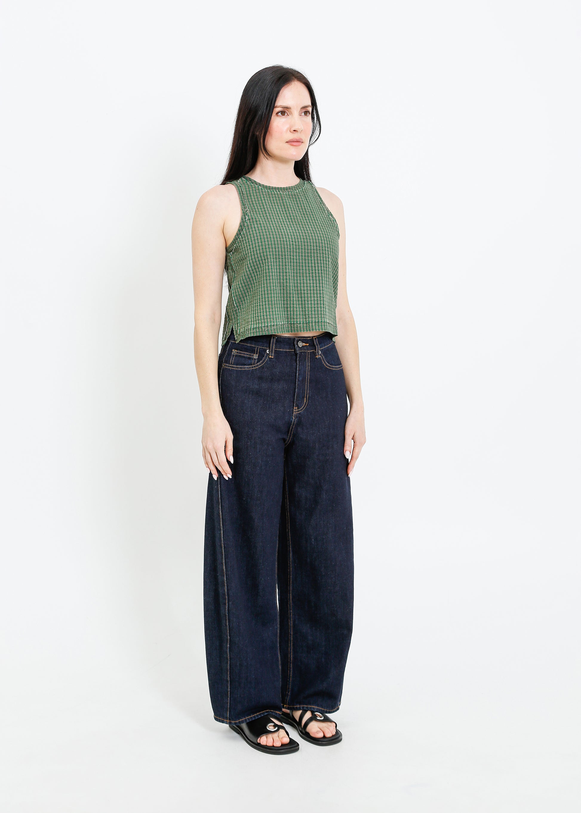The ALPHA60 Leslie Top is a modern sleeveless crew neck crafted in a lightweight seersucker check fabric. Featuring front and back outline patch detail, the seams are intentionally frayed from wash, and the garment is designed to fray more with wear, adding unique character over time. The cropped length and boxy fit make it a versatile piece for layering or wearing on its own.