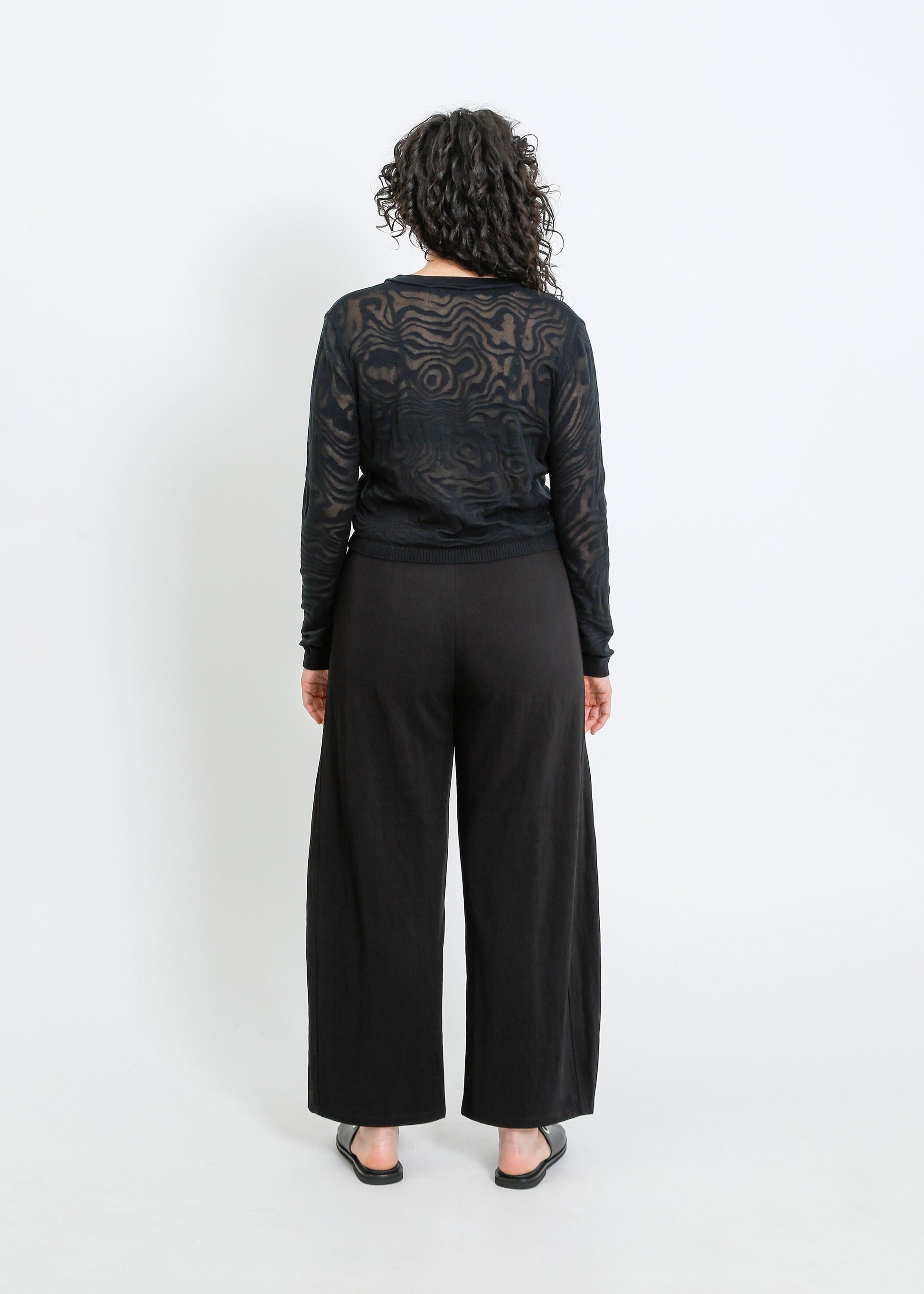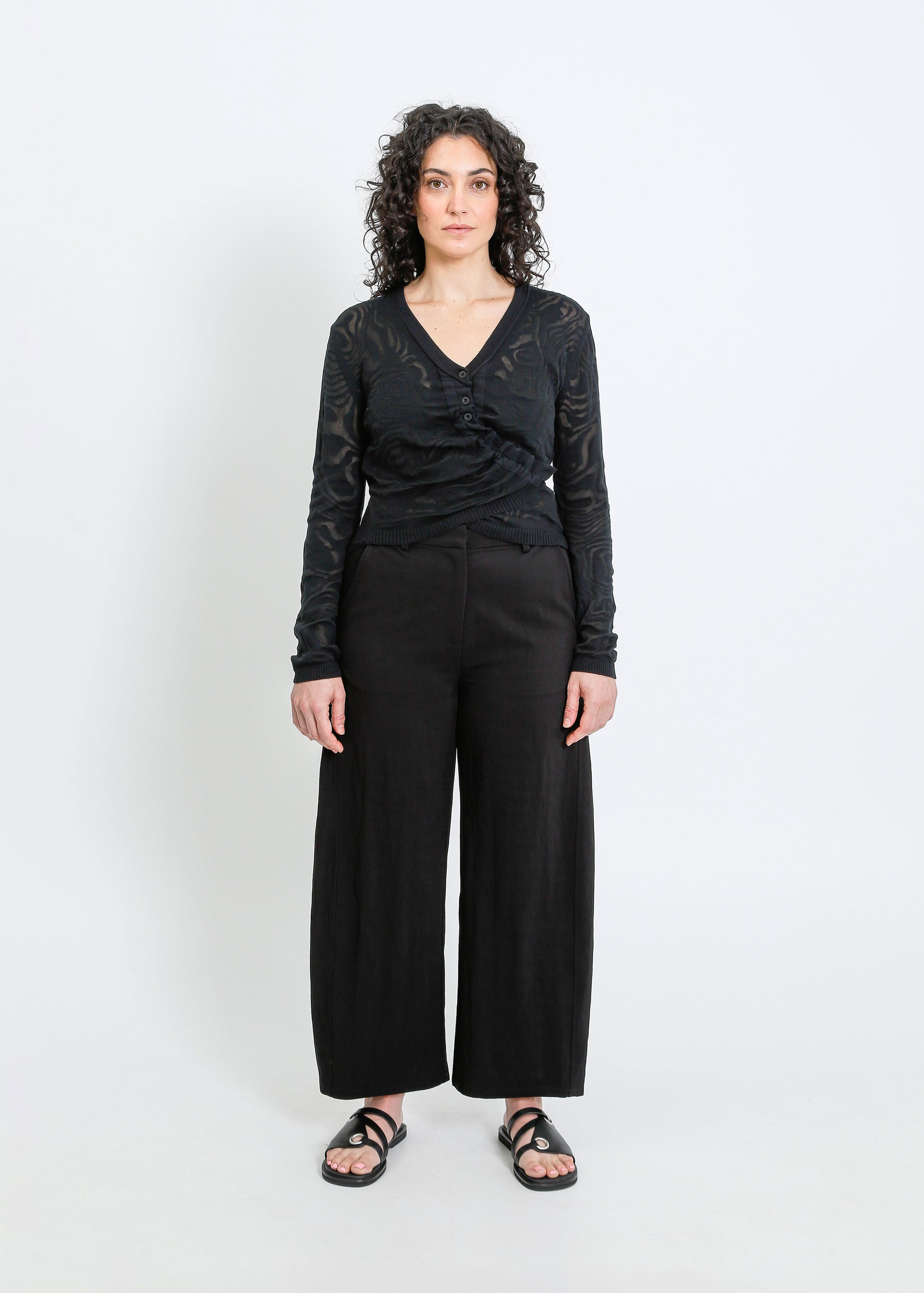 The ALPHA60 Magnolia Cardin is a versatile long sleeve V-neck top crafted for effortless style. Designed to be wrapped in different ways, this piece features a functional channel at the centre front with ties, allowing you to create a ruched wrap look. The small hole in the side seam lets the ties wrap around the body for a custom fit, making it a unique and adaptable addition to your wardrobe.