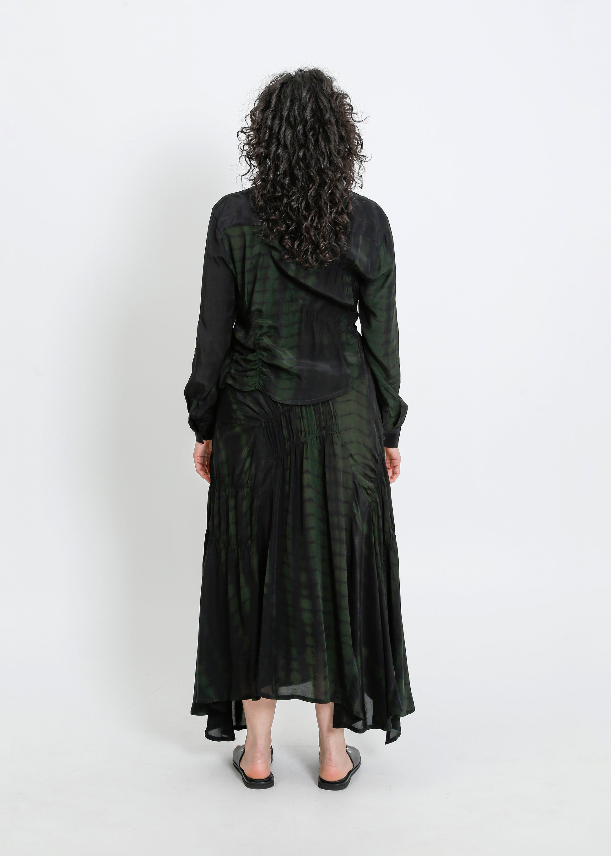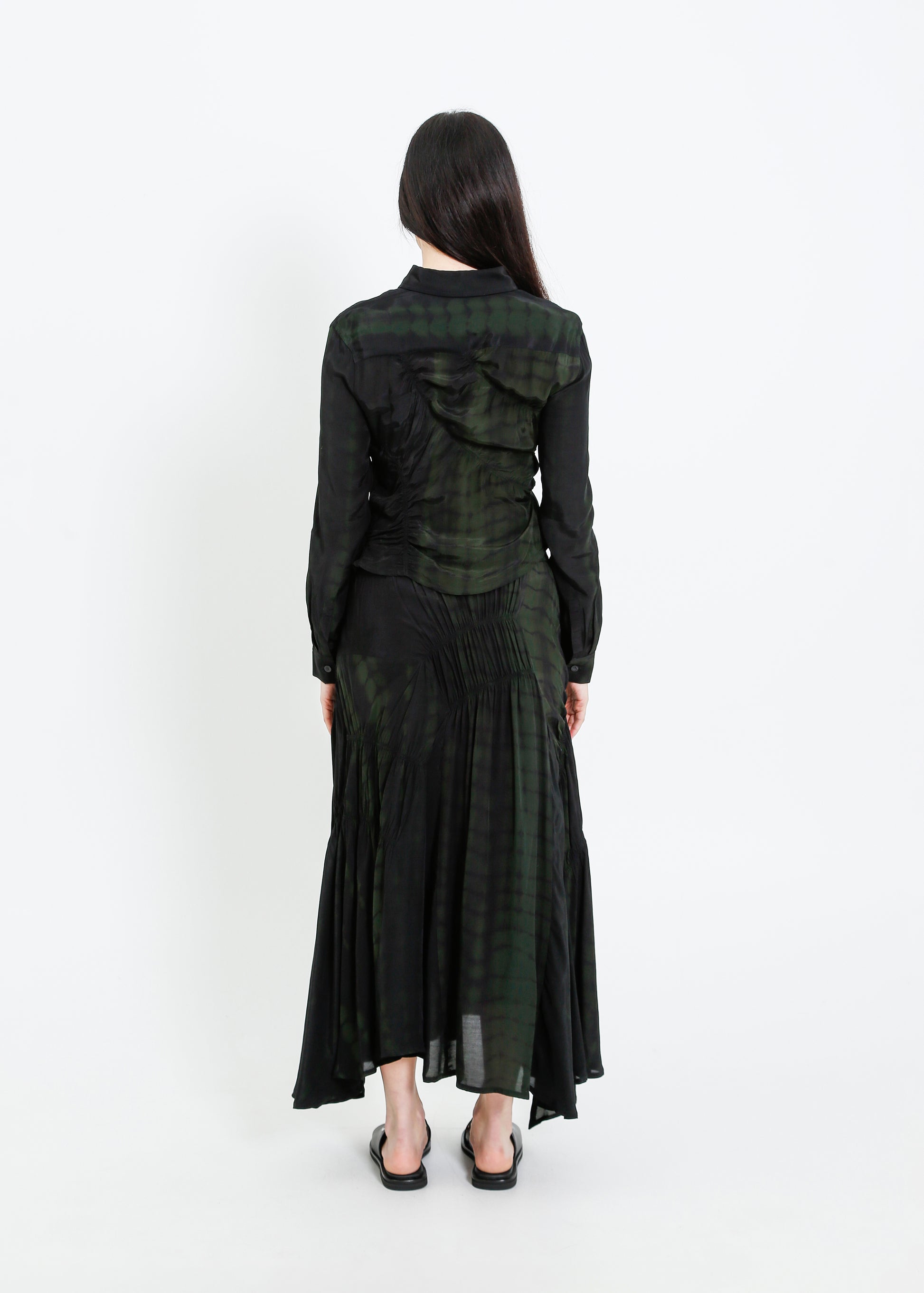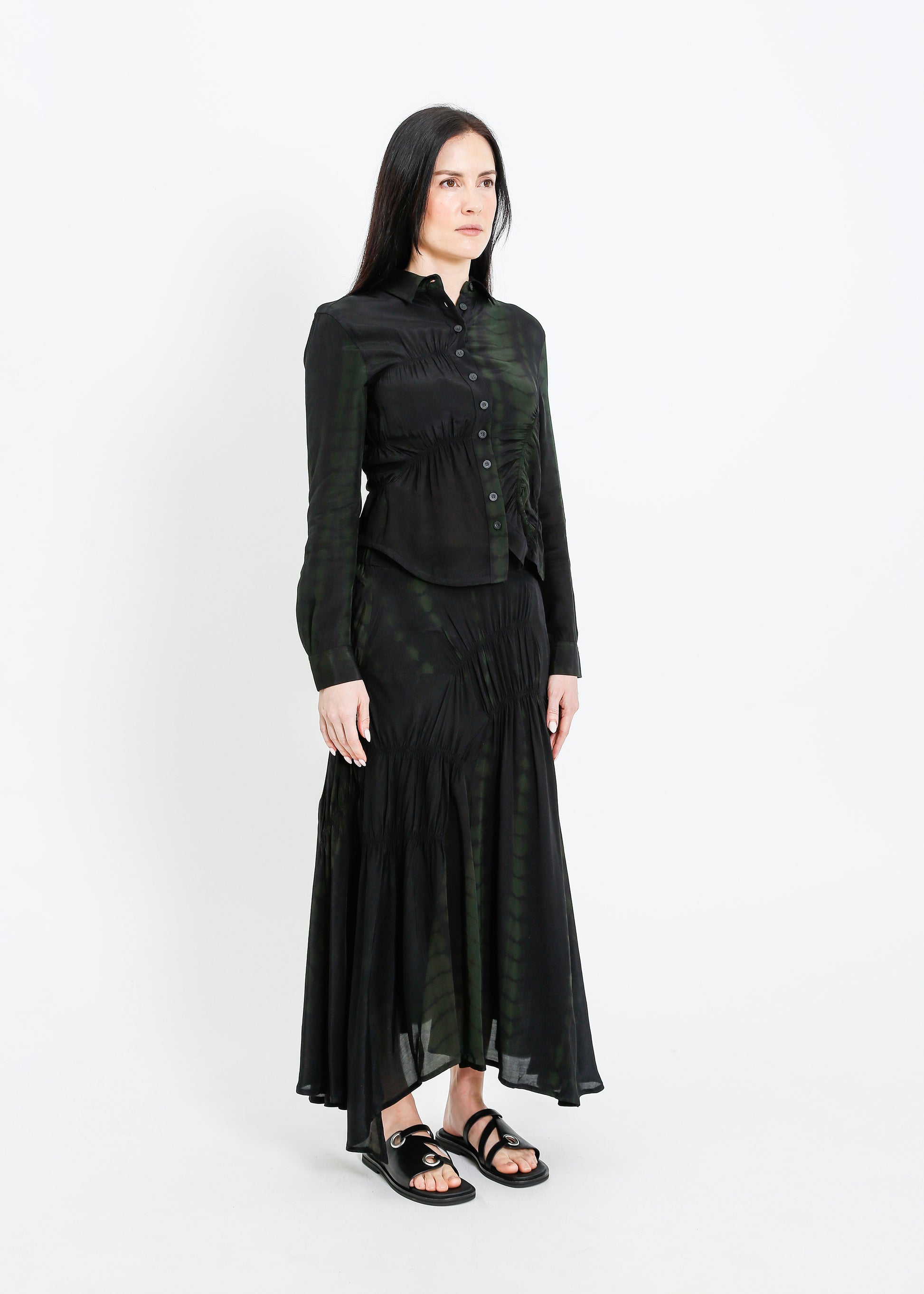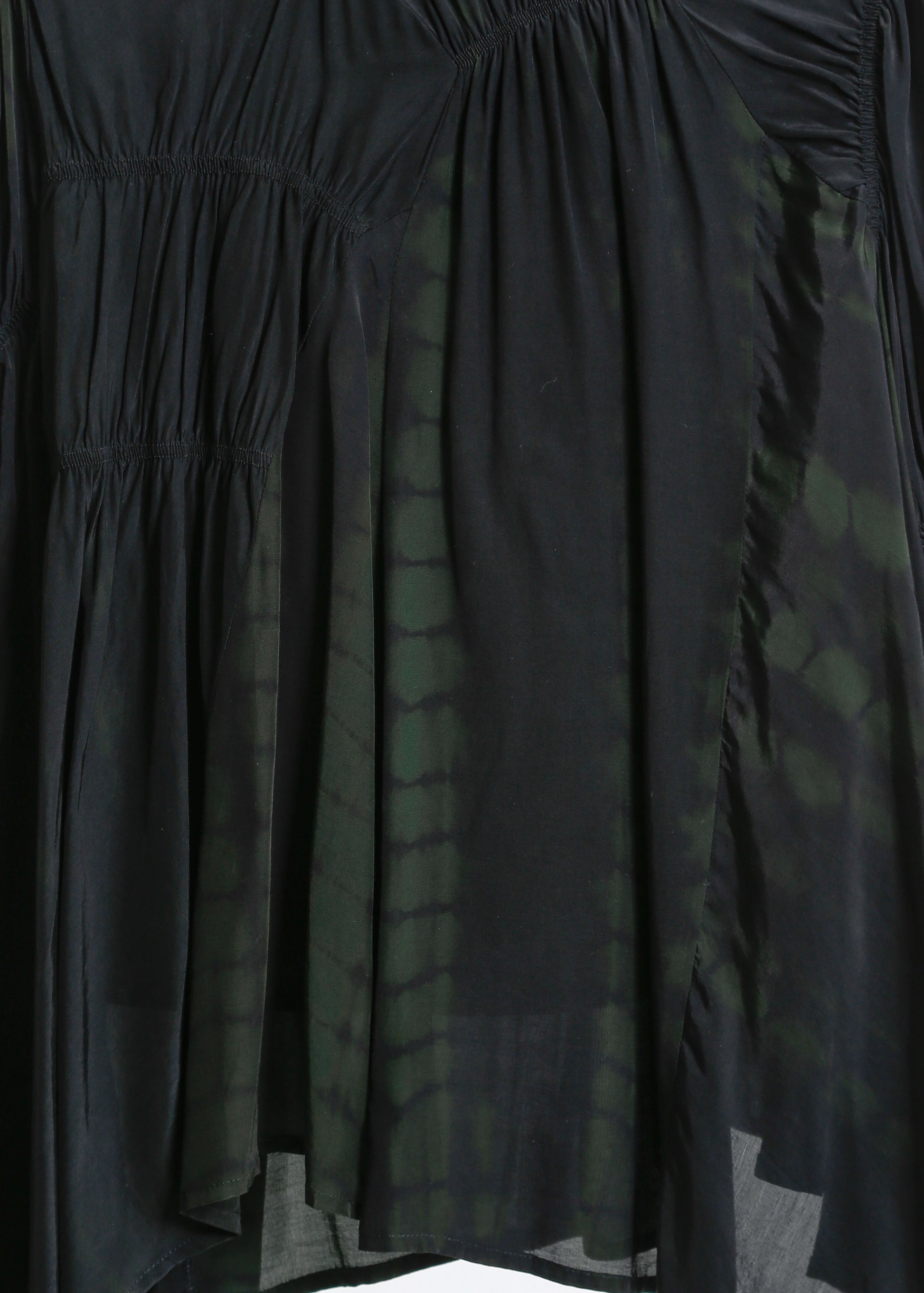 - Shirred asymmetric panels throughout.