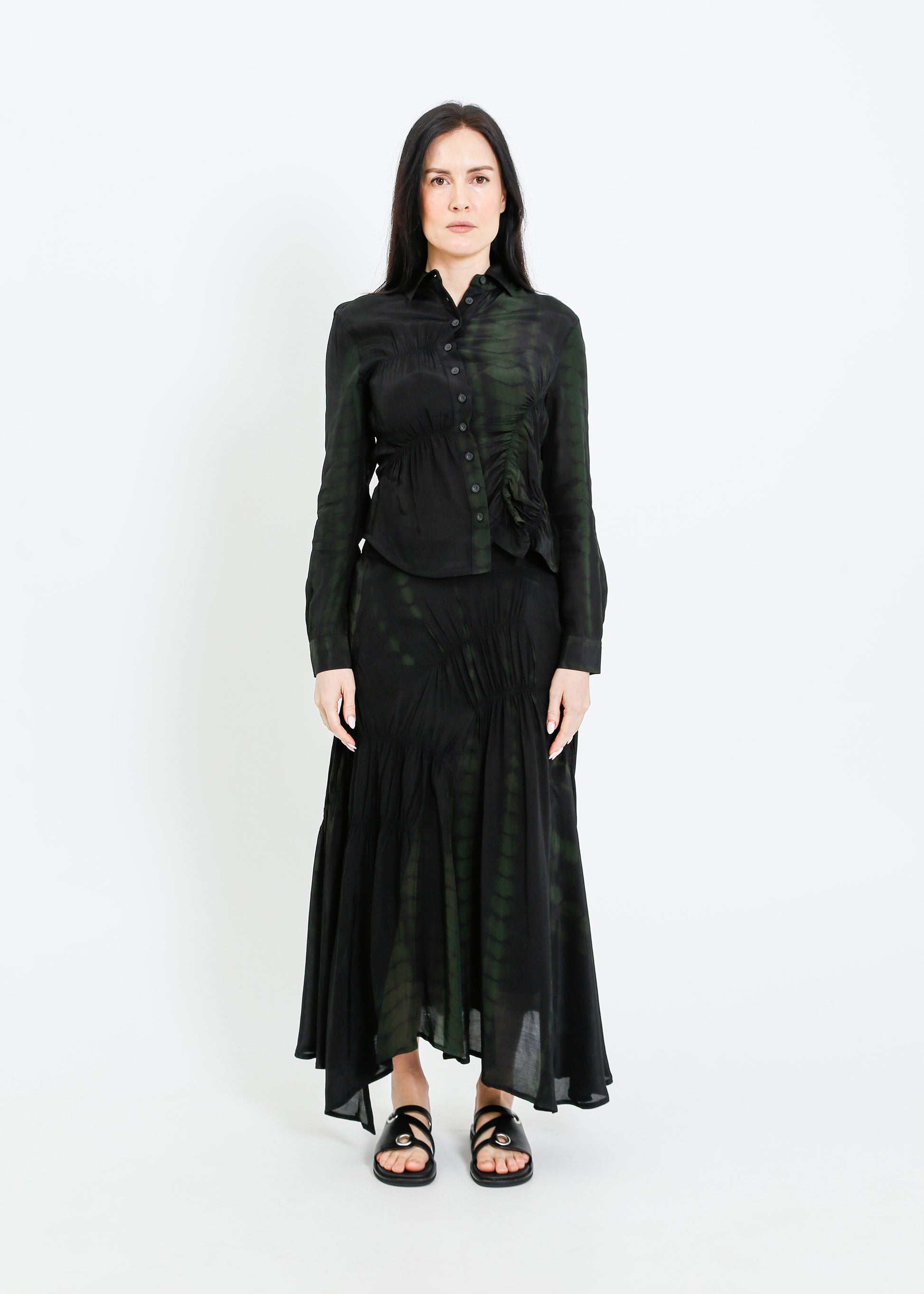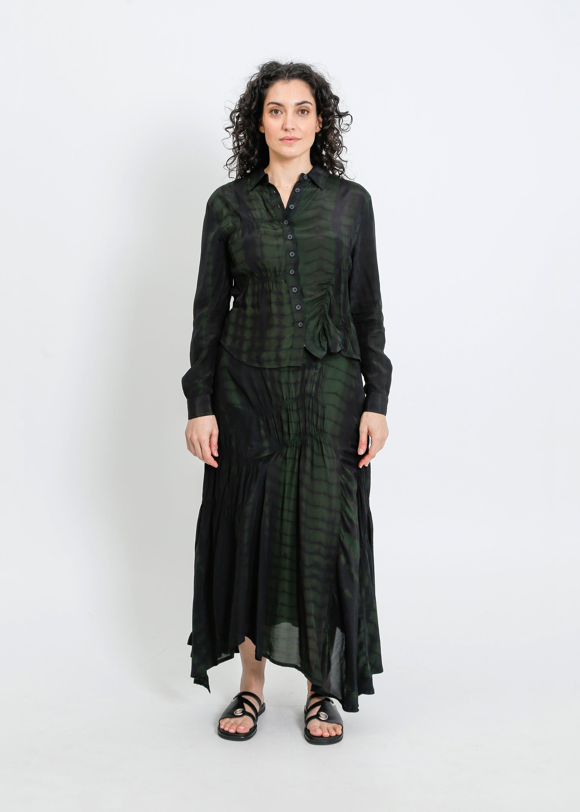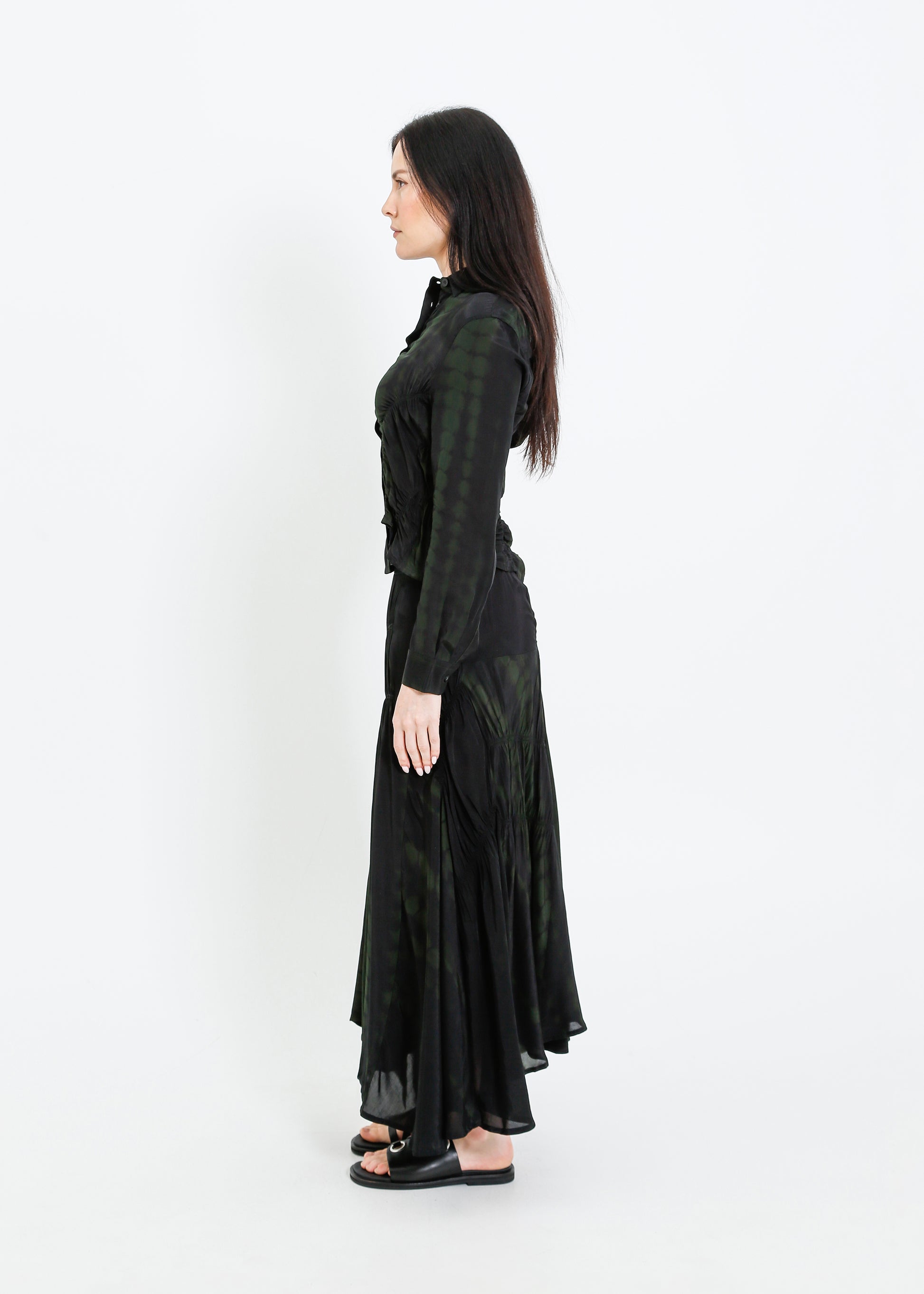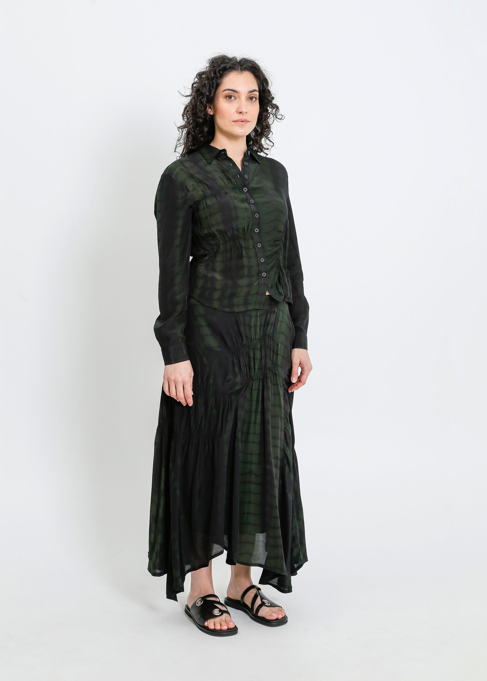 - Shirred asymmetric panels throughout.